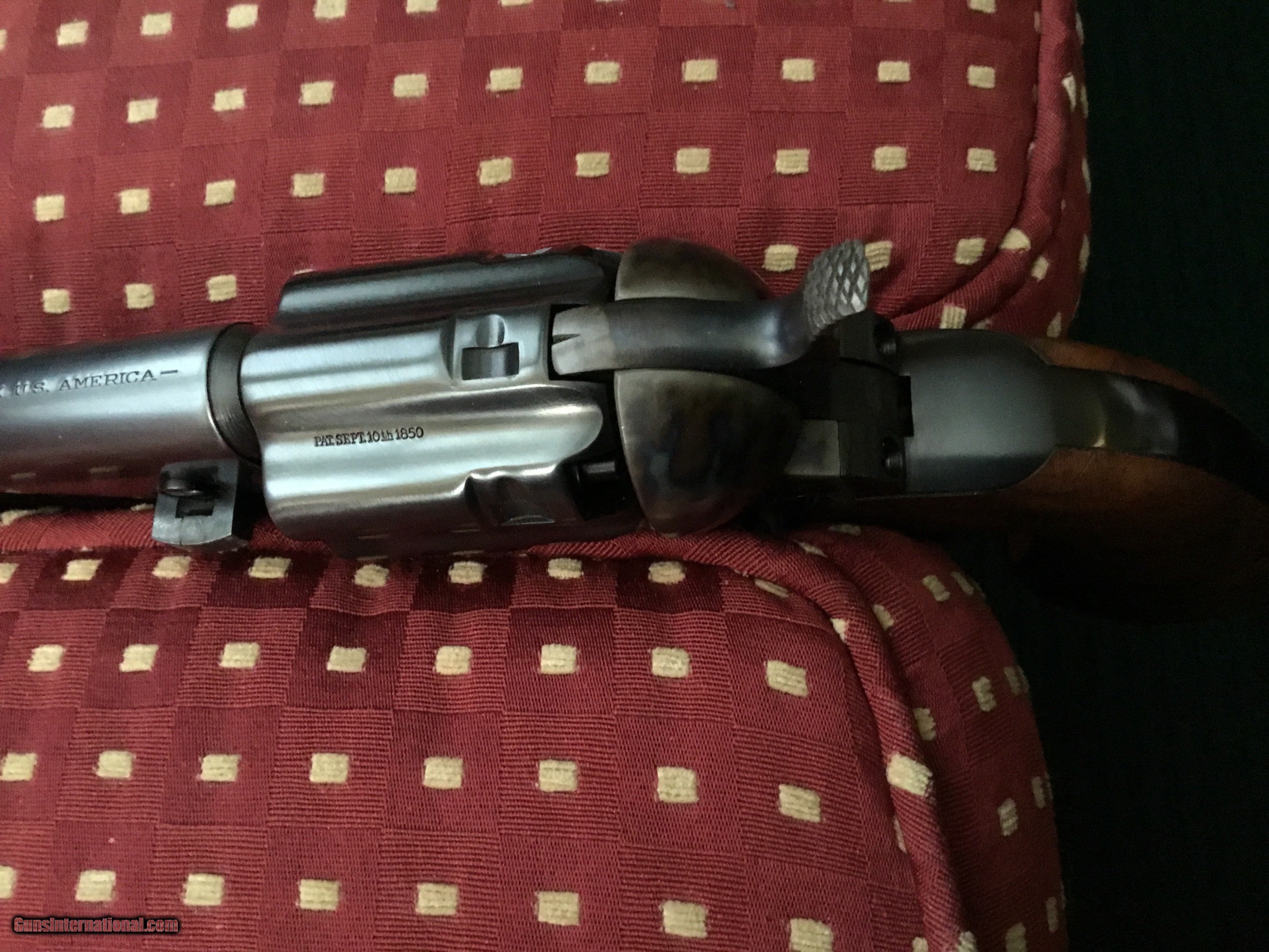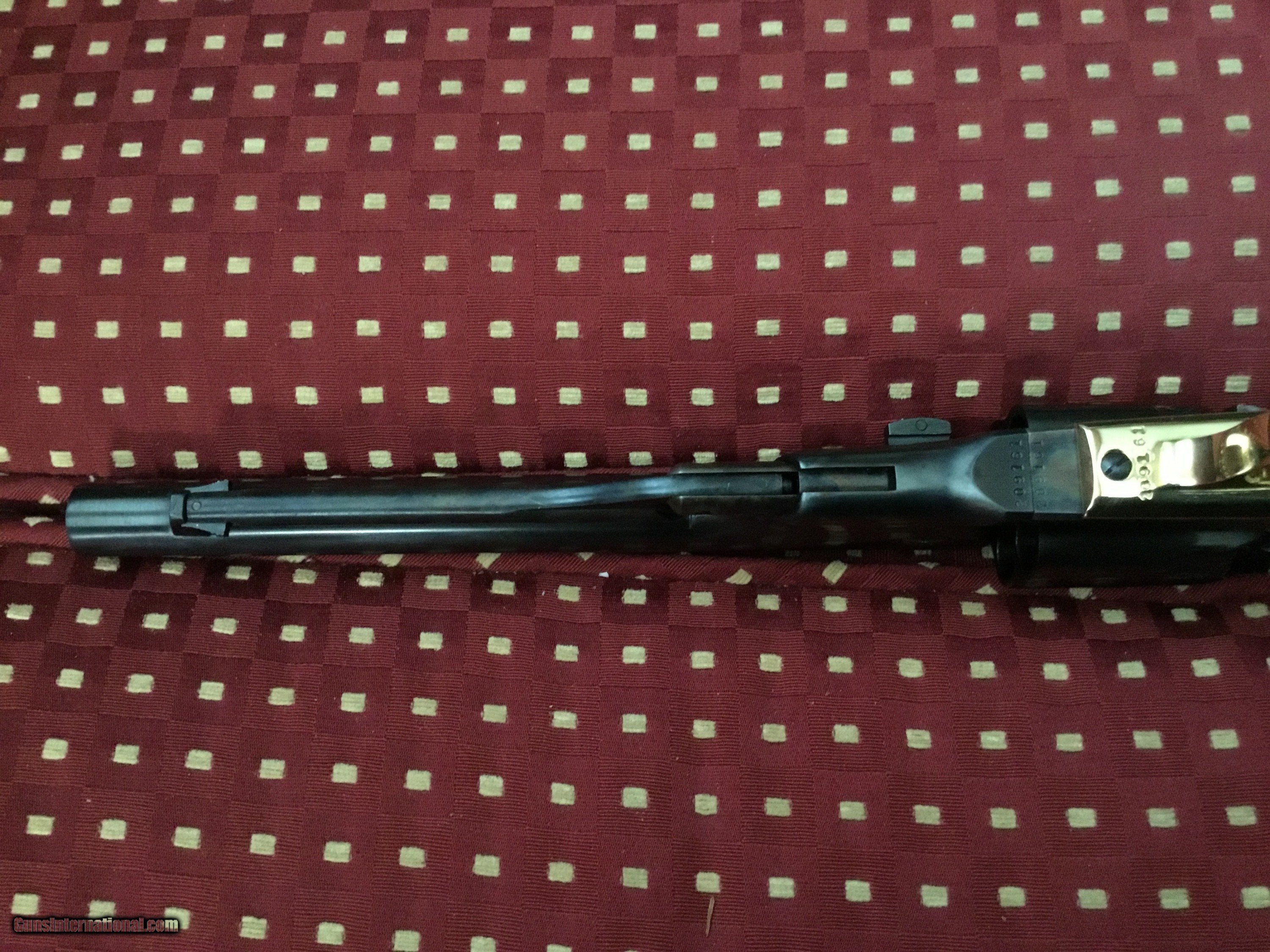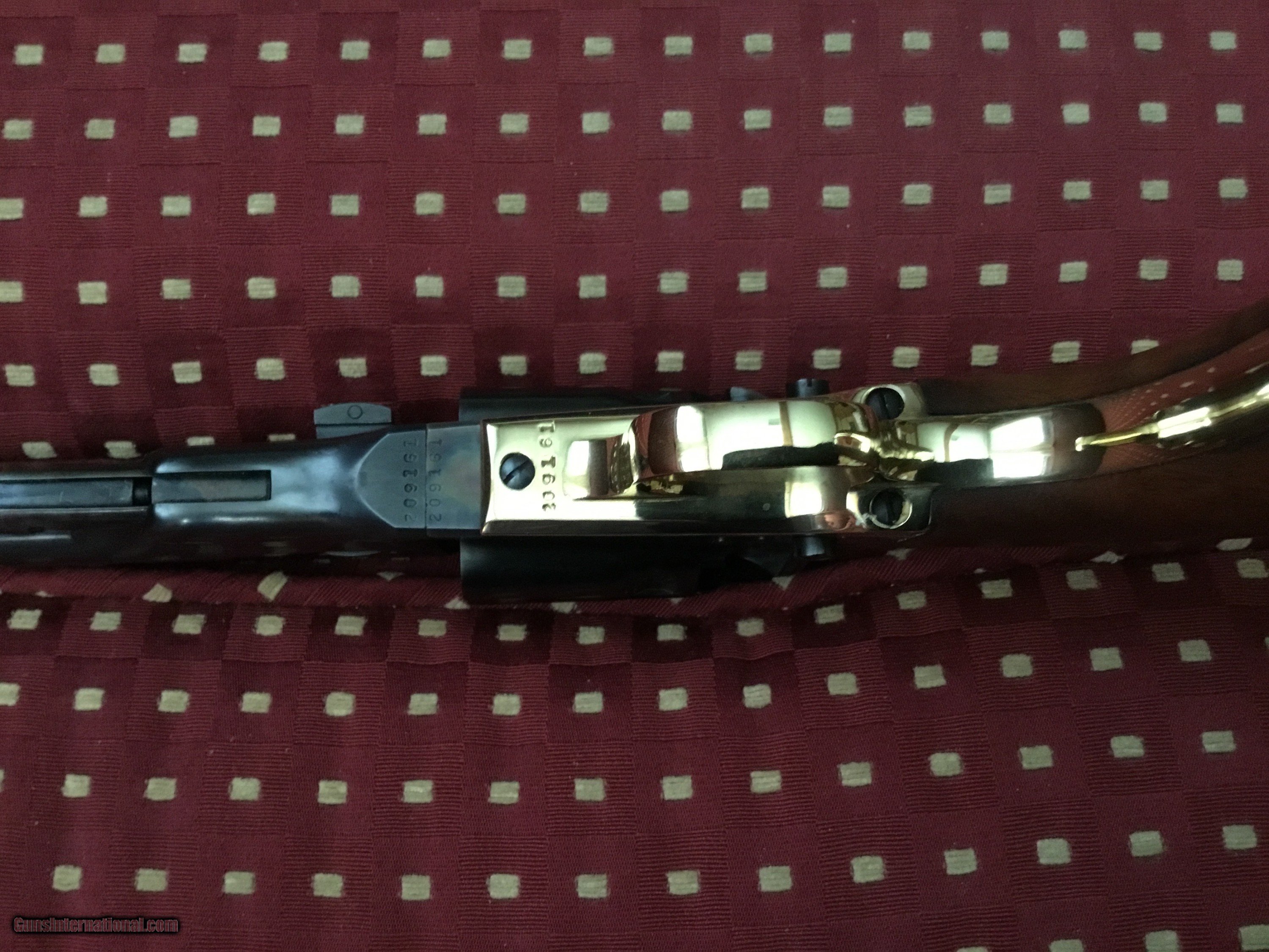 Description: Colt 60 Army with the very seldom seen and highly sought after "fluted" cylinder. This pistol is one of the finest 2nd generation blackpowders I have encountered. Brand new, unfired, no dragline, just perfect. Take a look at the bright and vivid case colors, or the highly grained oil finished wood grips. In the original box with manuals. As good as it gets. Shipping costs $30. SOLD |