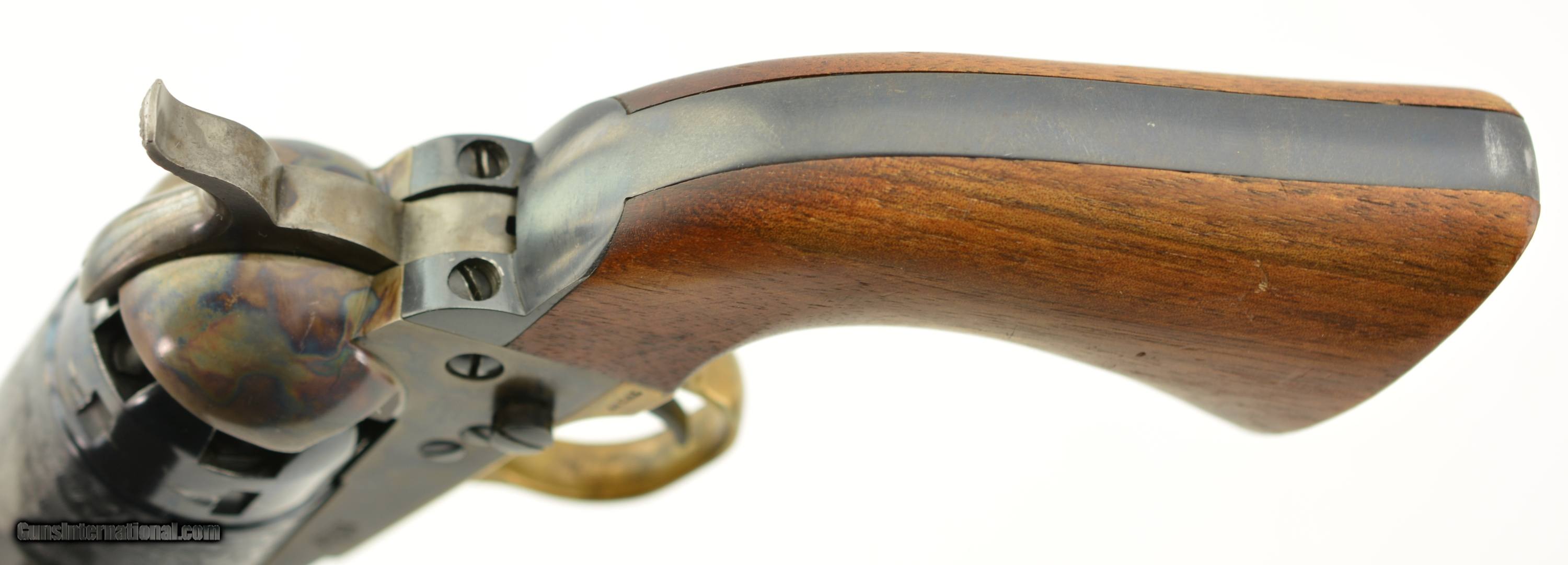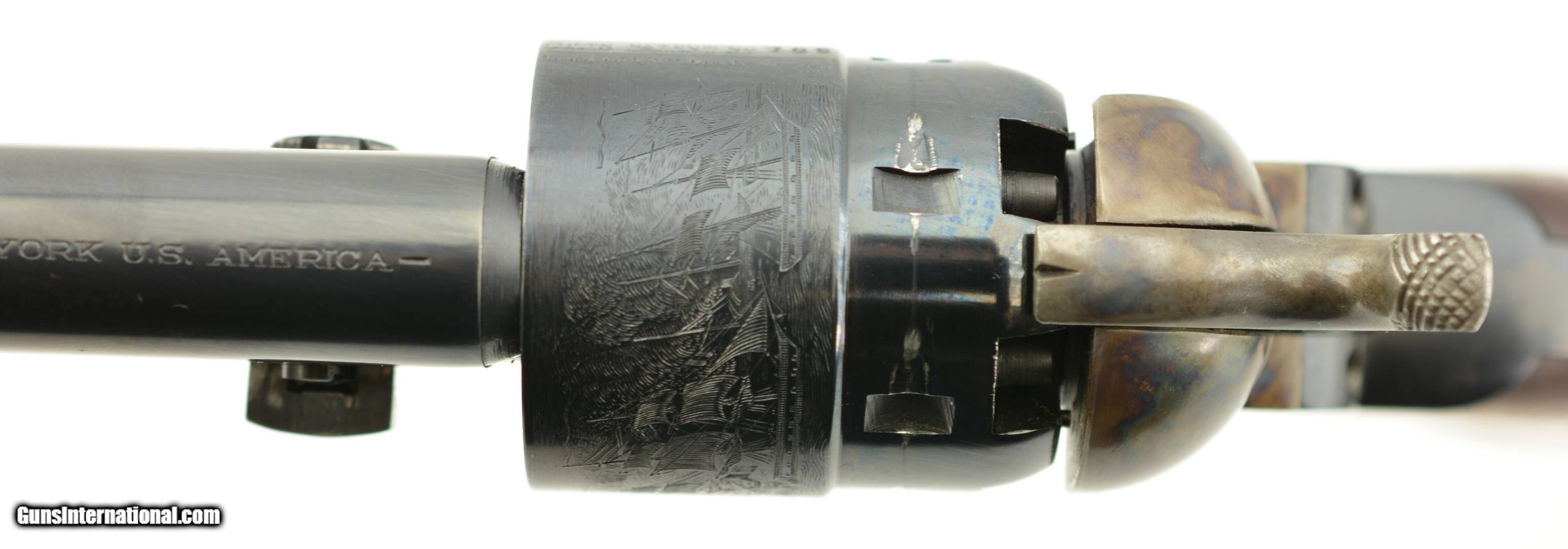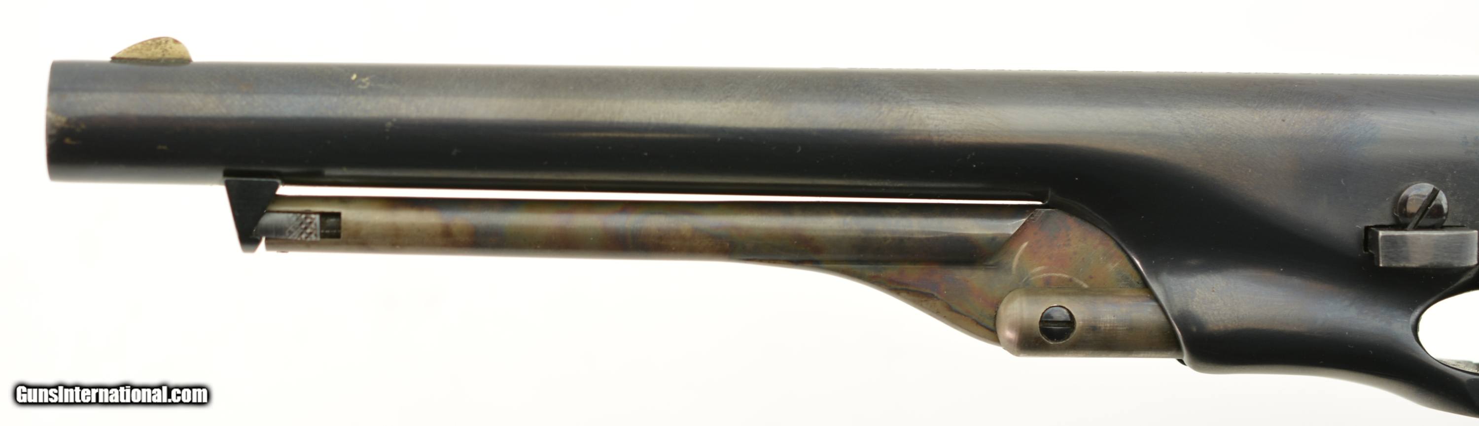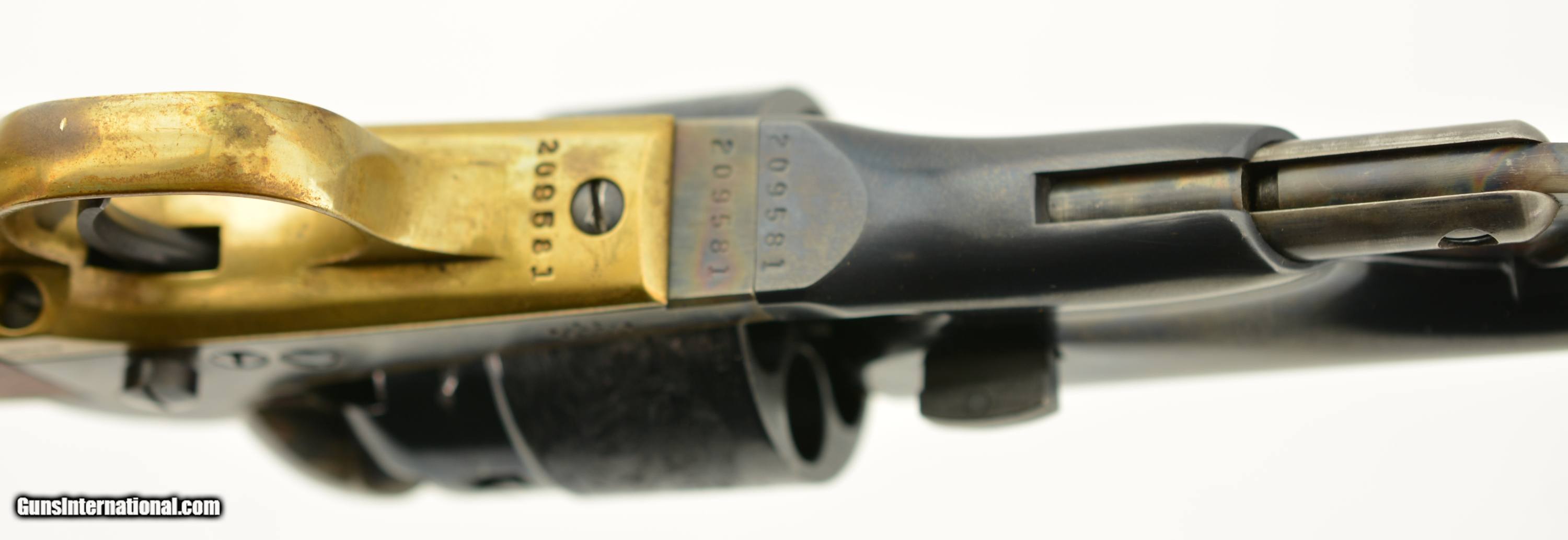 Description: Serial #209581, .44 Caliber Black Powder percussion, 8 inch barrel with a bright, excellent bore. This is the second generation Colt 1860 Army cap and ball revolver manufactured from 1978-1982 featuring roll engraved naval battle scene, “F" Series Colt Blue barrel, cylinder and backstrap with a case color frame and loading lever/plunger and hammer. In excellent condition the faithfully reproduced Colt retains about 94-96% of the original blue finish showing wear at the muzzle and some isolated spots of freckling. The case hardened color is still vibrant with virtually all, 97-98% remaining and the brass frame has a pleasing mellow appearance. The walnut grips are solid with very mild handling marks. It comes in the original foam lined cardboard box numbered to the gun with manual and paper work. A very nice example of this limited run second generation 1860 Army. Antique SOLD Manufacturer: Colt Model: 1860 Caliber Info: .44 Gauge Info: .44 |