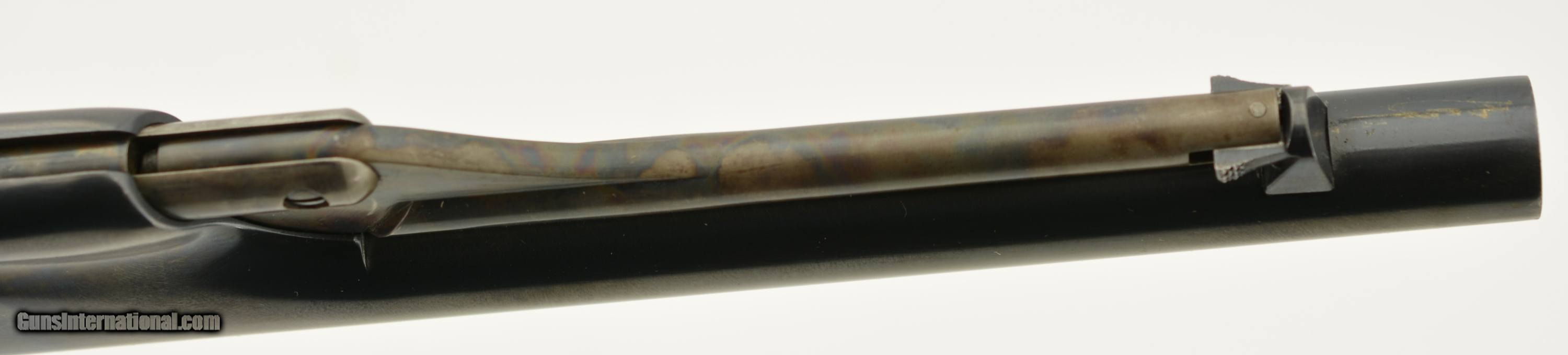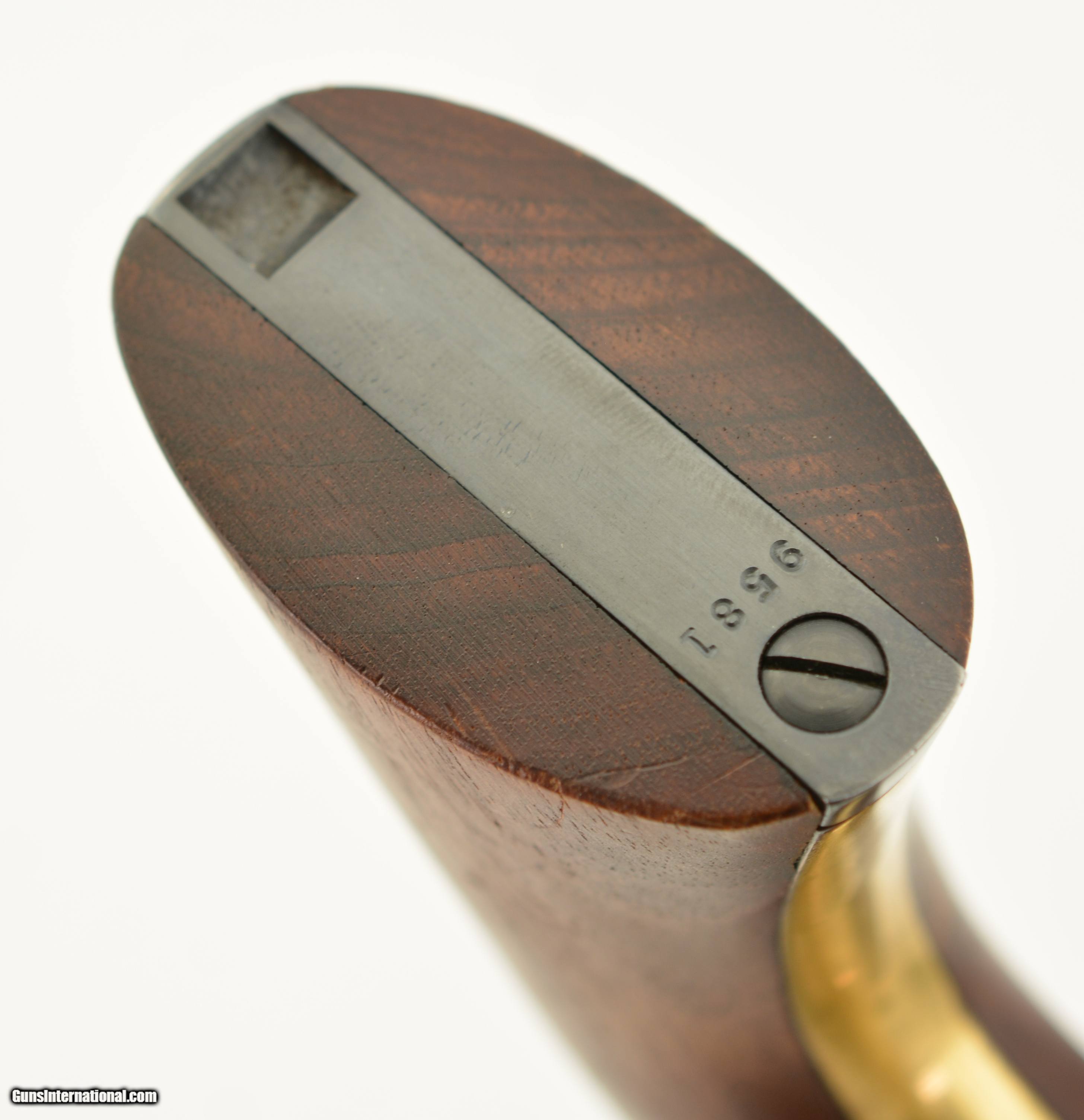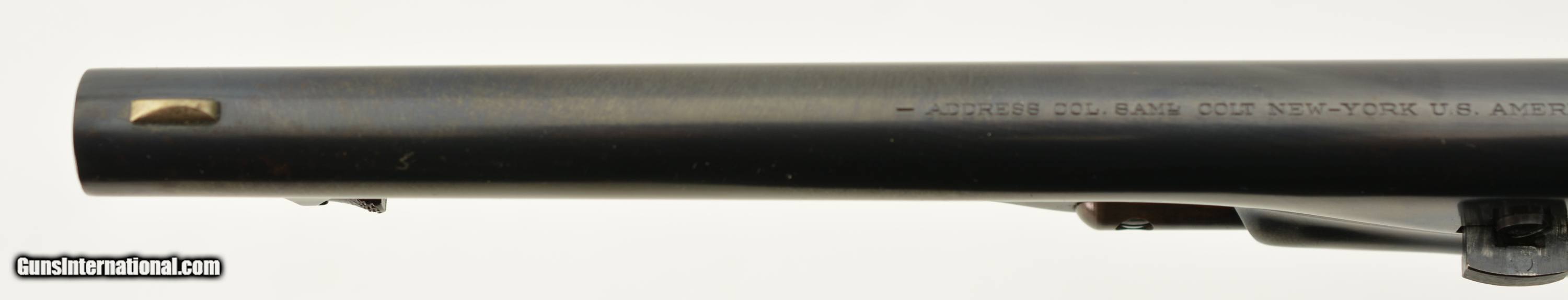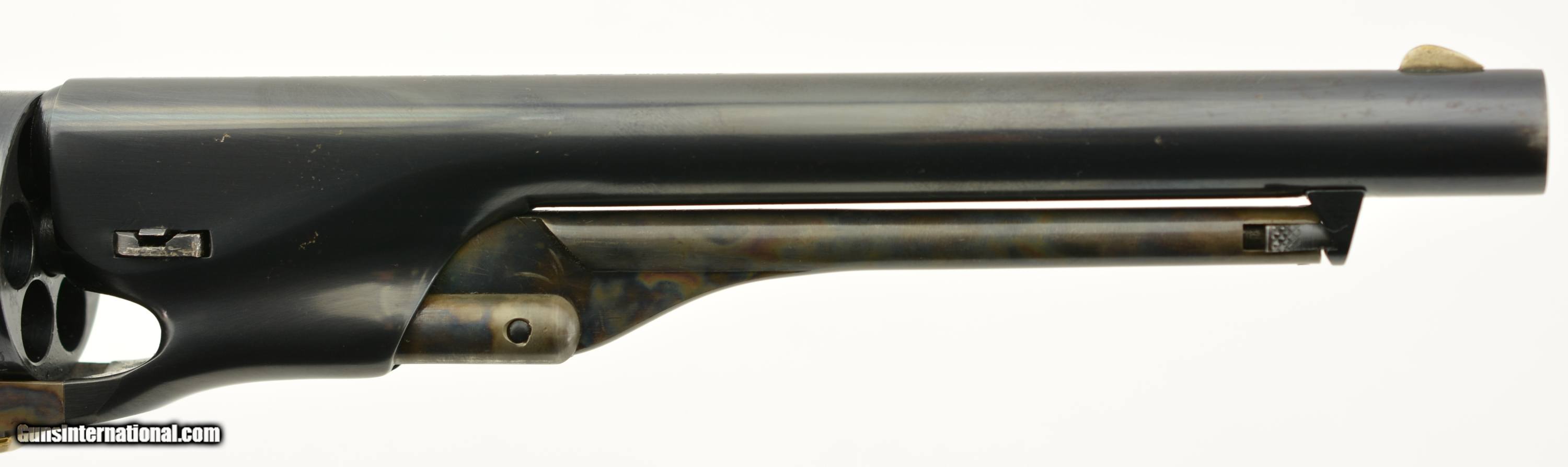Description: Serial #209581, .44 Caliber Black Powder percussion, 8 inch barrel with a bright, excellent bore. This is the second generation Colt 1860 Army cap and ball revolver manufactured from 1978-1982 featuring roll engraved naval battle scene, “F" Series Colt Blue barrel, cylinder and backstrap with a case color frame and loading lever/plunger and hammer. In excellent condition the faithfully reproduced Colt retains about 94-96% of the original blue finish showing wear at the muzzle and some isolated spots of freckling. The case hardened color is still vibrant with virtually all, 97-98% remaining and the brass frame has a pleasing mellow appearance. The walnut grips are solid with very mild handling marks. It comes in the original foam lined cardboard box numbered to the gun with manual and paper work. A very nice example of this limited run second generation 1860 Army. Antique SOLD Manufacturer: Colt Model: 1860 Caliber Info: .44 Gauge Info: .44 |