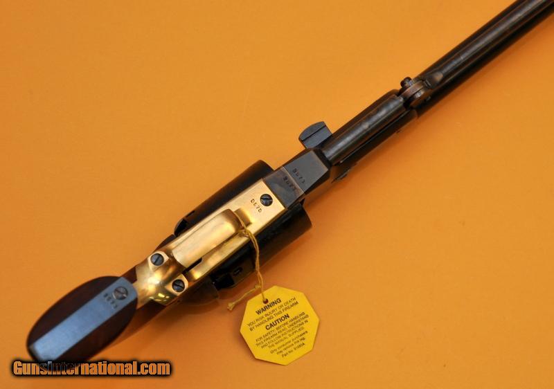 Description: .44 cal. SN. 3573. "F" series, only 2920 mfg in 1980-82 by Colts Manufacturing Company LLC. 8" barrel. Roll engraved 6 shot cyl. Blue & case colored finish with brass square back trigger guard &1 piece walnut grip. Appears unfired with as new bore &finish. Includes original black box & instructions. Ship $25.00 SOLD |