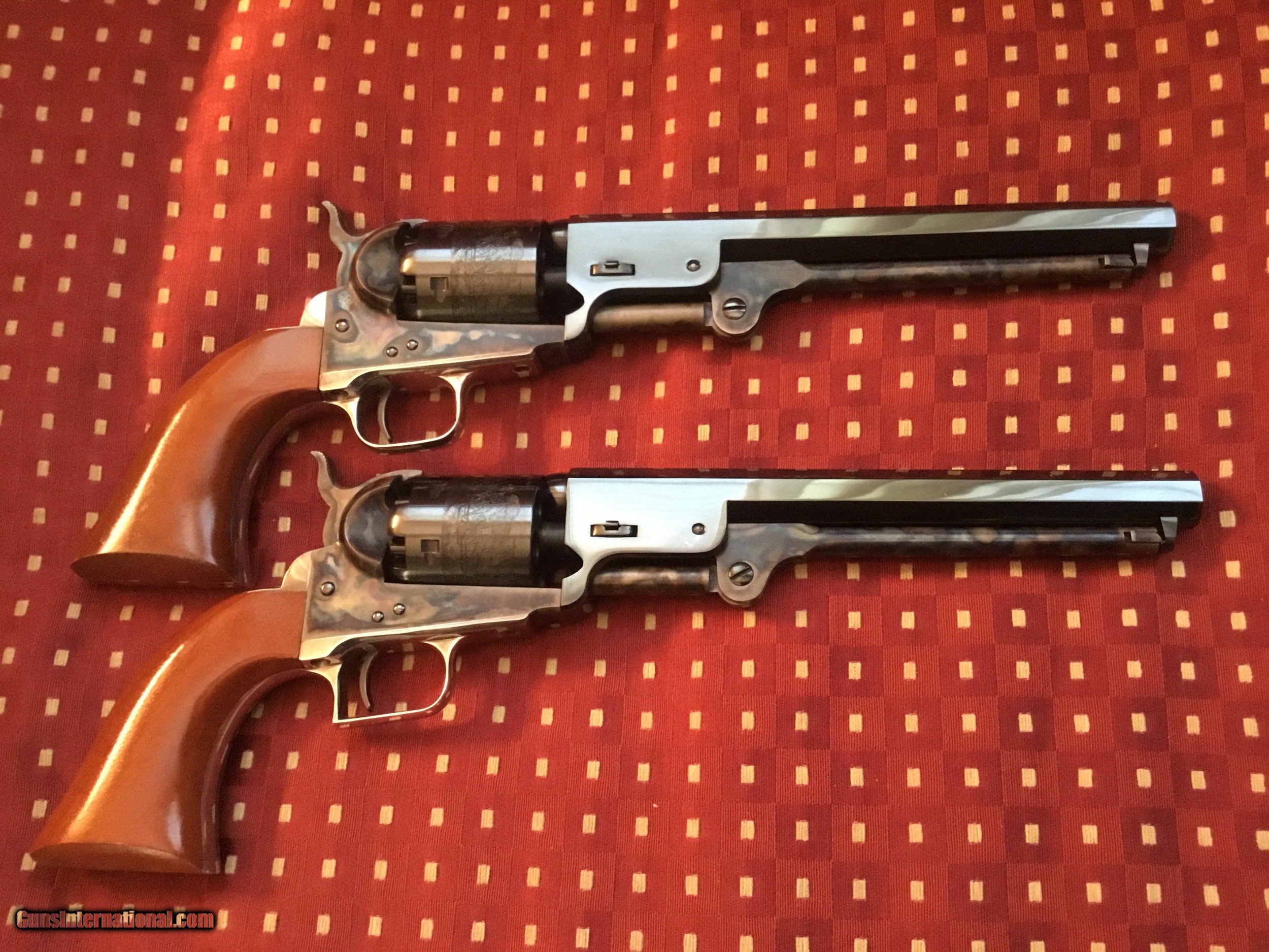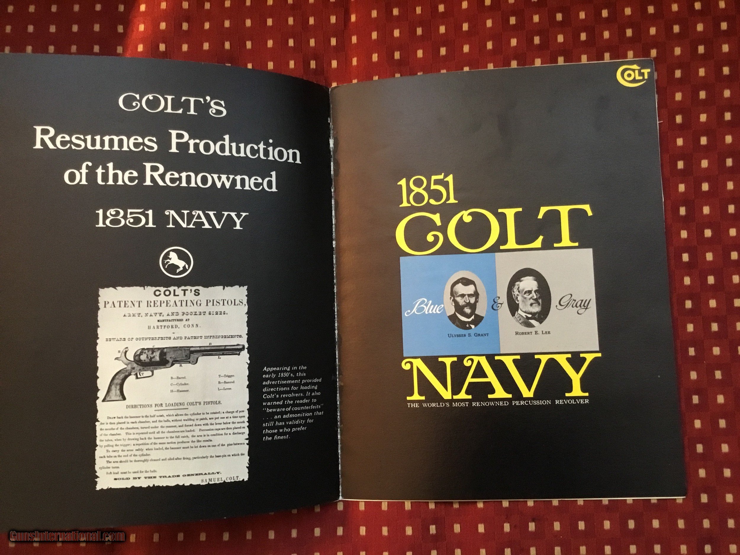 Description: "SOLD PENDING FUNDS" Extremely rare, one of only 250 matched pairs made in 1971. These sets were the very first of the 51 Navies made, and the first of the blackpowders made to introduce the 2nd generation. This set is # 183, absolutely perfect, new and unblemished condition with no cylinder drag line. The Lee pistol has the highly sought after round trigger guard and the Grant has the usual square trigger guard. Included is the very rare introductory flier. The case is in excellent condition, as well as the accessories. Seldom do you see these available. SOLD |