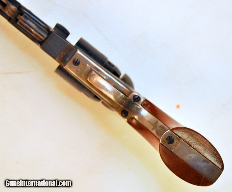 Description: Caliber 36. SN-48690. 5" octagon barrel. 5 shot round cylinder with Stagecoach scene roll engraving. Case colored frame & loading lever. Silver plated grip strap & trigger guard. 1 peice walnut grip. "F" Series revolver, only 5,306 produced by Colt's Manufacturing Co., 1979-1981. Appears unfired retaining at least 99% original finish. Silver grip strap & trigger quard finish is acquiring a pleasing mild age related tarnish. Grips small a few small marks. Includes original foam lined black box & papers. Priority mail $15.00. SOLD |