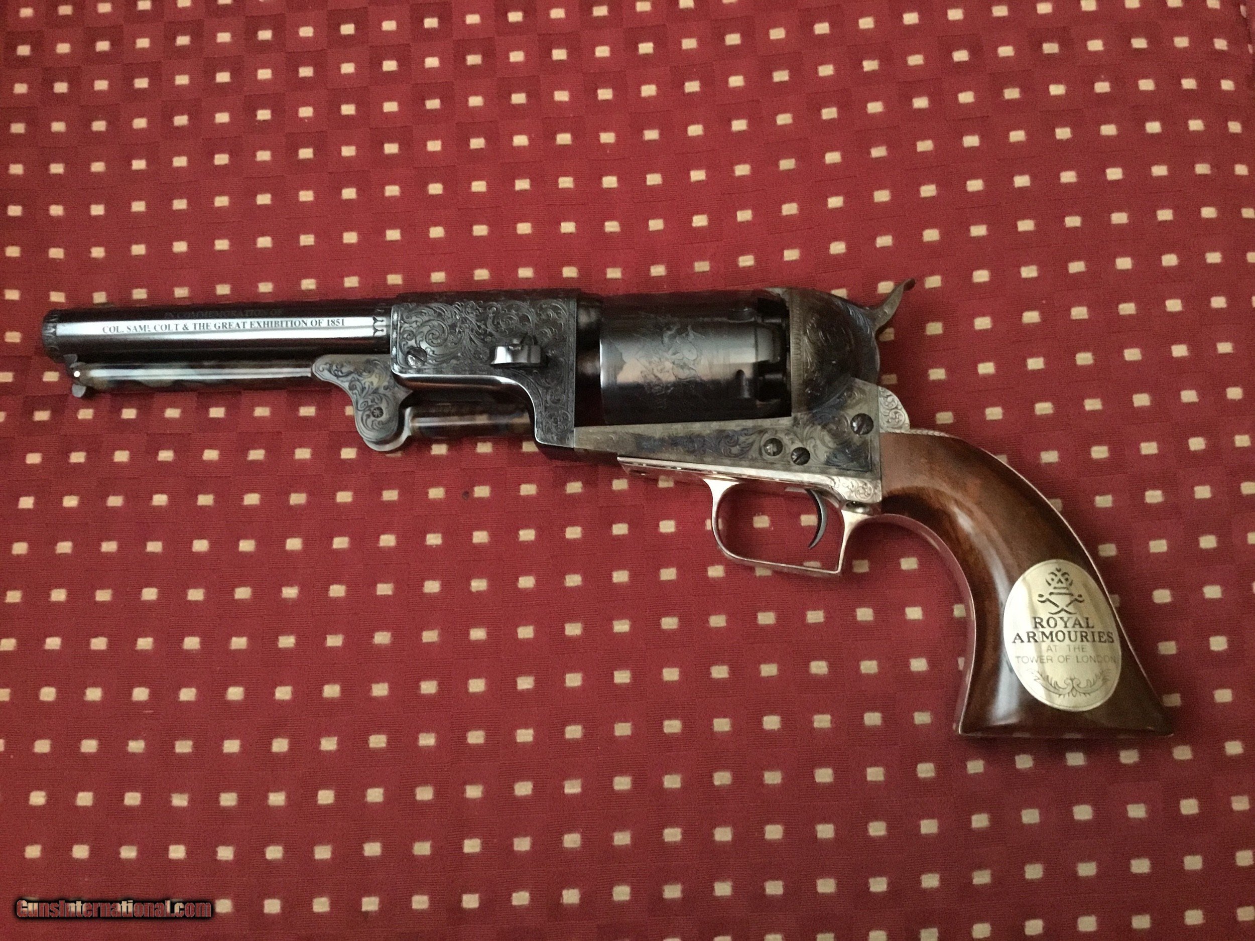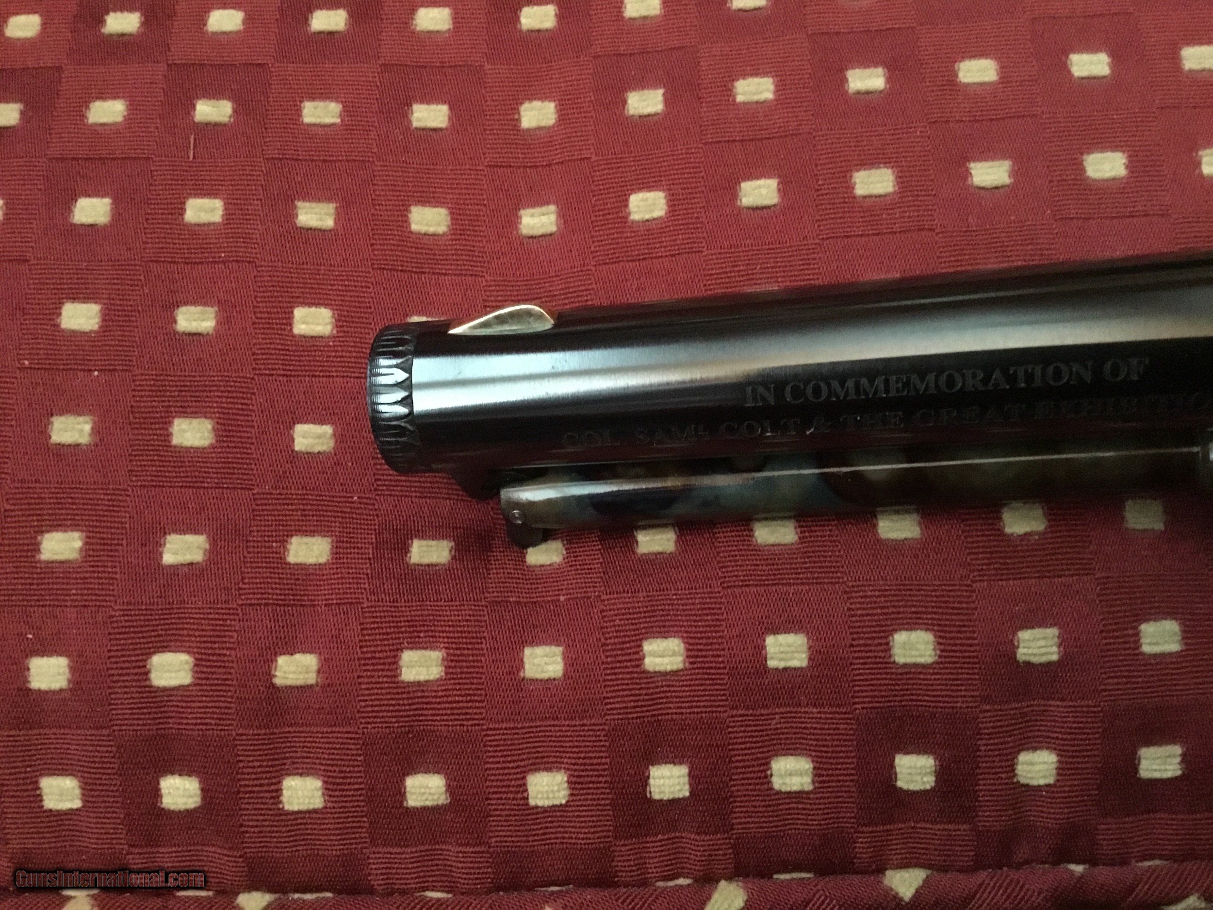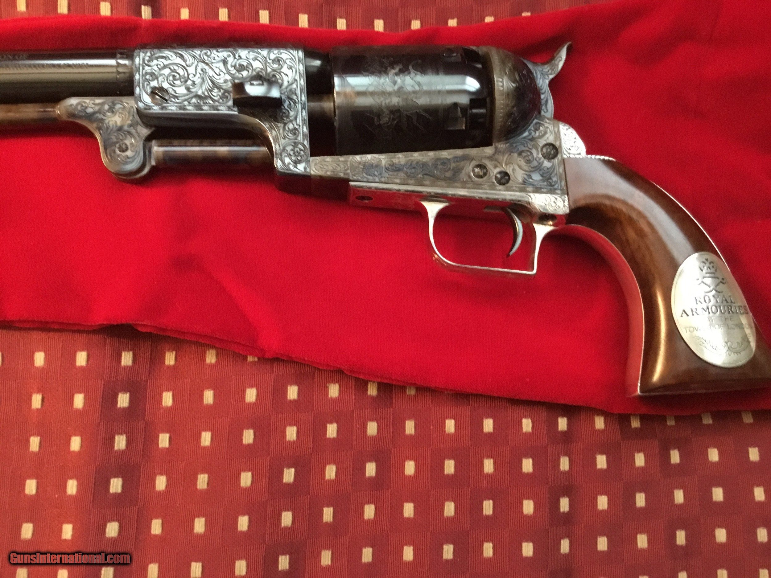 Description: The Colonel Samuel Colt Dragoon 2nd Model for the Royal Armories of the Tower of London, from the great Exhibition of 1851 in London. This limited commemorative edition is number 6 of 1,000 issued in 1990 by the US historical society Exquisite engraving on high polished blue and vivid case colors with wolfs head on the hammer. Includes the certificate of authenticity, brochure with accompanying letters, white gloves and all accessories housed in a walnut case. Cost $2250 thirty years ago. A great investment today at this price SOLD |