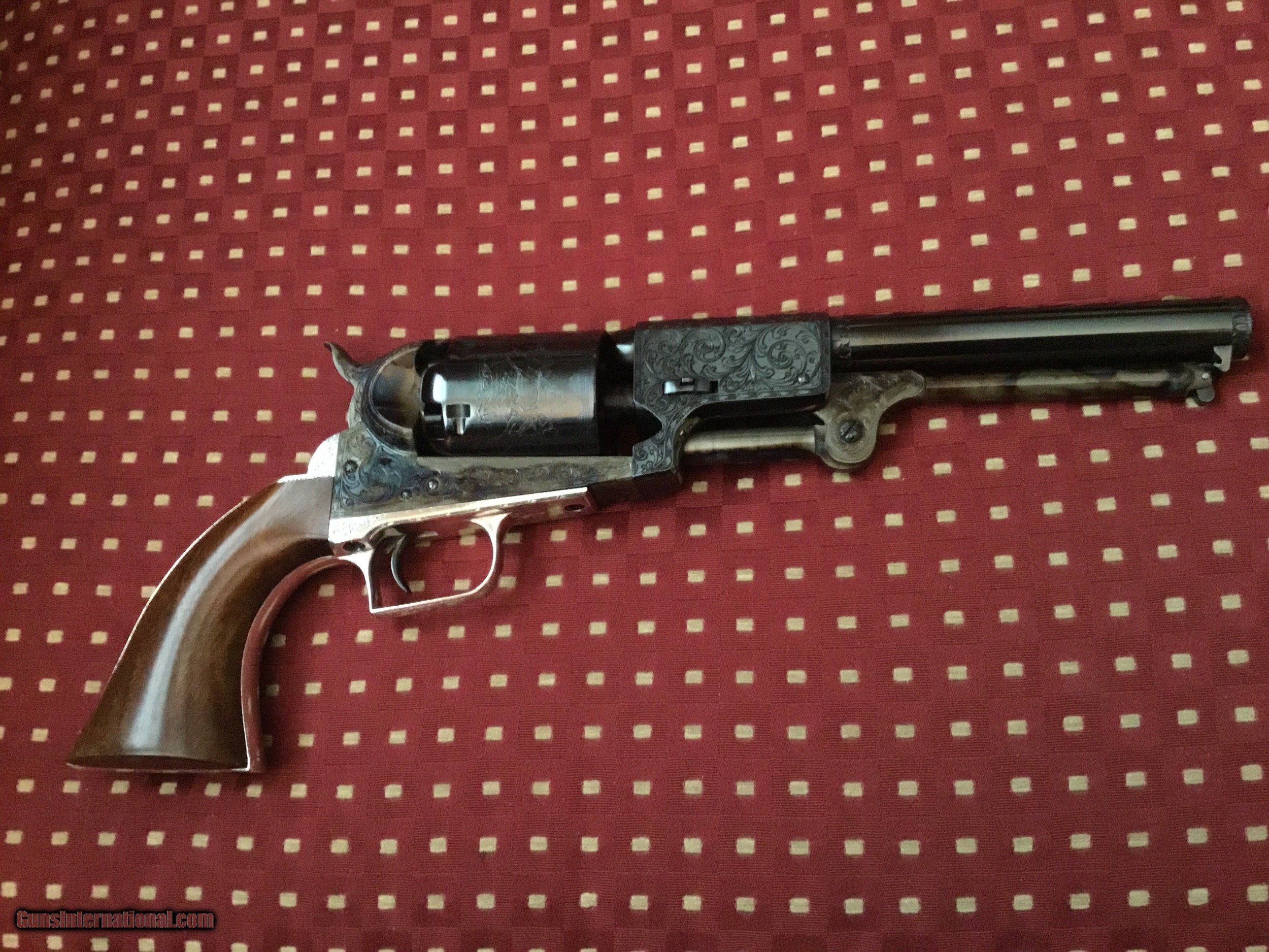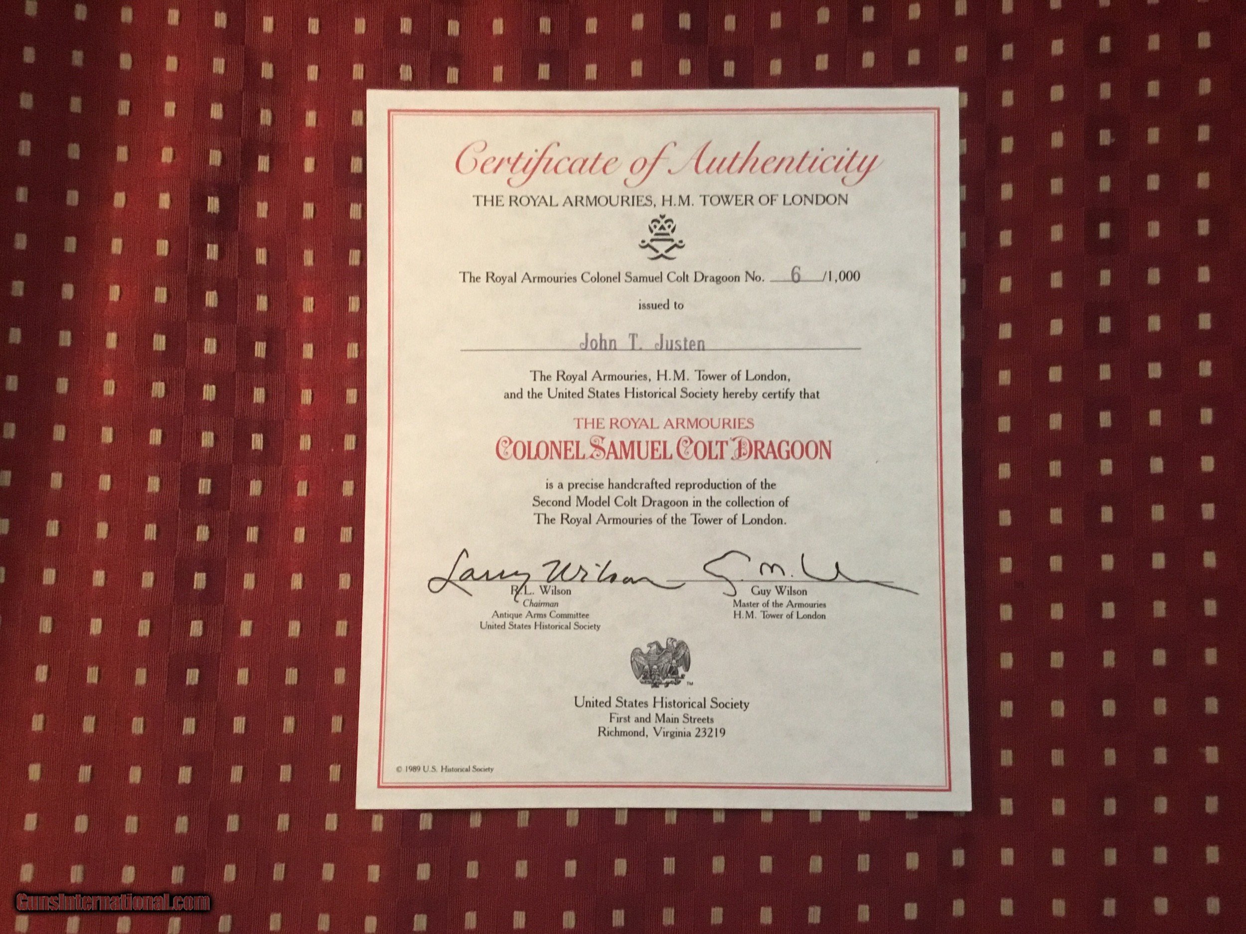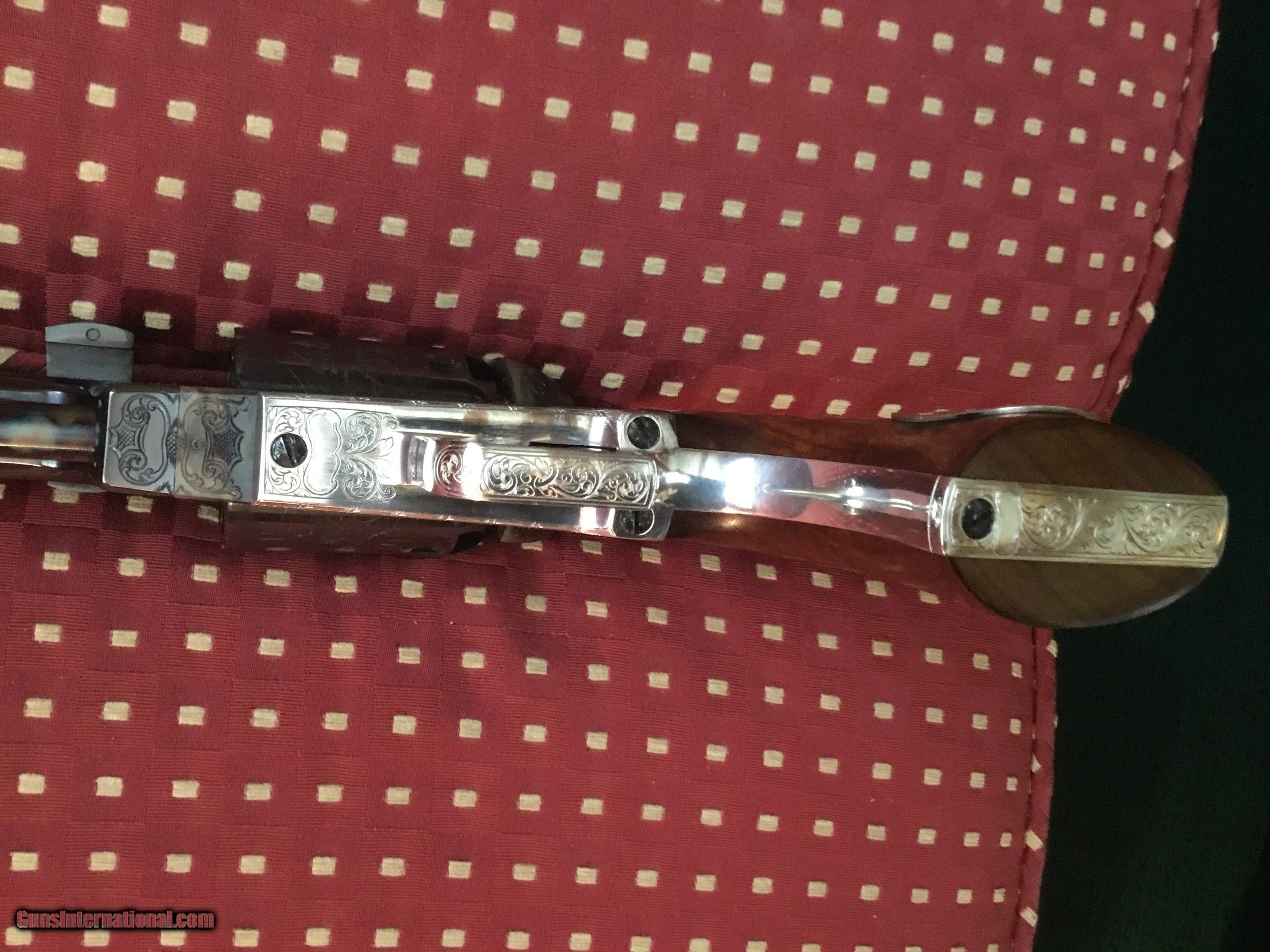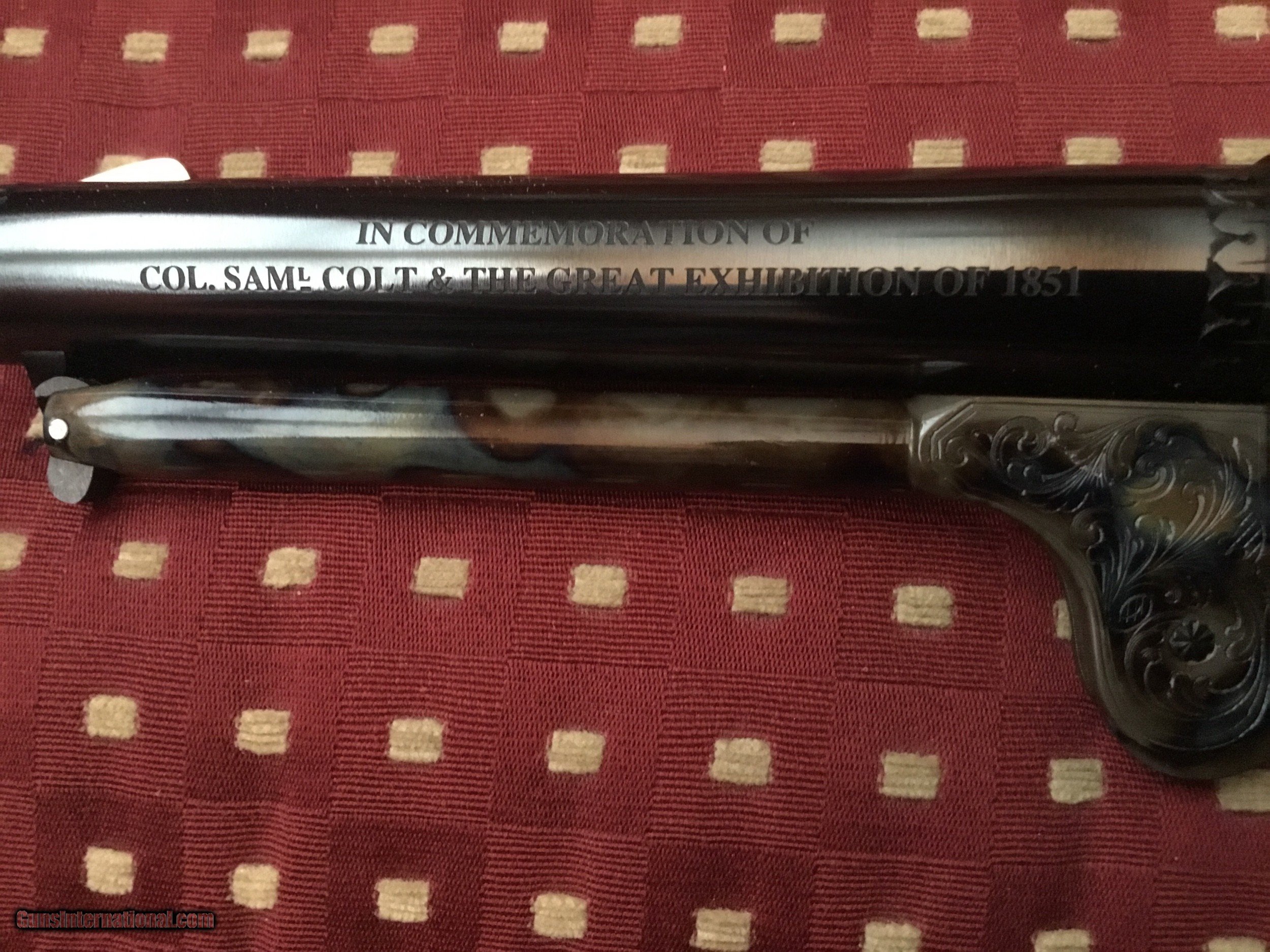 Description: The Colonel Samuel Colt Dragoon 2nd Model for the Royal Armories of the Tower of London, from the great Exhibition of 1851 in London. This limited commemorative edition is number 6 of 1,000 issued in 1990 by the US historical society Exquisite engraving on high polished blue and vivid case colors with wolfs head on the hammer. Includes the certificate of authenticity, brochure with accompanying letters, white gloves and all accessories housed in a walnut case. Cost $2250 thirty years ago. A great investment today at this price SOLD |