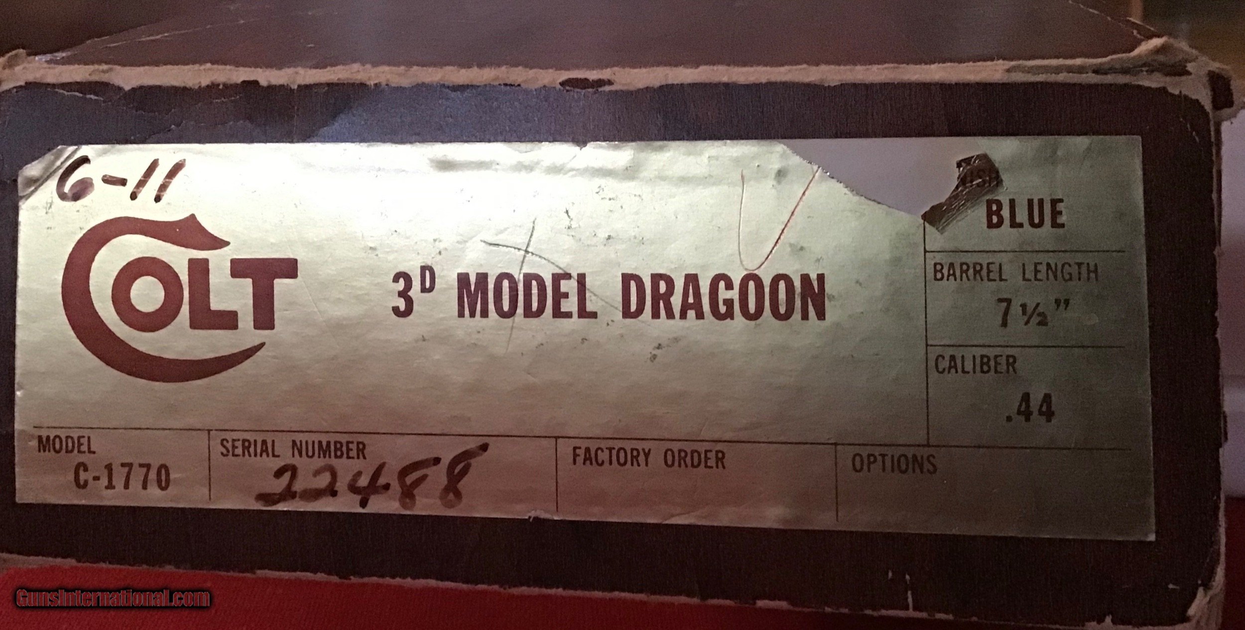 COLT DRAGOON 3 MODEL, 44 CAL., 7 1/2”, BLACK POWDER PERCUSSION, NEW UNFIRED IN THE BOX