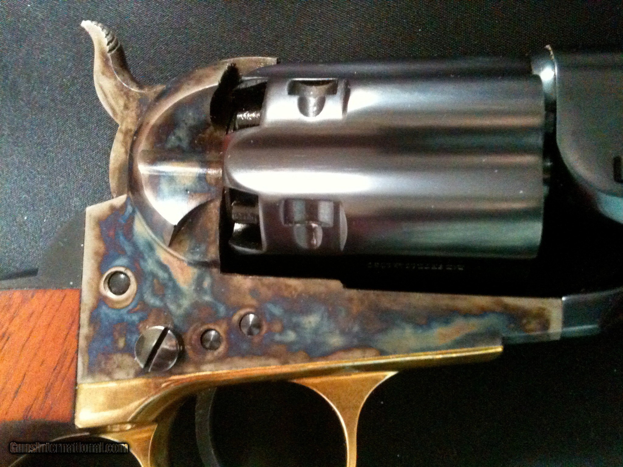 Description: Colt factory cased set of second generation 1860 army revolvers with consecutive serial numbers in mint condition still with factory grease on them. Revolvers have the scarcer fluted cylinders. Cylinders have never been turned and they even smell of factory grease. Colt custom shop case. They come with a mint condition Colt's Patent powder flask that has an unusual brown lacquer and not the customary black. Serial numbers 208365/208366. There were no shipping boxes when I originally purchased the set. SOLD Manufacturer: Colt Model: 1860 Army Serial Number: 208365/208366 Barrel Length: 8 inches Caliber Info: 44 Condition: factory mint Metal Condition: mint Wood Condition: mint Bore Condition: shiny Case: mint |