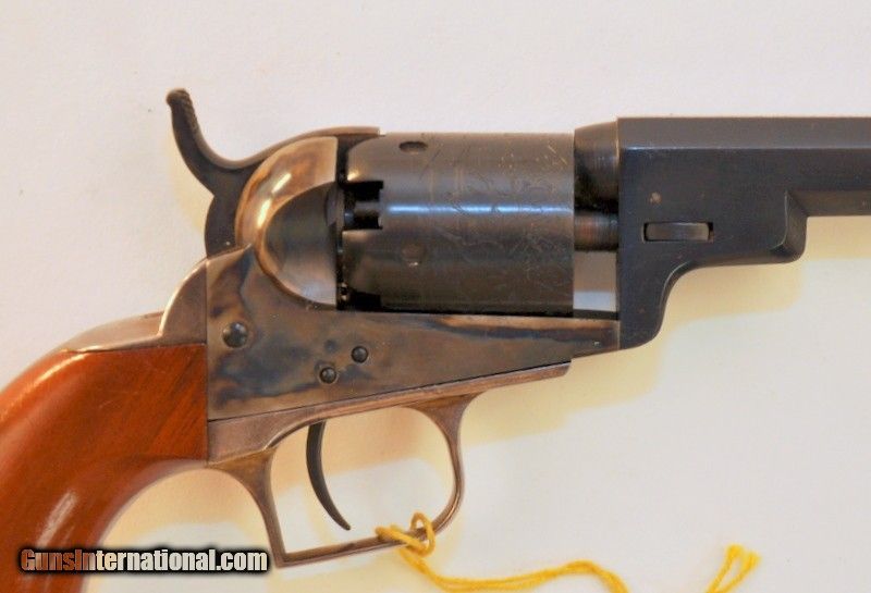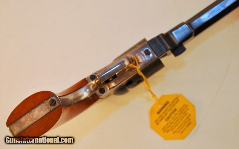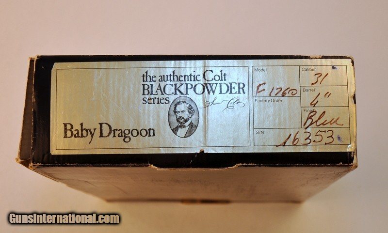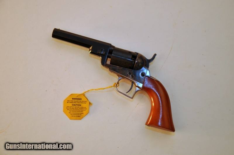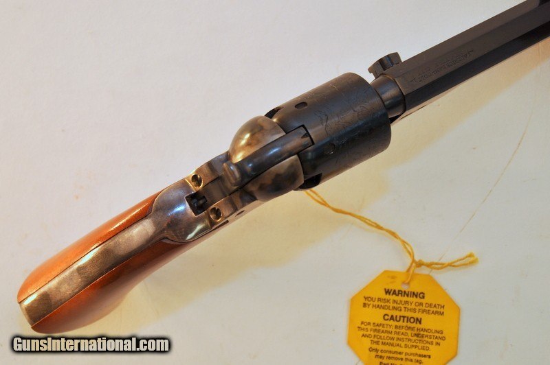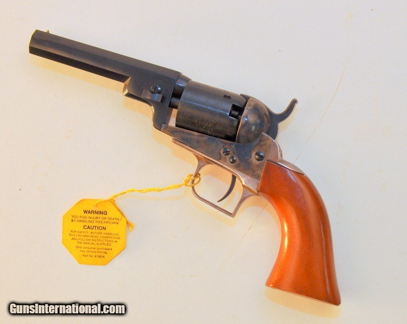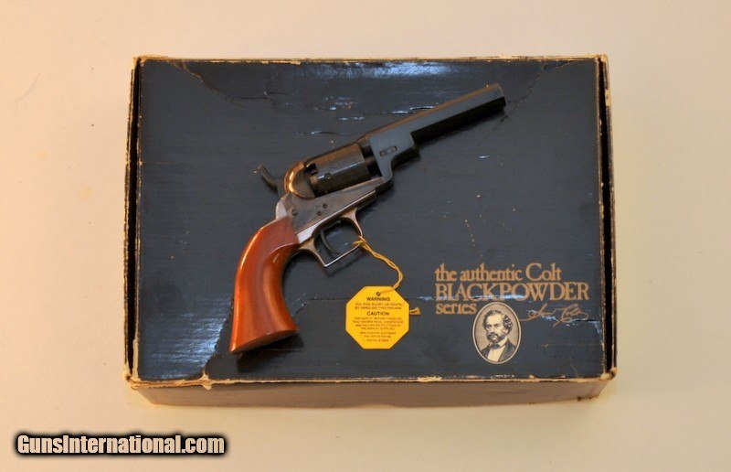 Description: .31 caliber. SN - 163XX. "F" series revolver. Limited edition of only 1352 mfg 1981-1982. 4" octagon barrel.5 shot round cylinder with Texas Ranger & Indian scene roll engraving. Blue finish with case frame. Silver finished square back trigger guard & backstrap. 1 piece walnut grip. Appears unfired Grip straps have an age related tarnish. Includes original box containing instructions, service center paper & Colt Companion brochure. Priority mail $30.00. SOLD |