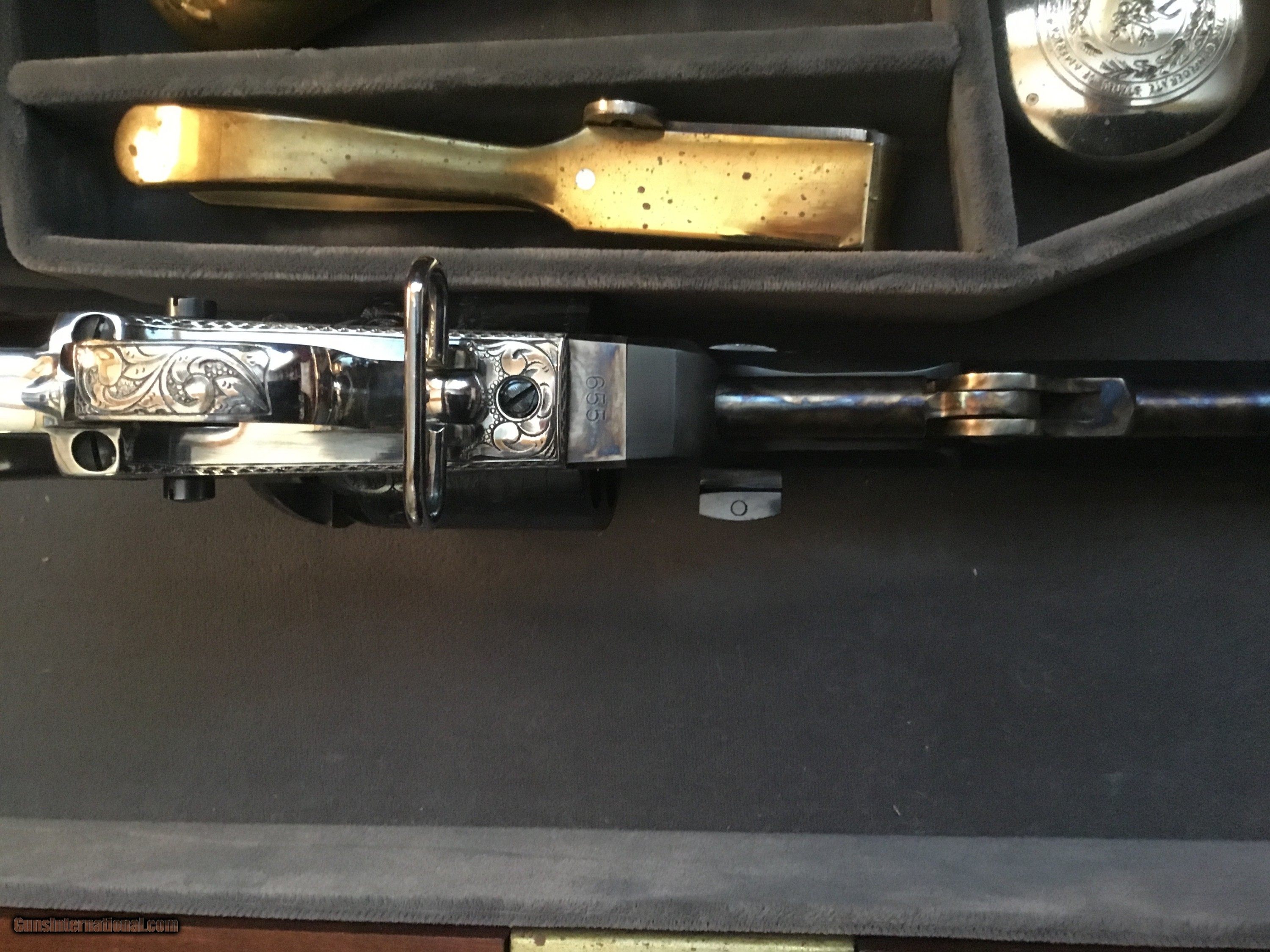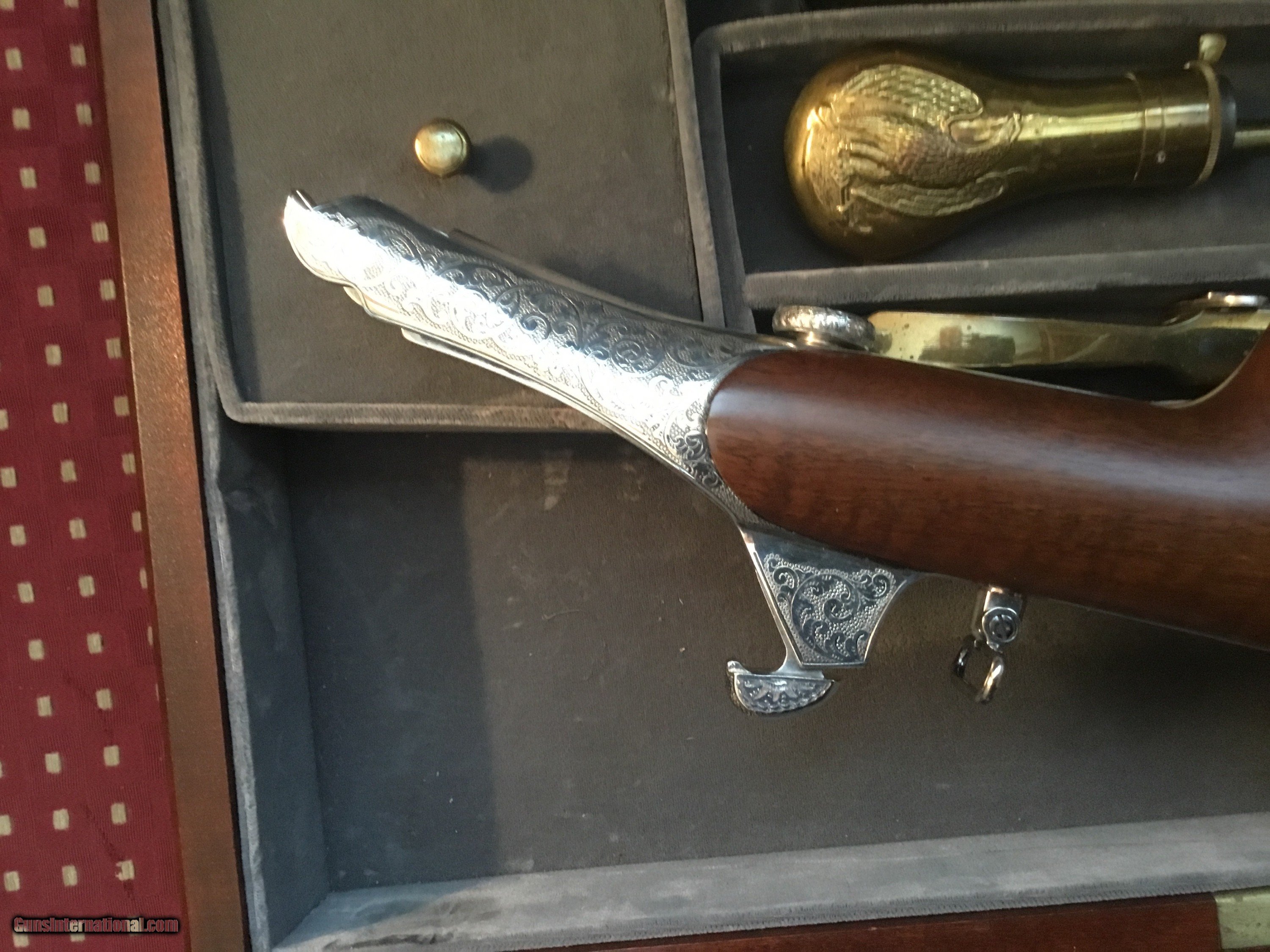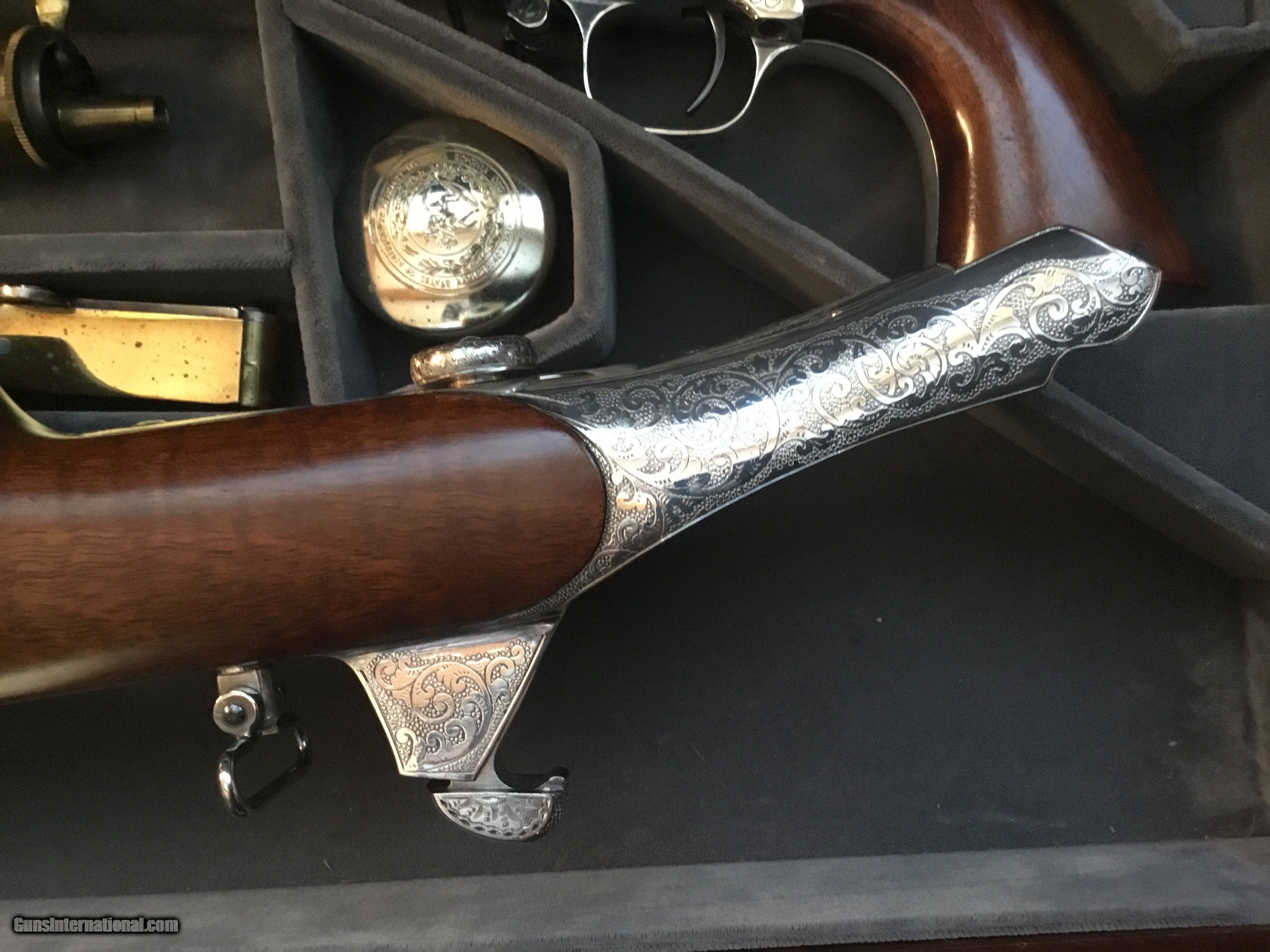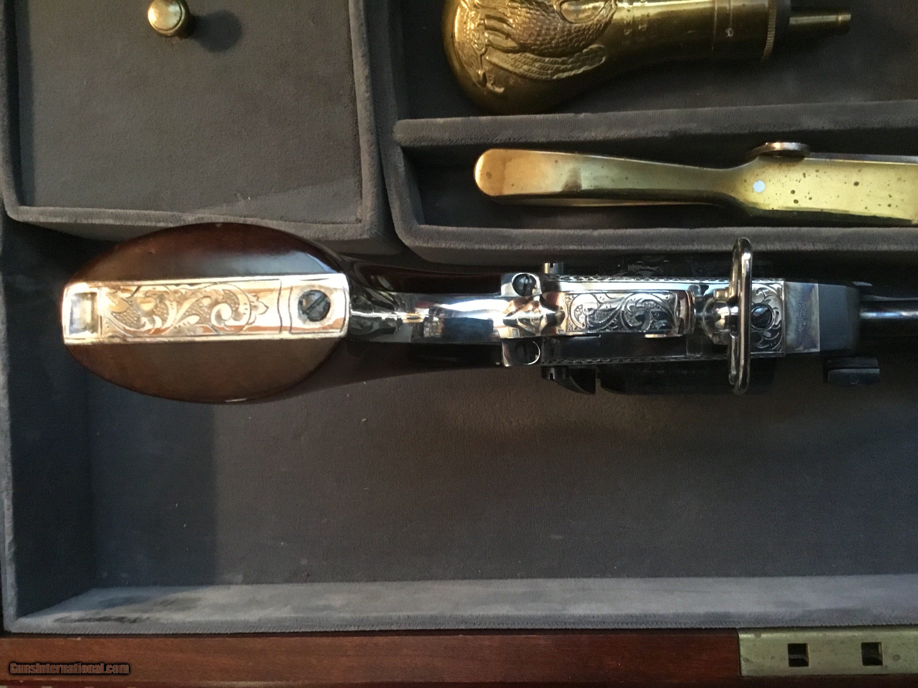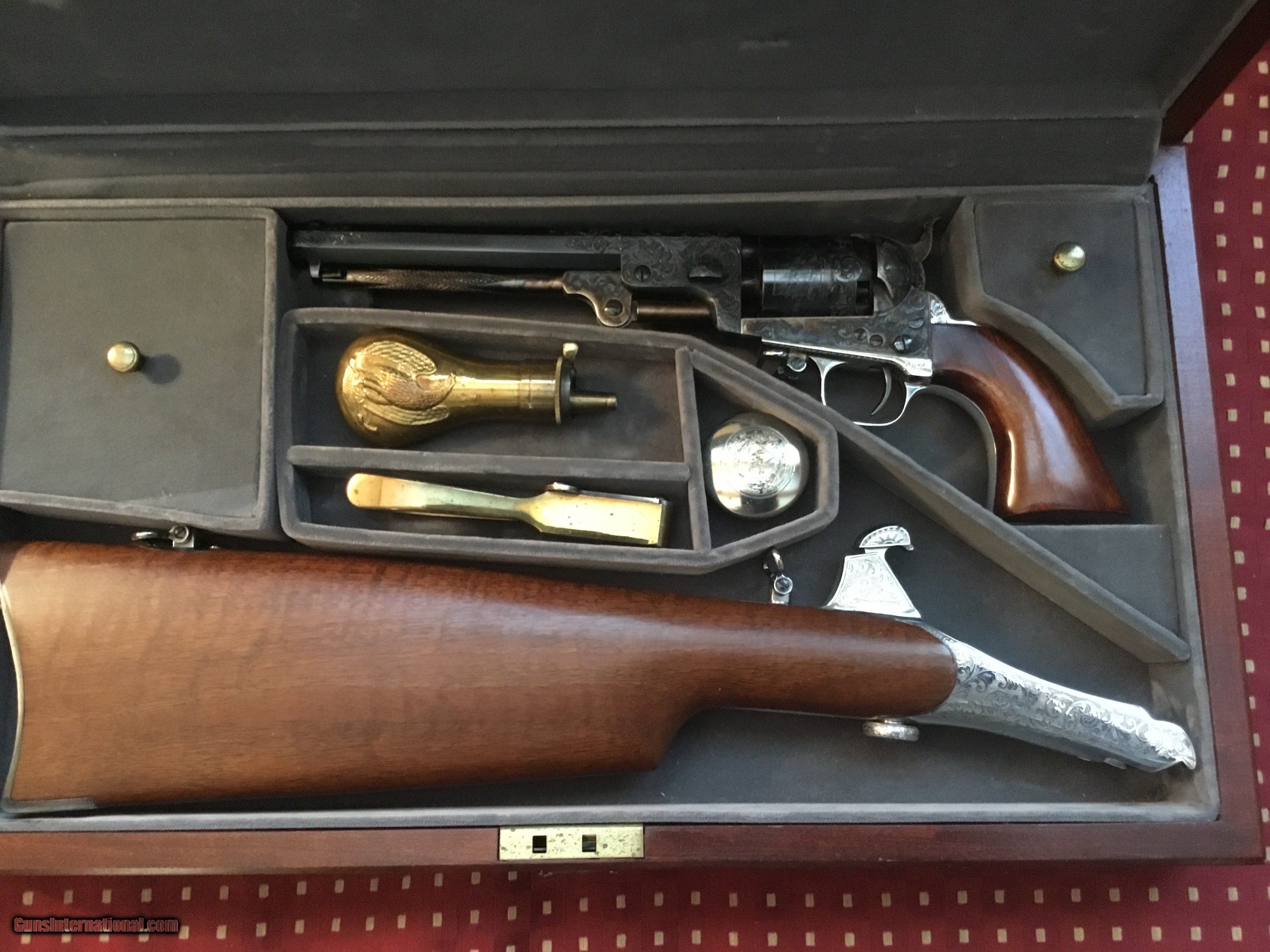 Description: 1851 Navy commerative copy of the one Col. Sam Colt presented to Jefferson Davis, secretary of war for the south in the civil war. Beautiful Nimscke style engraving totally hand engraved on the pistol as well as the shoulder stock and cap tin. Cased with all accessories in a very attractive display case in excellent condition. Pictured in the 2nd edition of the blackpowder reproductions by noted authority Dennis Adler. Pistol is as new, unfired. Priced below 1990 cost. Shipping costs $60. SOLD |