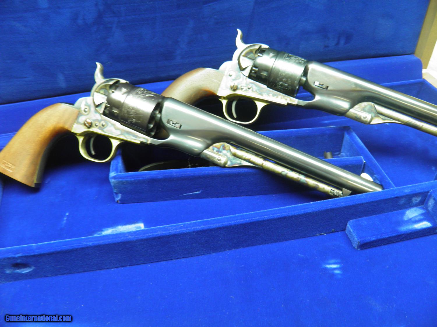 Description: COLT US CAVALRY COMMEMORATIVE SET, TWO COLT MODEL 1860 PERCUSSION REVOLVERS IN .44 CALIBER, WITH 8" ROUND BARRELS,COLT ADDRESS ON TOP OF BARREL READS "SAM COLT" HARTFORD CT, DEEP POLISHED BLUING FINISH ON BARREL, CYLINDER, BACK STRAP, TRIGGER, WEDGE AND SCREWS, BEAUTIFUL CASE COLORS ON FRAME, LOADING LEVER, HAMMER, BRASS FINISH ON TRIGGER GUARD,CYLINDERS ARE ROLL ENGRAVED WITH NAVAL BATTLE SCENE, AND COLTS PATENT NO. 38. DATED SEPT. 1OTH 1850, ONE PIECE OIL FINISHED WALNUT GRIPS, CARTOUCHED MJH INSPECTION MARKS, THE TWO REVOLVERS FIT IN BEAUTIFUL WALNUT FITTED CASE LINED WITH ROYAL BLUE VELVET, THE CASE ACCOMMODATES THE TWO REVOLVERS, A WALNUT DETACHABLE SHOULDER STOCK, WITH POLISHED BRASS YOKE AND BUTT PLATE, THAT FIT BOTH REVOLVERS, A "STAND OF FLAGS" POWDER FLASK, A COLT PATENTED TWO CAVITY BULLET MOLD, A L SHAPED NIPPLE WRENCH, A CAP CAN, AND TWO BRASS CASE KEYS, OWNERS INSTRUCTION MANUAL, COLT BLACKPOWDER SERIES BOOKLET, HANG TAGS, THIS IS ONE "BEAUTIFUL SET" THAT IS 100% NEW AND UNFIRED, BOTH GUNS ARE SPOTLESS!!! SOLD |
