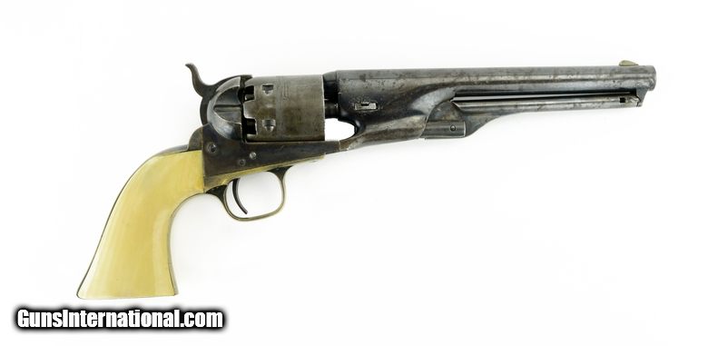 Beautiful Colt 1861 Navy Revolver With Carved Lady Liberty Grips. Made in 1863. Beautiful gun with 85% of the original blue on the barrel. Bright case colors on the fame. Excellent cylinder scene. Gun is all matching. Gun has beautiful carved grips with Lady Liberty slaying some sort of serpent carved into the left hand side. Gun is in excellent condition and the grips really make it. Very fine Colt 1861 Navy!