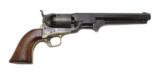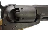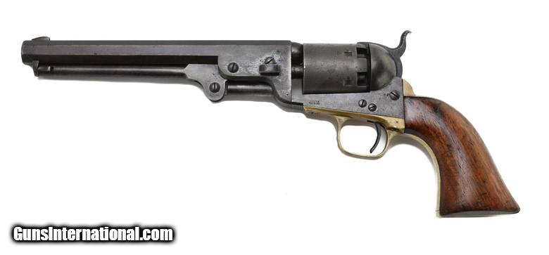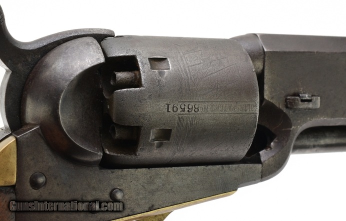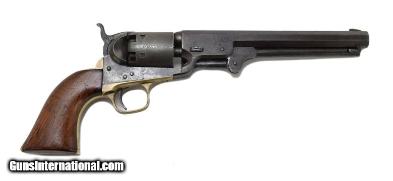 Colt 1851 Navy .36 caliber revolver. Made approximately 1858. Metal has a brown/gray patina. Cylinder scene is visible. Action works perfectly. Serial numbers are matching, including the wedge. Grips are very good. No cracks. Very good overall condition. An appealing 1851 Navy.