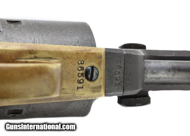 Description: Colt 1851 Navy .36 caliber revolver. Made approximately 1858. Metal has a brown/gray patina. Cylinder scene is visible. Action works perfectly. Serial numbers are matching, including the wedge. Grips are very good. No cracks. Very good overall condition. An appealing 1851 Navy. SOLD |