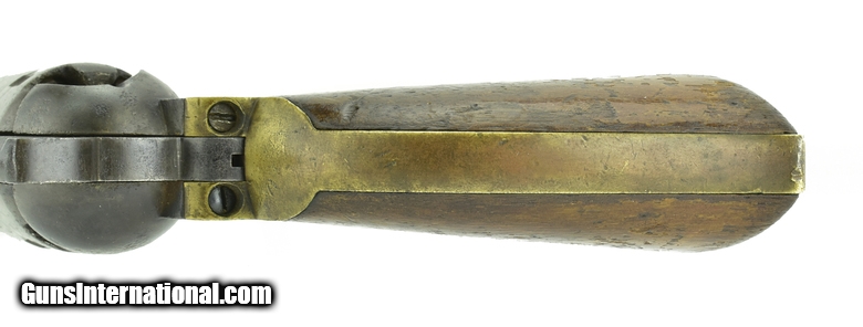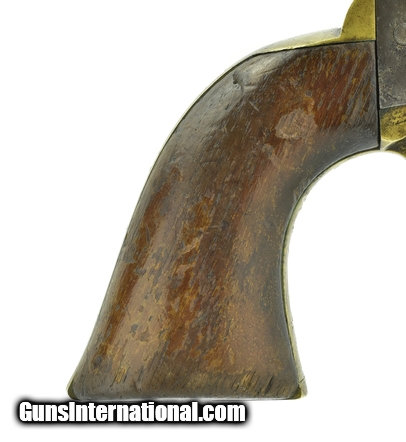 Colt 1851 Navy .36 Caliber Revolver. Numbers match except loading lever and wedge which are not numbered. Action works and indexes correctly. Cylinder has approximately 30-40% scene visible. Barrel has some pits on the left side of the barrel. Grips are good with approximately 70% varnish. Very reasonably priced.