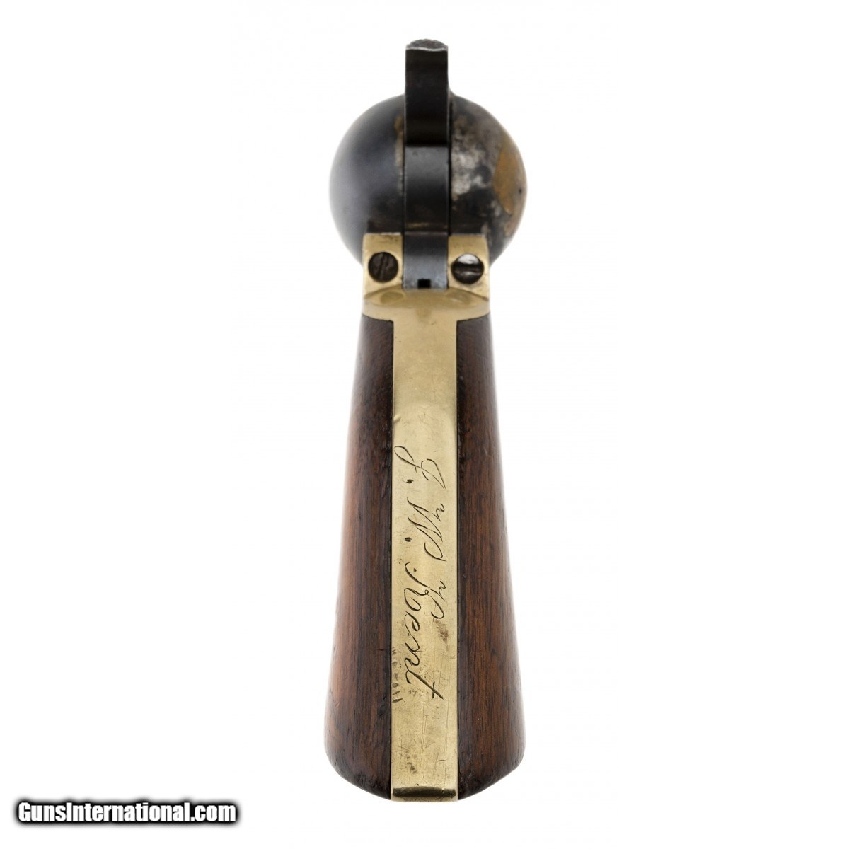 Description: " Single action Colt revolver made in 1853. Has been converted post-Civil War to fire .38 centerfire cartridges. All serials are matching aside from the cylinder which illegible from age. The backstrap has been professionally inscribed ""J.W Kent"" in fine script. The grips are in excellent condition. A fine 1851 conversion. SOLD Antique: Yes |