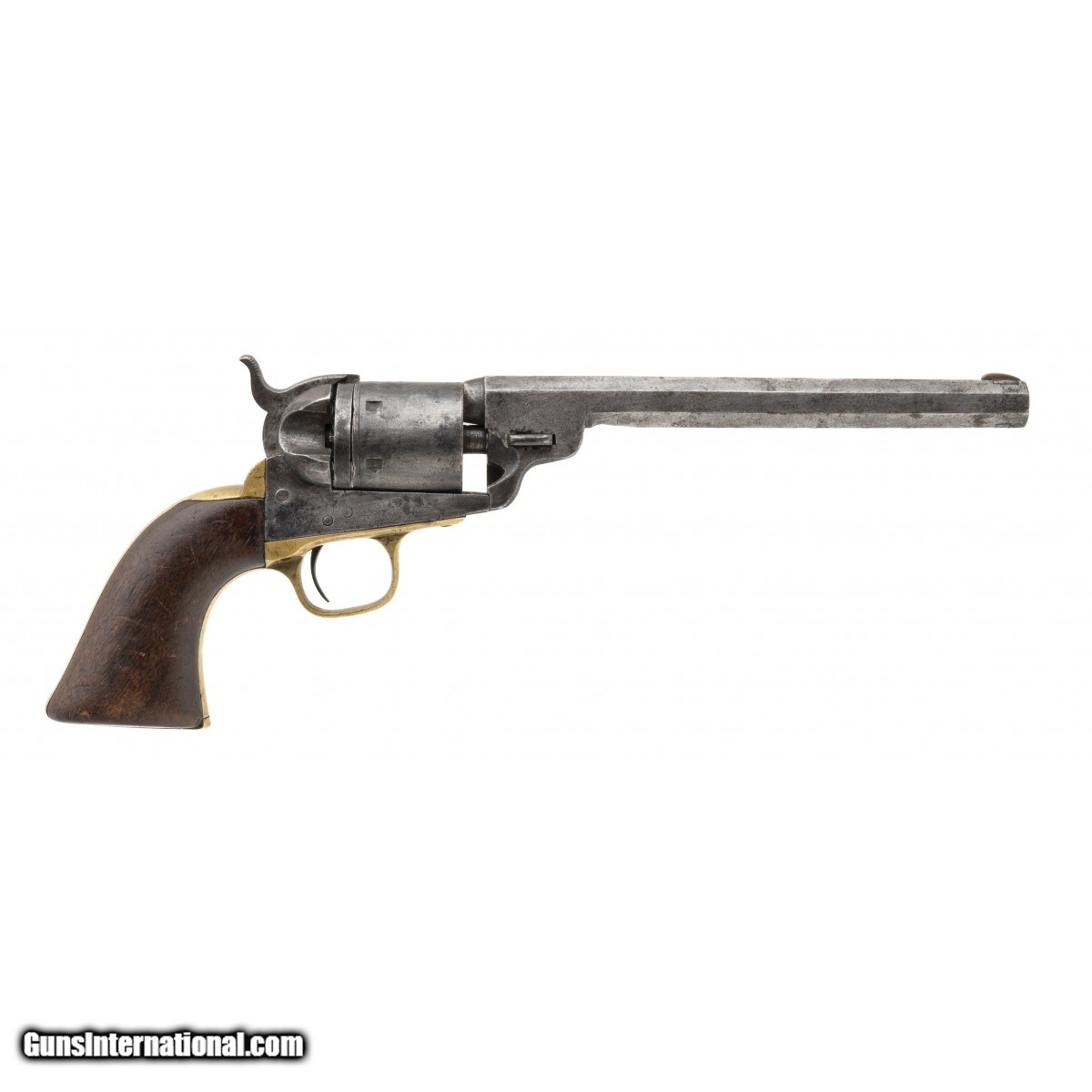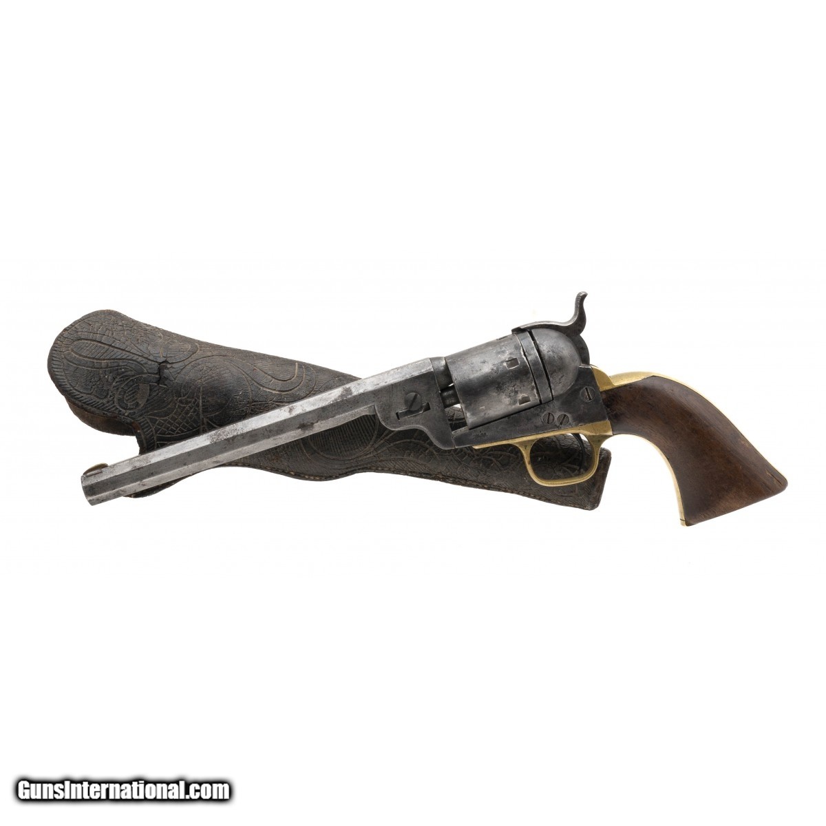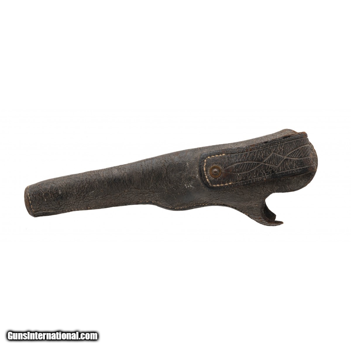 Description: "Serial number 136327. Made in 1863. 36 caliber with a 7 ½" barrel. Nice sharp gun with an even brown patina. The grips are very good. The butt has the initials “F. M. B." This gun comes with a carved slim jim holster. SOLD Antique: Yes |
