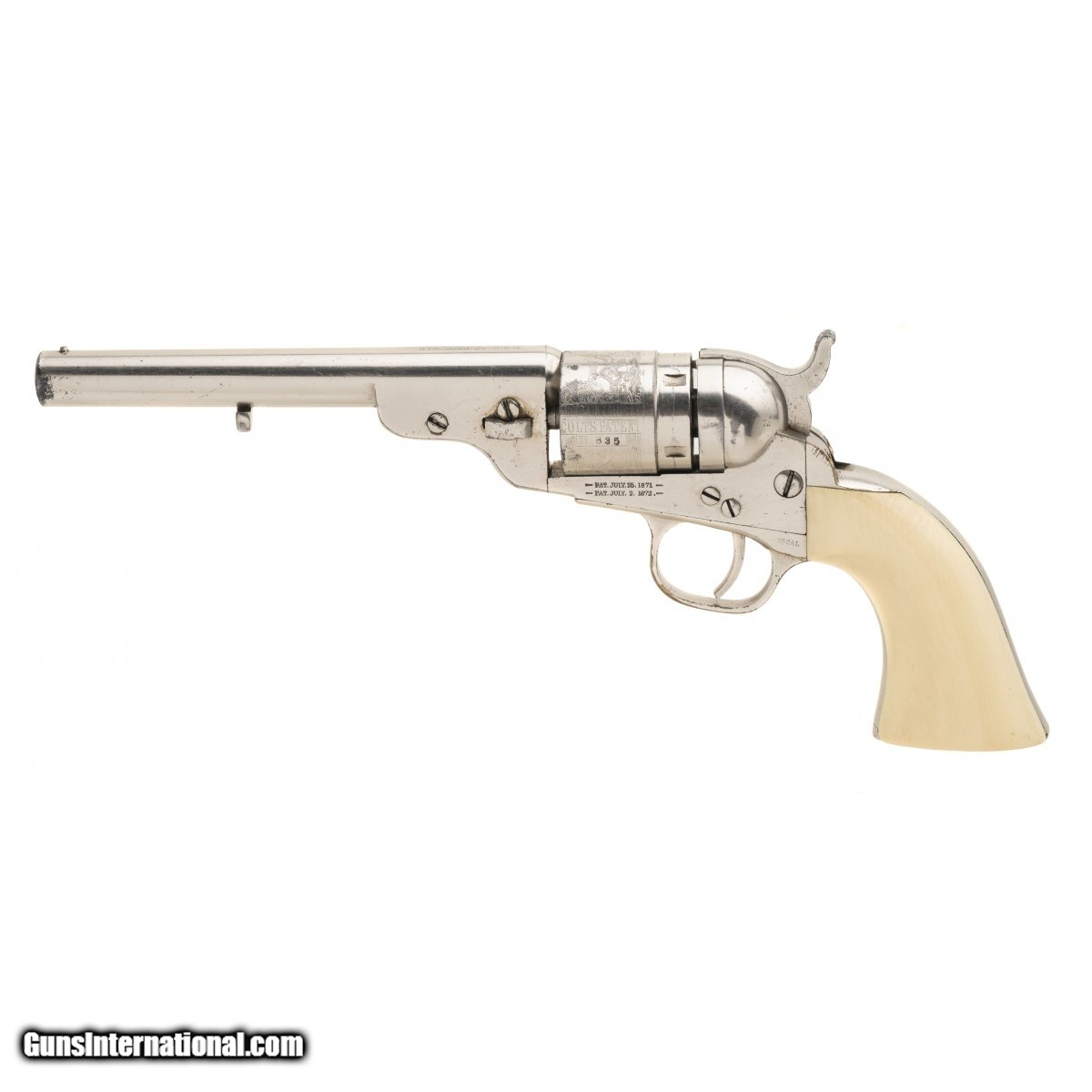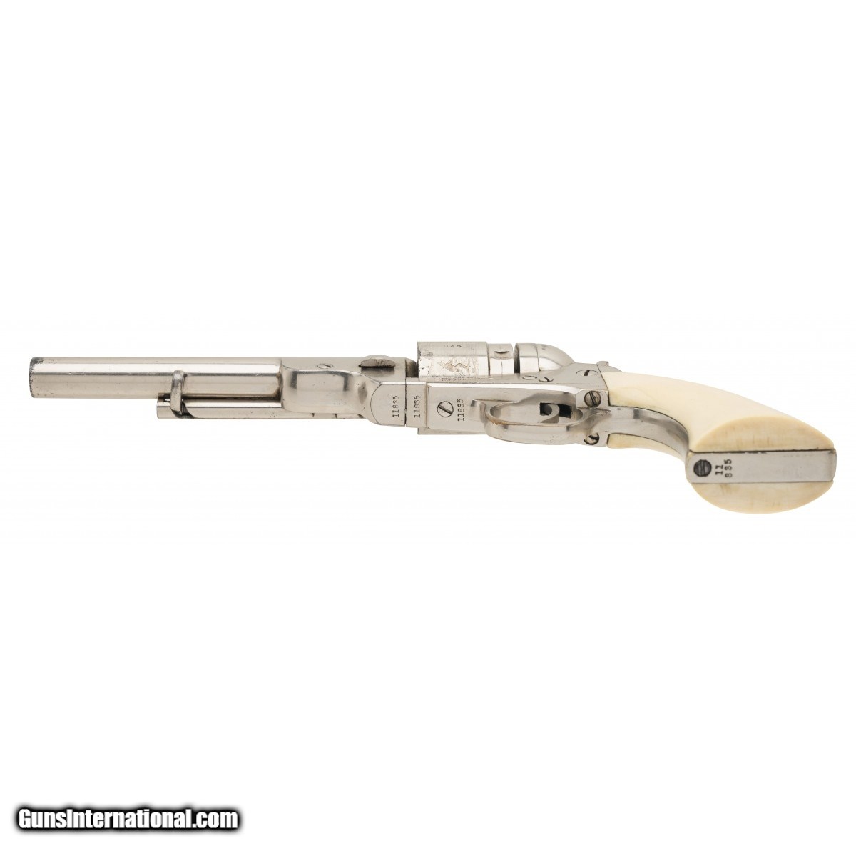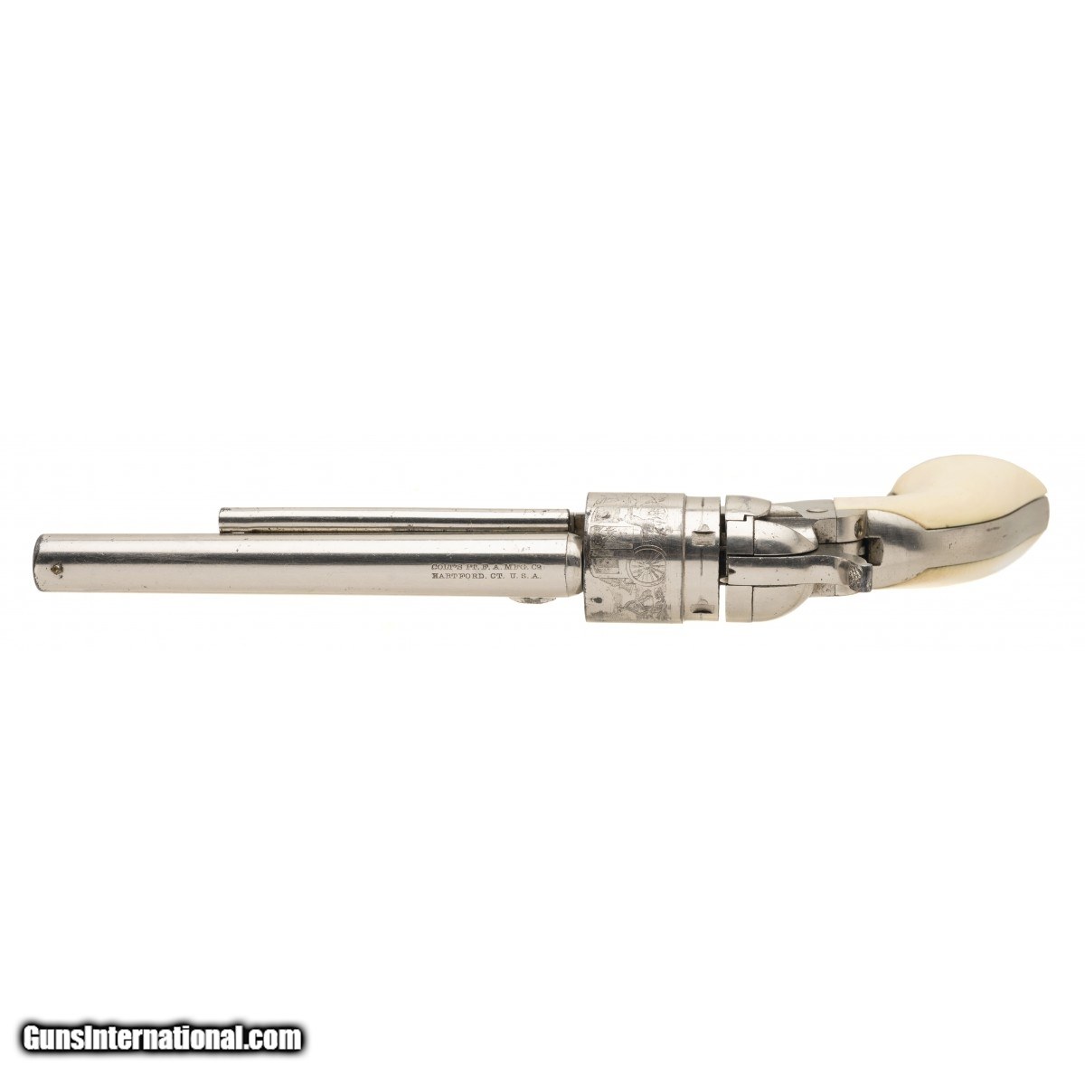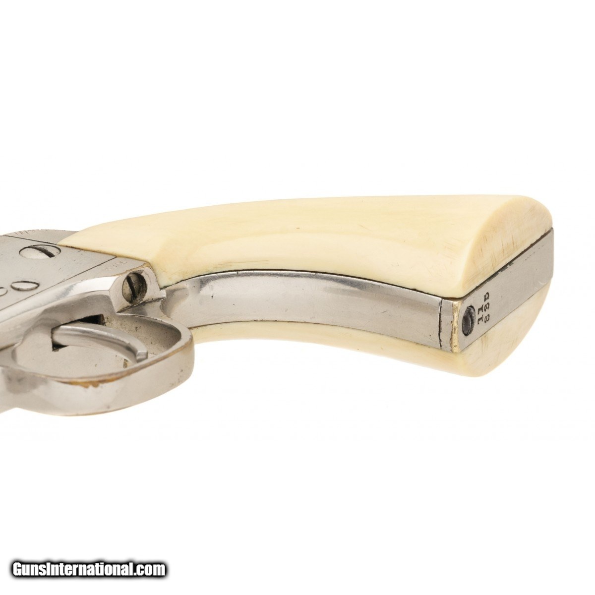 Description: "Serial number 11835. Made late 1860s. 38 RF caliber with a 5 ½". Gun is in near new condition with bright original nickel on metal surfaces. Cylinder scene is excellent. Grips are excellent one piece ivories. (Consignment) SOLD Antique: Yes |