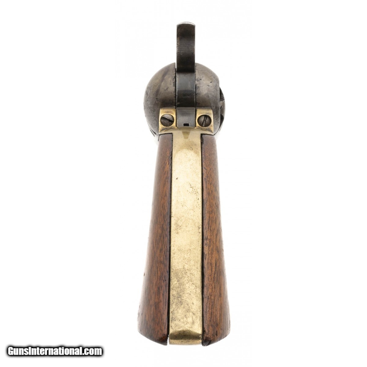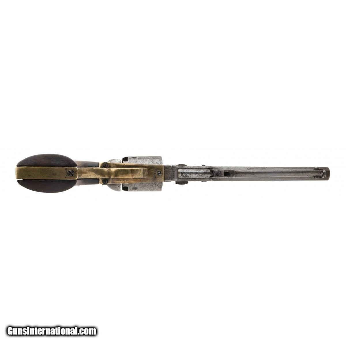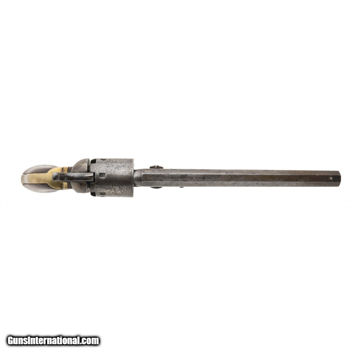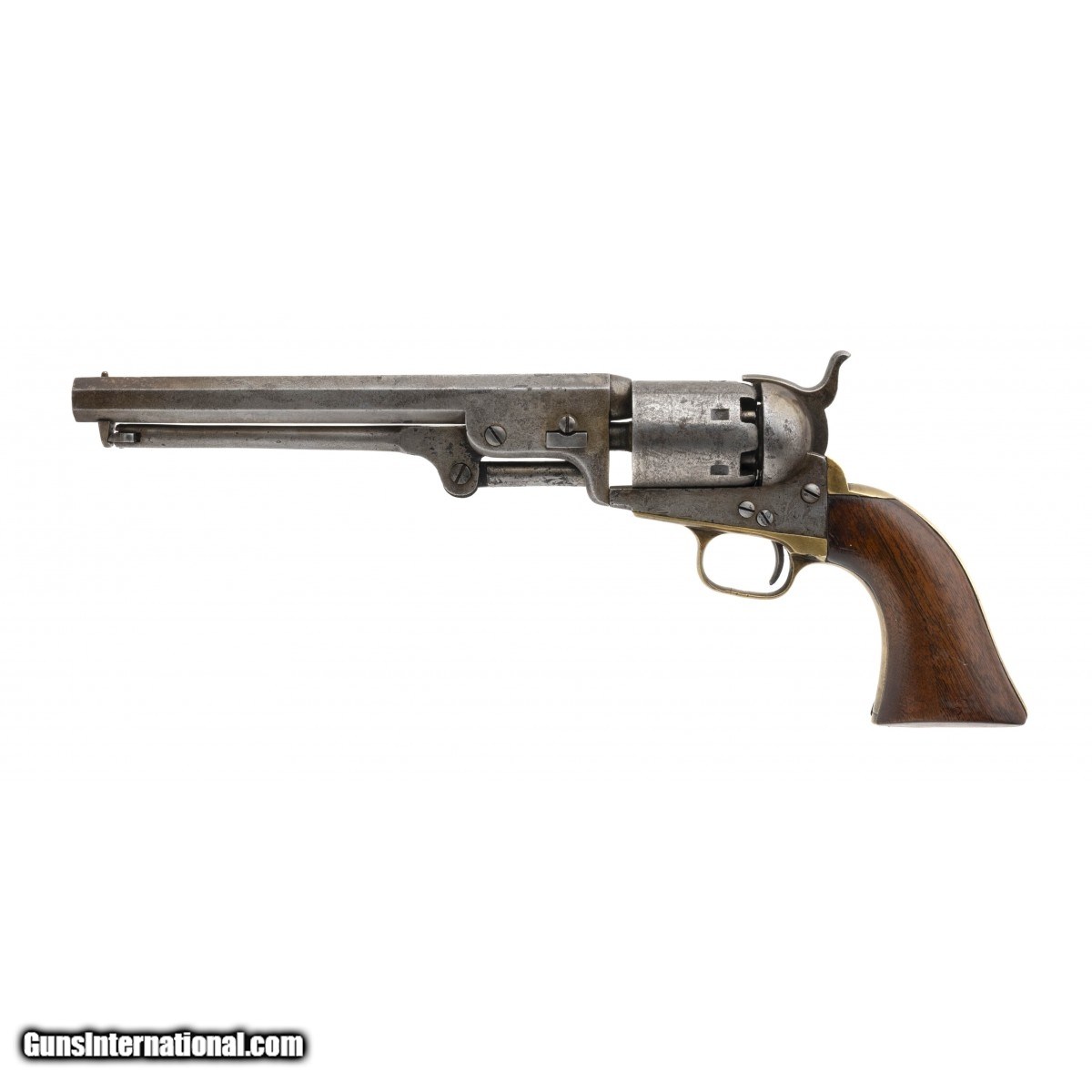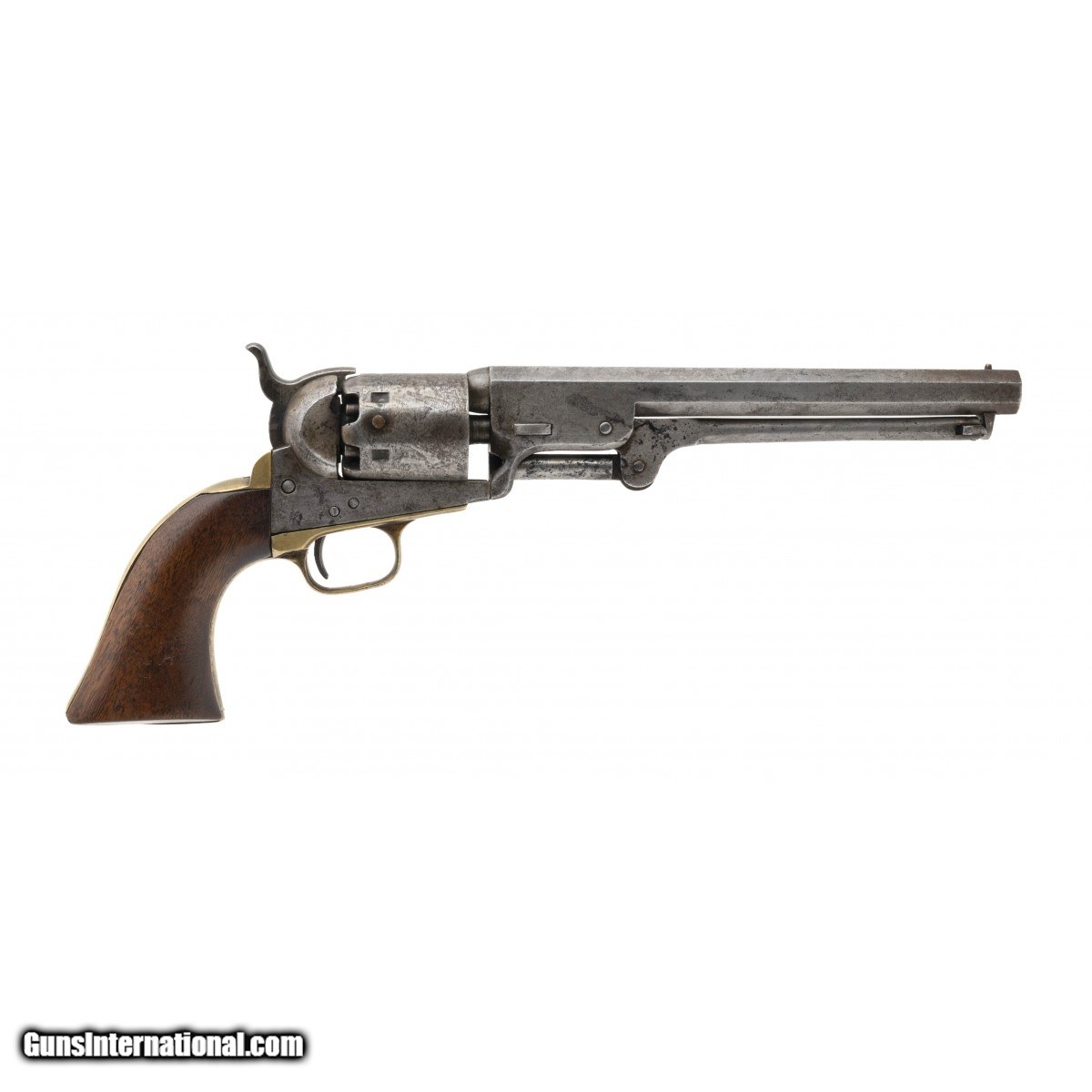 Description: " Serial No.27094, made in 1853, .36 caliber, 7.5"" octagonal barrel. Light grey patina finish with mottled discoloration visible. Serial numbers are matching, wedge is a replacement and unnumbered.Wedge is loose and will fall out. Bore is dark with pitting noted in the grooves, rifling remains. Grips are good with light handling wear noted. Action does not function properly, hammer will cock, cylinder will not turn. Consignment SOLD Antique: Yes |