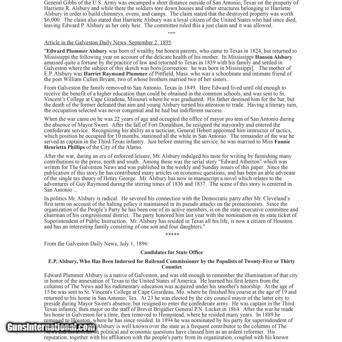 Description: "Serial number 79280. Made in 1857. 36 caliber with a 7 ½" barrel. Nice sharp gun with an even plum patina. Engraving is nice and sharp. Serial numbers are all matching. Back strap is inscribed “Ed. P. Alsbury". Research shows Captain Alsbury served in the 3rd Texas Infantry Co. H 1st Regiment (Luckett's Regt). Edward Plummer Alsbury would enlist as a Lt. on August 1st 1861 and muster out as a Captain on May 26th 1865. Captain Asbury would go one to author a fictional book, Guy Raymond: A Story of the Texas Revolution, based on his families experiences. Captain Asbury is buried at the Hollywood Cemetery in Houston, Texas. SOLD Antique: Yes |