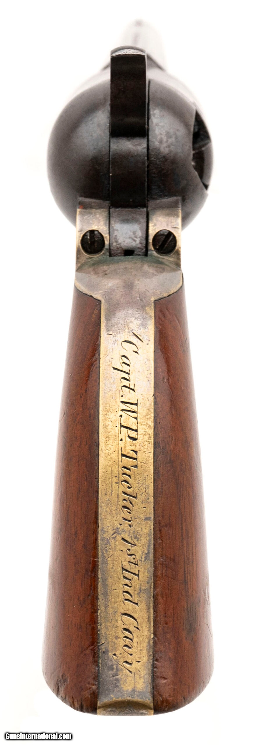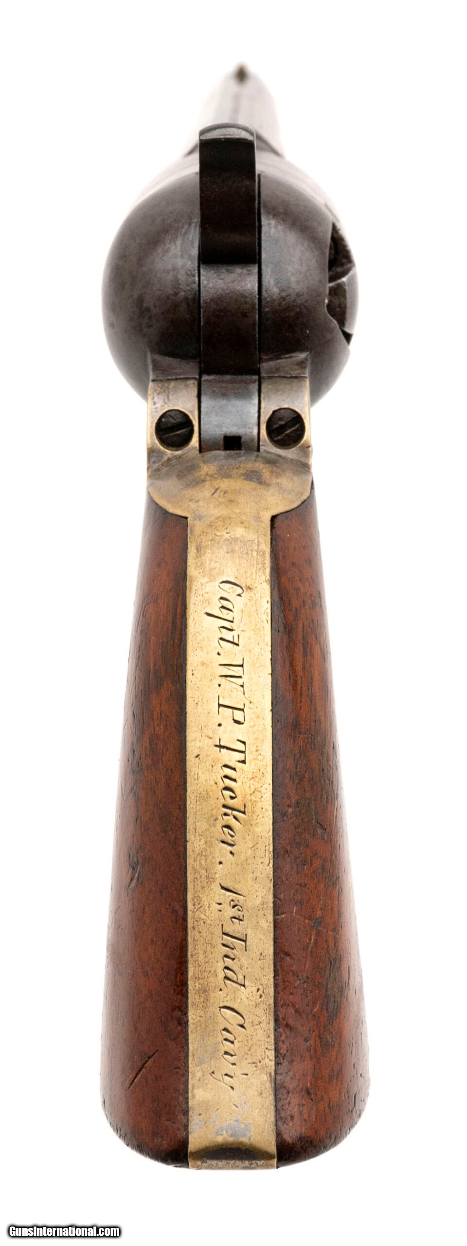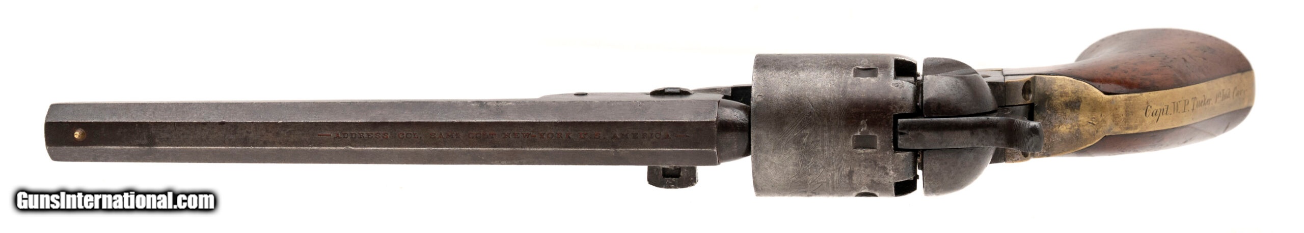 Description: "Serial numbers 142276 & 145073. Made in 1863. Both guns are in 36 caliber and have 7.5" barrels. This is a very sharp pair of guns in almost identical condition. The metal on each gun has a brown to plum colored patina. Both guns have very sharp cylinder scenes These are both civilian gun with varnished grips and both grips have the majority of the varnish remaining. Each trigger guard and back strap have approximately 30% - 40% of the original silver plate. Both back straps are identically inscribed “Capt. W. P. Tucker 1st IND. Cav." William P Tucker was born in 1839 and enlisted on August 20 of 1861 in Evansville, Indianna. He excelled in his unit and was promoted to 2nd Lieutenant on July 8th of 1862 and then to Captain on June 4th of 1864. The 1st Indiana was largely in Missouri and Arkansas. The shining moment for the 1st Indianna was their participation in the Battle of Helena. This was a very important strategic battle that is often overlooked as it took place simultaneously as Gettysburg where the Union forces defeated the much larger Confederate Cavalry lead by General John S. Marmaduke. After the battel of Helena, the participated in The battle of Fourche also known as the battle of Little Rock. Captain Tucker served his 3 years and Mustered out in the March of 1864. Captain Tucker became a Dentist and eventually moved to Los Angeles where he passed away in 1909 at the age of 69 years old. Accompanying this pair is folders of research along with a Newspaper from July14th, 1863 reporting the Battle of Helena. Very neat pair of Colt 1851 Navies that almost certainly saw use in two very important civil war battles! SOLD Antique: Yes |