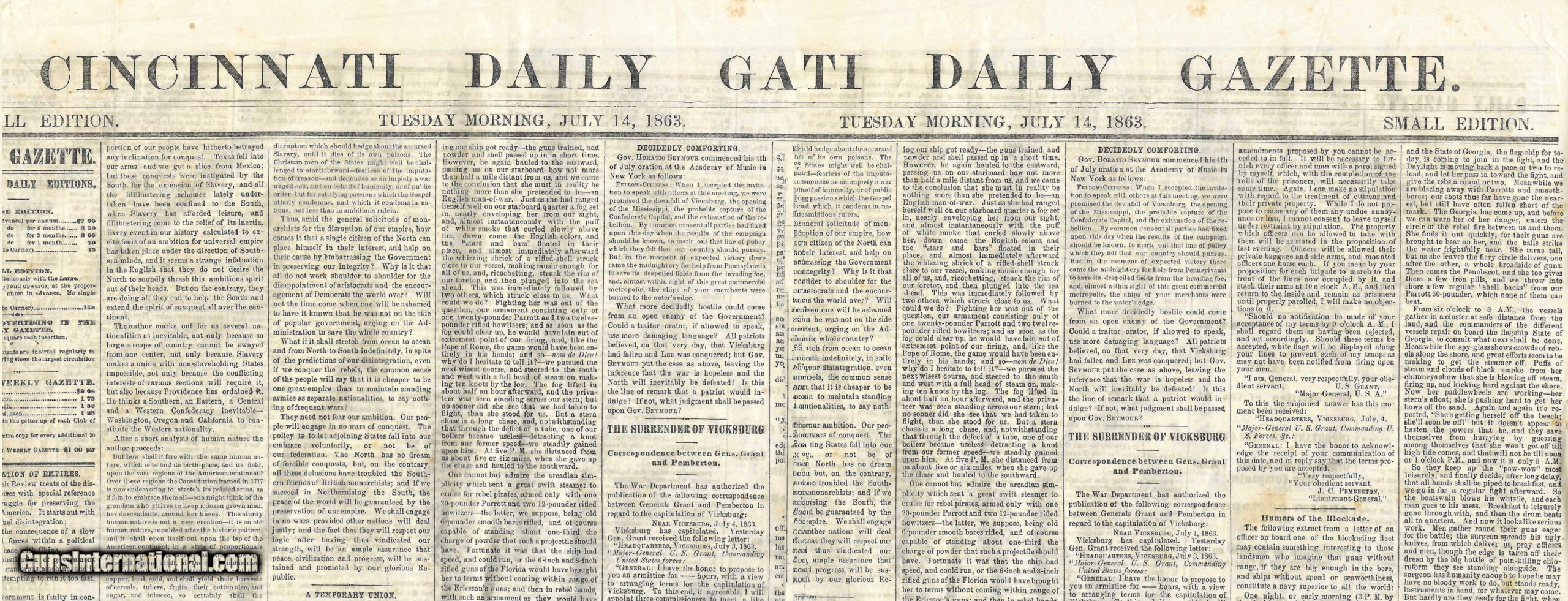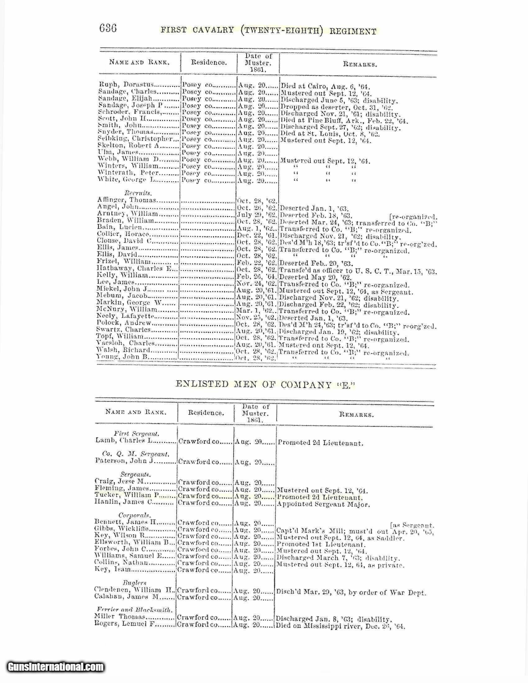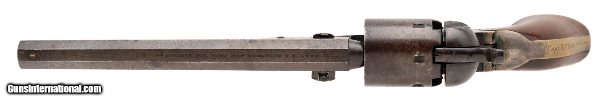 Description: "Serial numbers 142276 & 145073. Made in 1863. Both guns are in 36 caliber and have 7.5" barrels. This is a very sharp pair of guns in almost identical condition. The metal on each gun has a brown to plum colored patina. Both guns have very sharp cylinder scenes These are both civilian gun with varnished grips and both grips have the majority of the varnish remaining. Each trigger guard and back strap have approximately 30% - 40% of the original silver plate. Both back straps are identically inscribed “Capt. W. P. Tucker 1st IND. Cav." William P Tucker was born in 1839 and enlisted on August 20 of 1861 in Evansville, Indianna. He excelled in his unit and was promoted to 2nd Lieutenant on July 8th of 1862 and then to Captain on June 4th of 1864. The 1st Indiana was largely in Missouri and Arkansas. The shining moment for the 1st Indianna was their participation in the Battle of Helena. This was a very important strategic battle that is often overlooked as it took place simultaneously as Gettysburg where the Union forces defeated the much larger Confederate Cavalry lead by General John S. Marmaduke. After the battel of Helena, the participated in The battle of Fourche also known as the battle of Little Rock. Captain Tucker served his 3 years and Mustered out in the March of 1864. Captain Tucker became a Dentist and eventually moved to Los Angeles where he passed away in 1909 at the age of 69 years old. Accompanying this pair is folders of research along with a Newspaper from July14th, 1863 reporting the Battle of Helena. Very neat pair of Colt 1851 Navies that almost certainly saw use in two very important civil war battles! SOLD Antique: Yes |