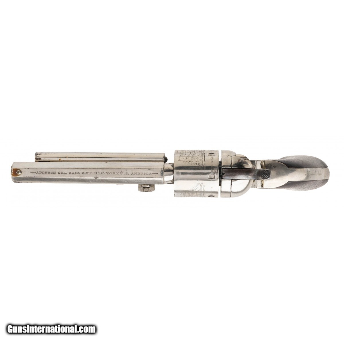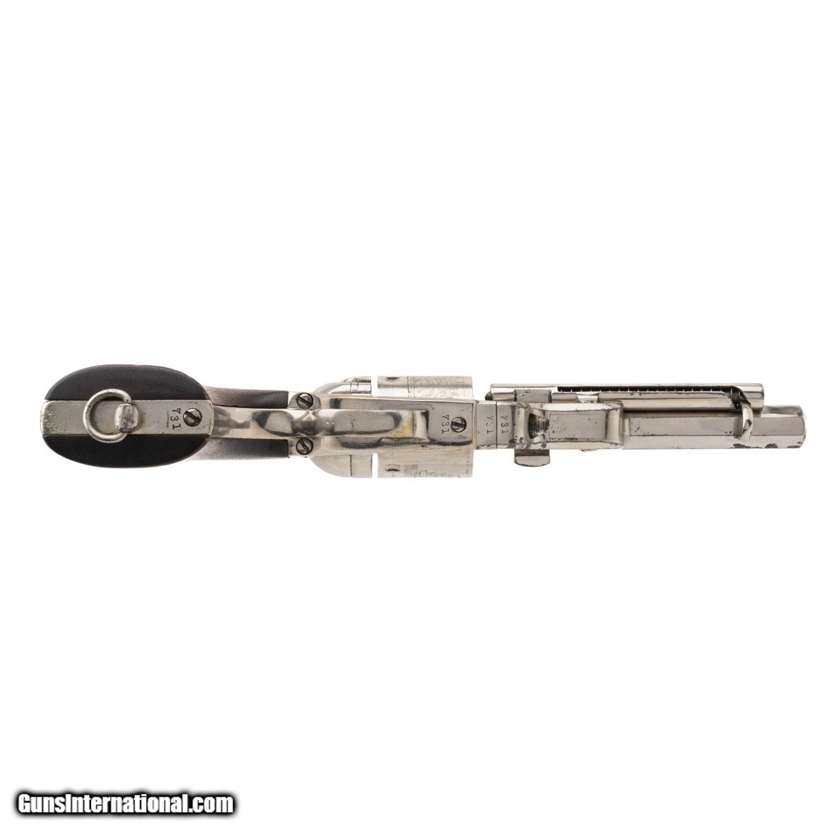 Description: "Serial number 731. Made circa 1870s. 38 Rimfire caliber with a 5" barrel. This gun has been refinished during the period of use. Cylinder scene still remain. The barrel has been shortened and the muzzle is nicely crowned. The grips are modern replacement. The action works perfectly. The back strap is inscribed “Herbert Miller" SOLD Antique: Yes |