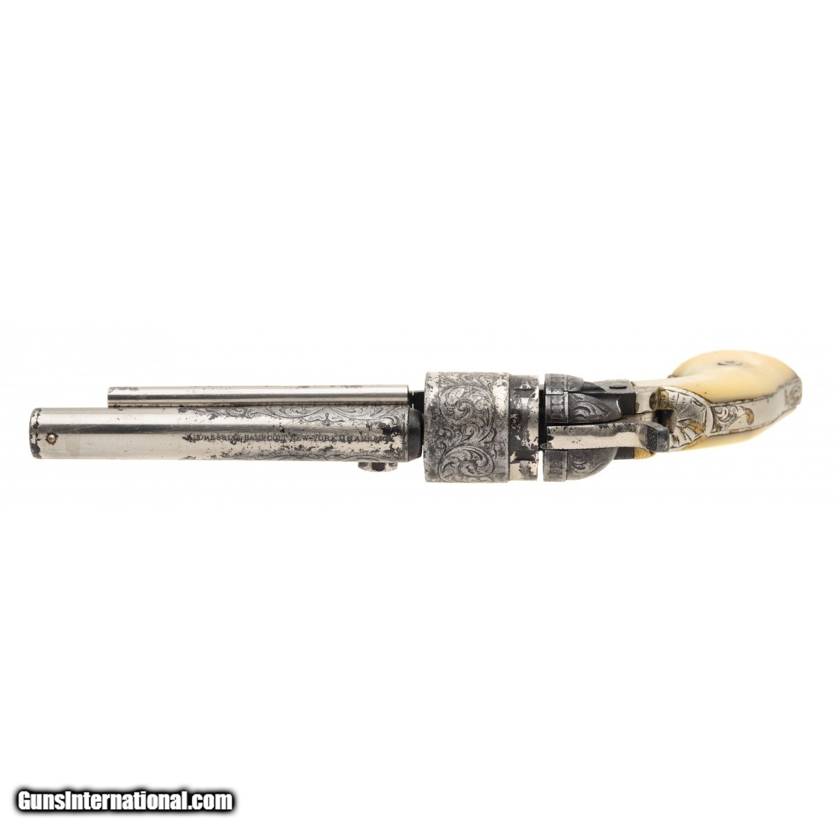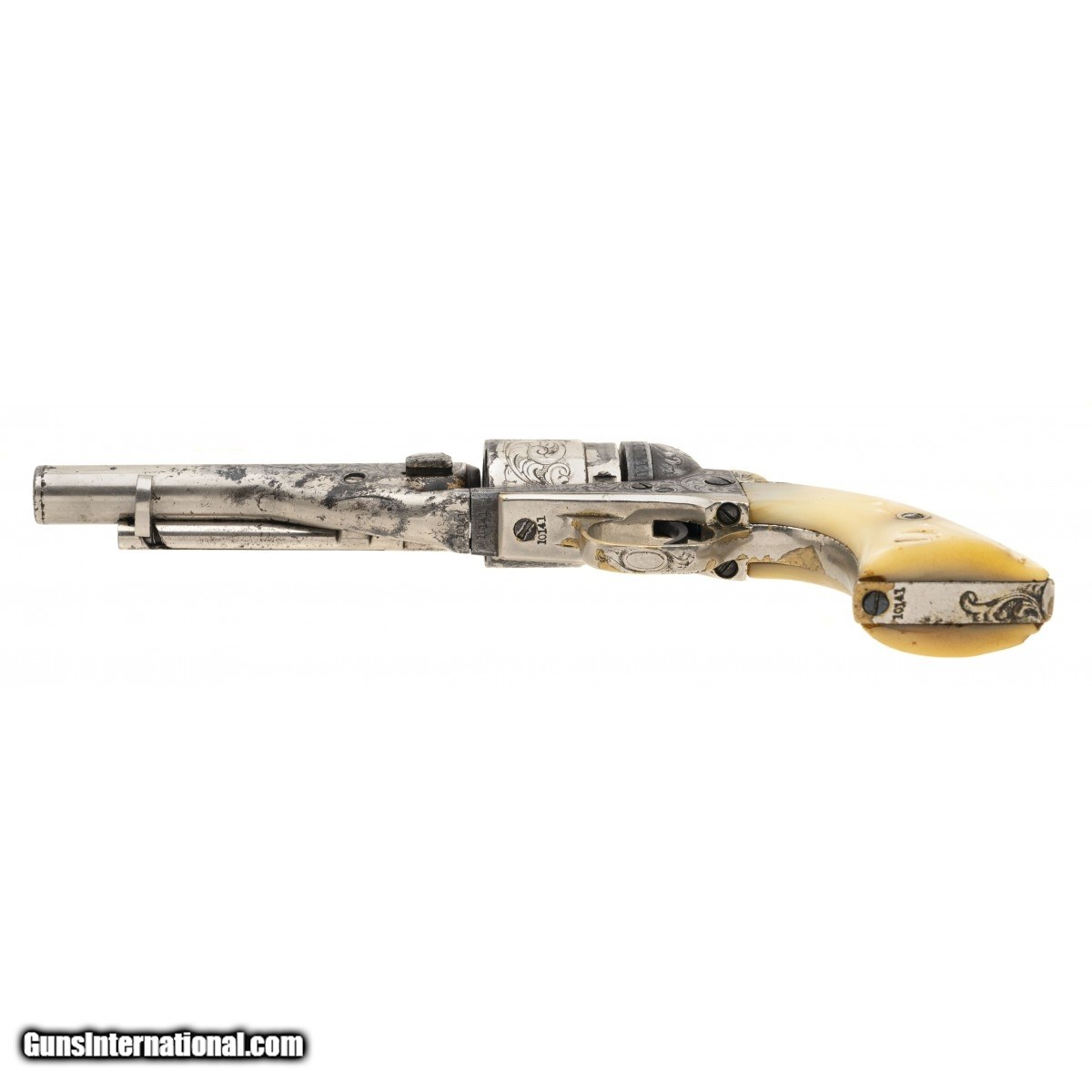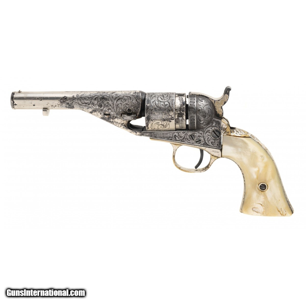 Description: "Serial number 10141. Made circa late 1860s to early 1870s. 38 Rimfire caliber with 4 ½" barrel. Very nice sharp gun with 50% or the period nickel finish. This gun is New York engraved and period. The grips are excellent two piece pearls. Action revolves and locks up on most of the notches. The wedge screw is broken. SOLD Antique: Yes |