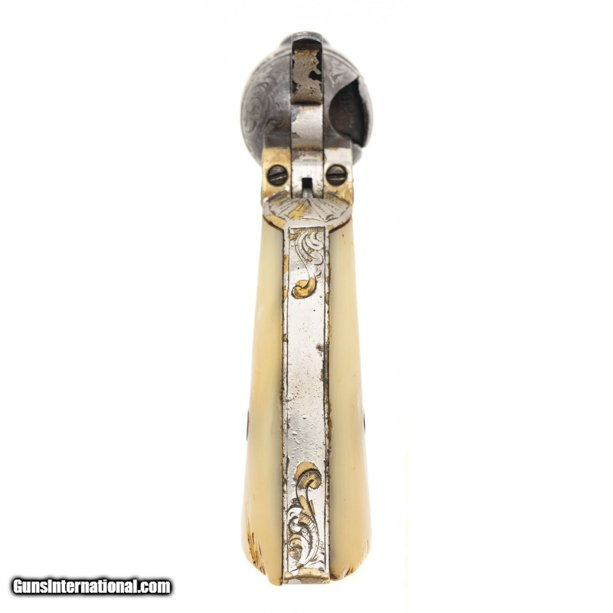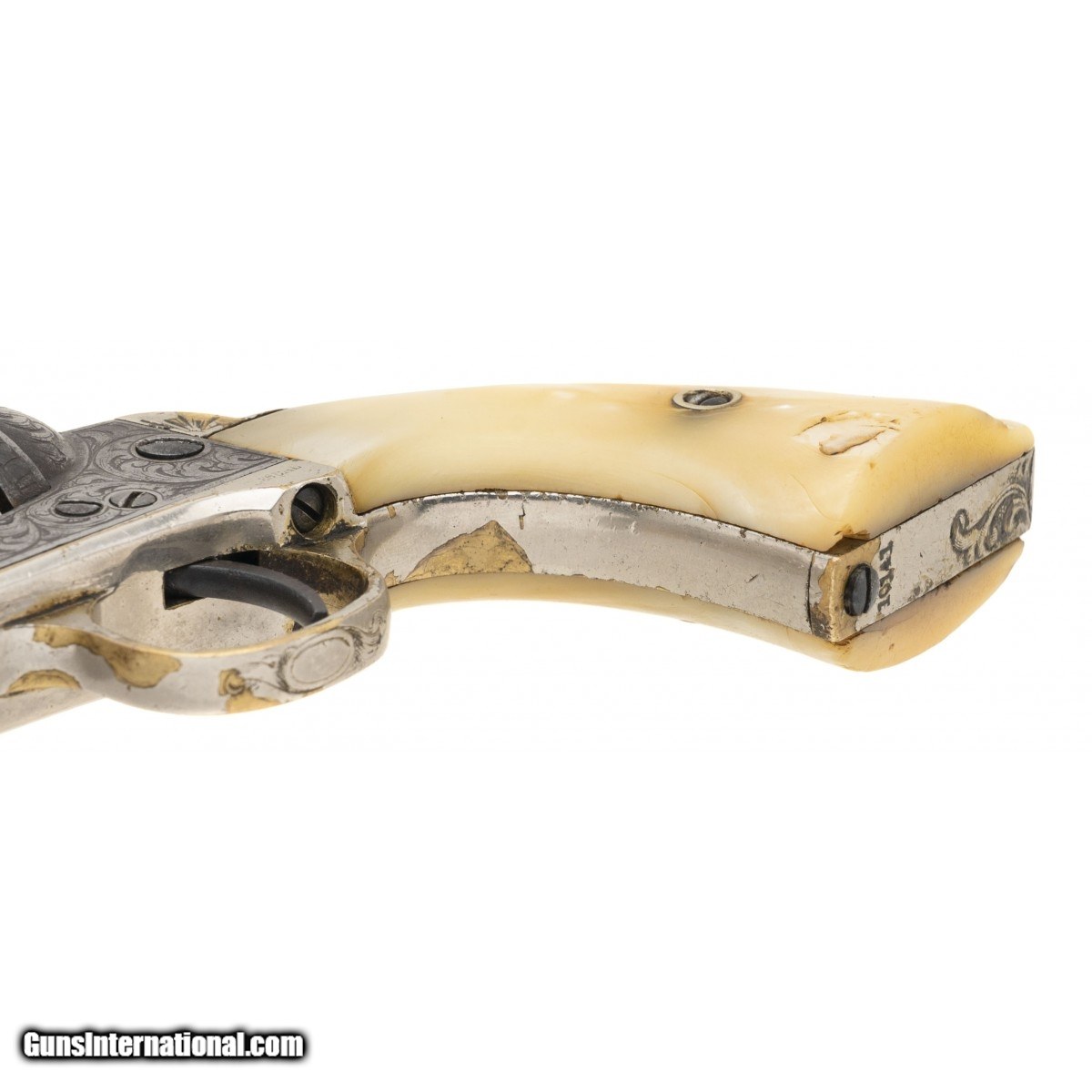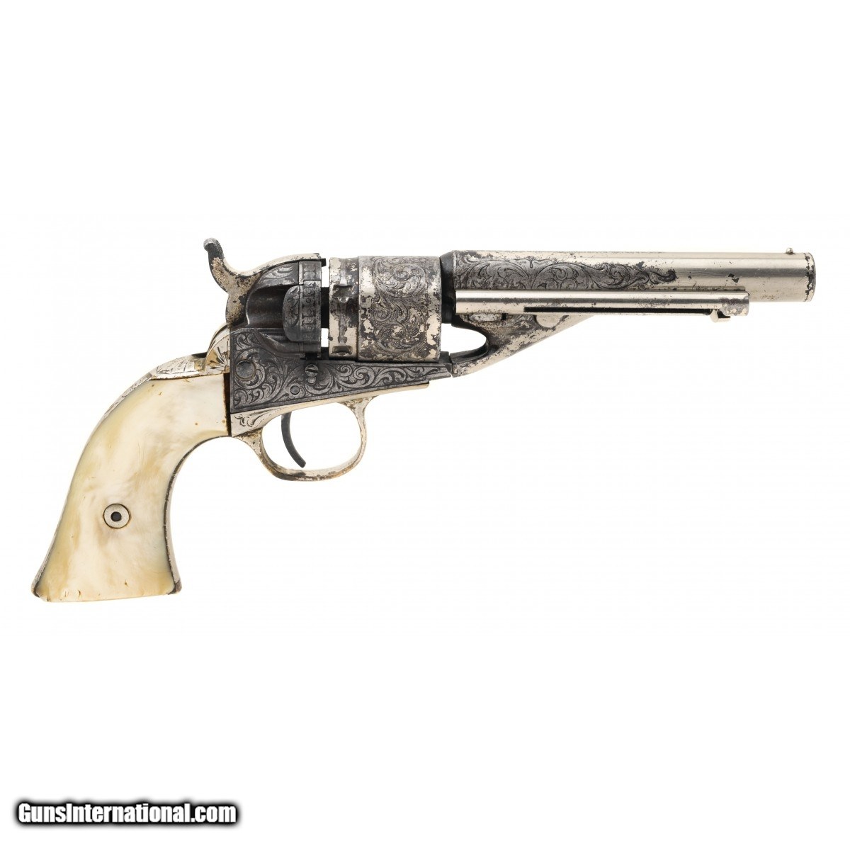 Description: "Serial number 10141. Made circa late 1860s to early 1870s. 38 Rimfire caliber with 4 ½" barrel. Very nice sharp gun with 50% or the period nickel finish. This gun is New York engraved and period. The grips are excellent two piece pearls. Action revolves and locks up on most of the notches. The wedge screw is broken. SOLD Antique: Yes |