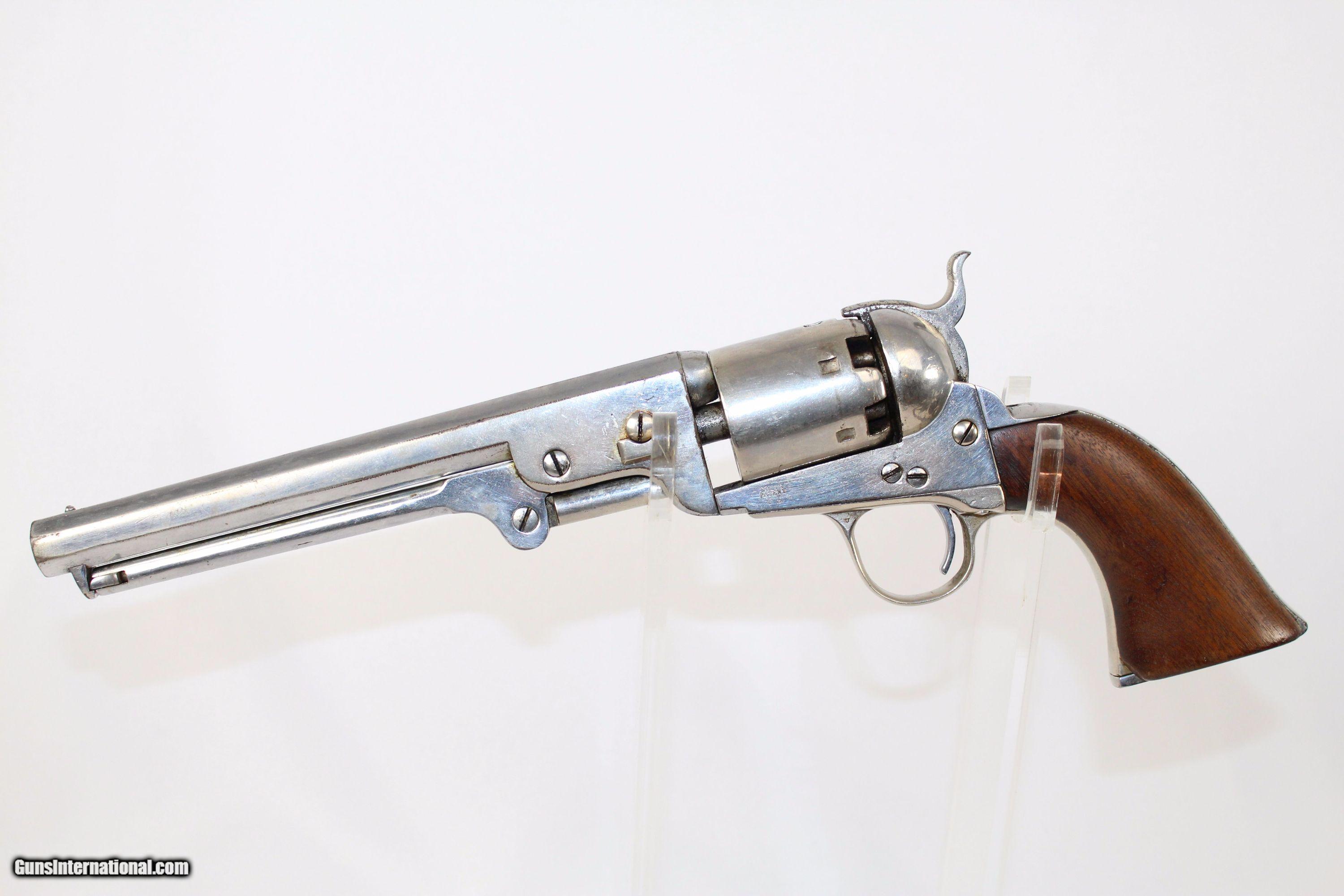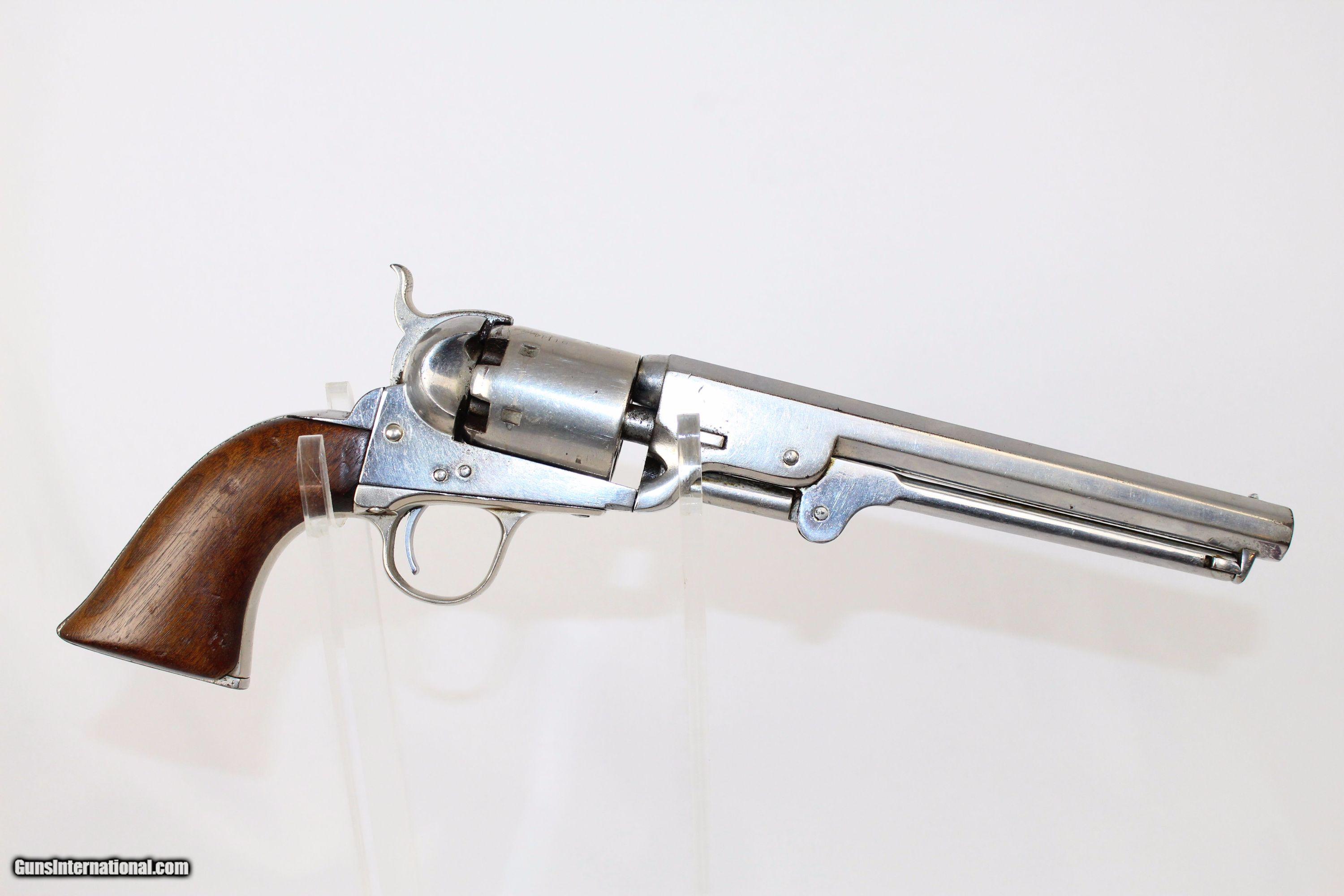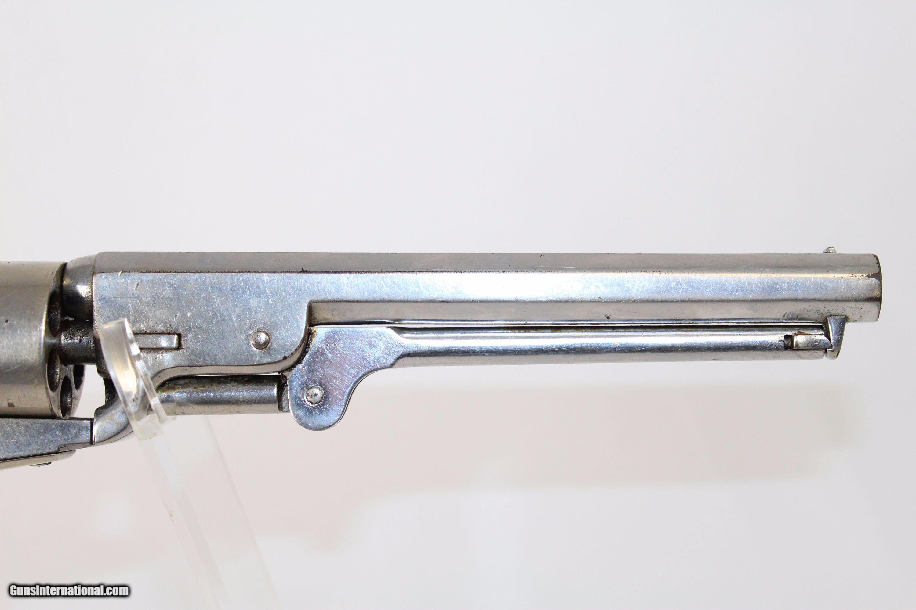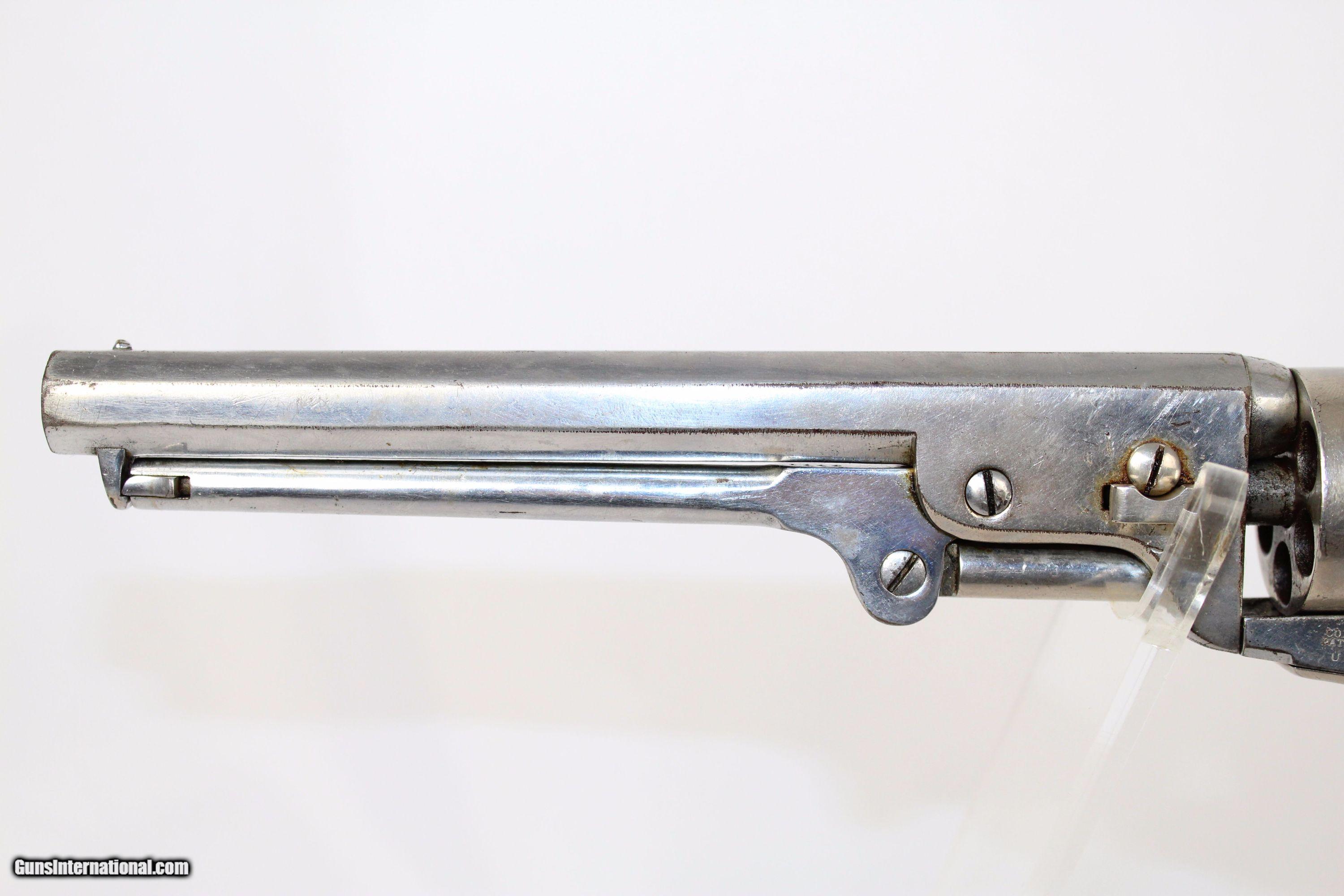 Description: “U.S.N.” MARKED Antique COLT 1851 NAVY Revolver Only 2,000 So Marked, Made in 1856 Here we present an antique Colt 1851 Percussion Navy, made in 1856 in Hartford, Connecticut. Samuel Colt gained an enormous client when the US Army adopted his Model 1860 Army Revolver, but he struggled fruitlessly to get his 1851 Navy Revolver to be adopted by the US Navy. Only 2,000 1851 Navies were purchased by the US Navy. This one is correctly marked “U.S.” under “COLT’S/PATENT” on the left side of the frame, and “U.S.N.” on the bottom of the grip frame. This revolver’s serial number also coincides with the range of those known to have been purchased by the US government: 55500 to 62000. The top of the barrel is marked “—ADDRESS SAML COLT NEW-YORK CITY—”. The overall condition is good. The gun has been refinished in nickel. The markings on the top of the barrel are a bit shy, as is the “U.S.N” marking on the grip strap, indicating that these were polished during the refinish process. The serial numbers have been re-stamped and all numbers match. Wedge is unnumbered. The grips are also refinished. The bore has strong rifling. The action is excellent. Own the original! This is a legitimate antique and not a reproduction. Barrel is 7-1/2 inches. Caliber: .36 Percussion Overall condition as seen in photos. Very Fast. Very Safe. FREE SHIPPING WORLDWIDE. Delivered directly to your door by express mail! Guaranteed AUTHENTIC & Includes CERTIFICATE OF AUTHENTICITY. ancestryguns $2000 #5025 SOLD Antique: Yes |