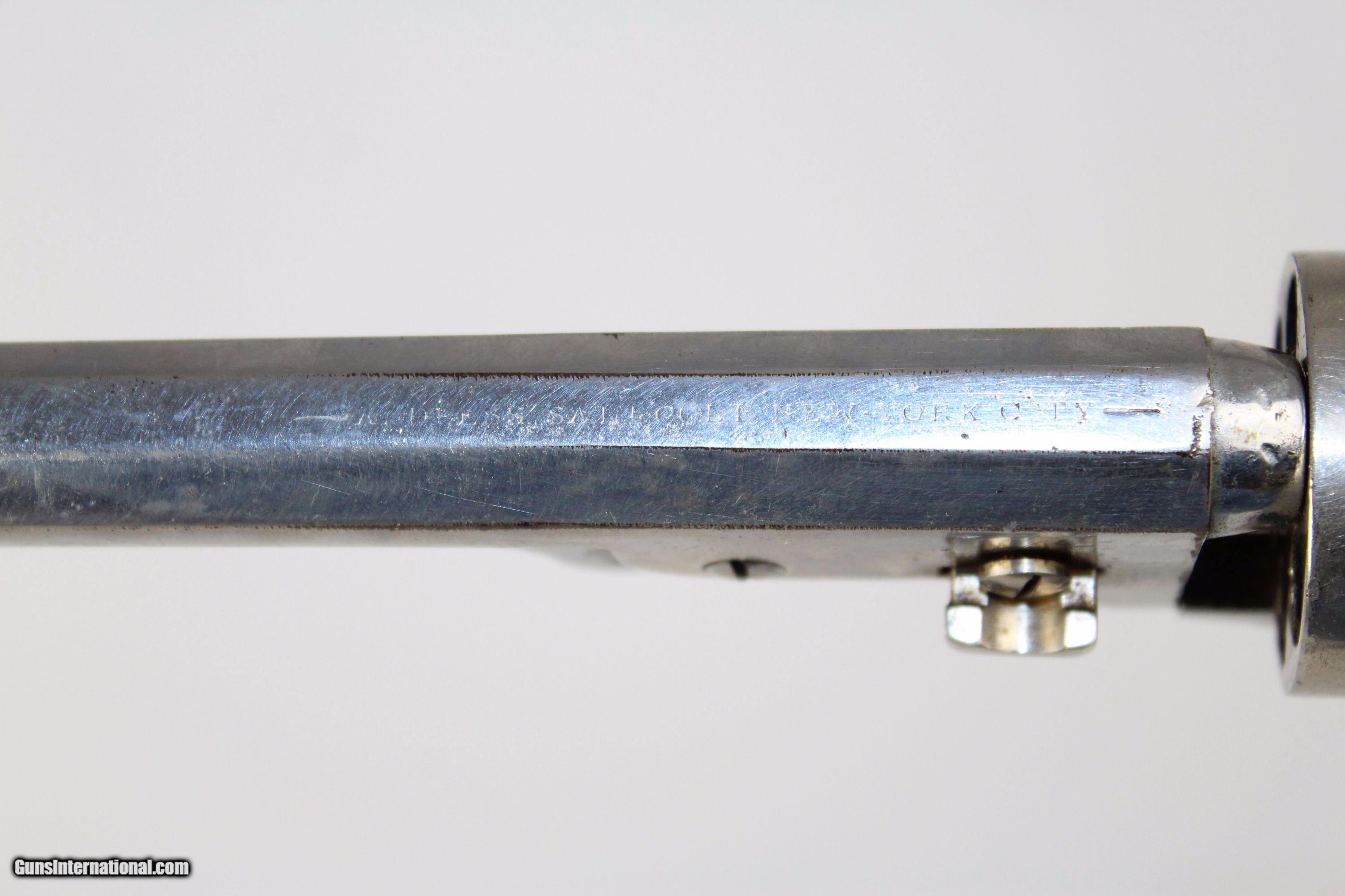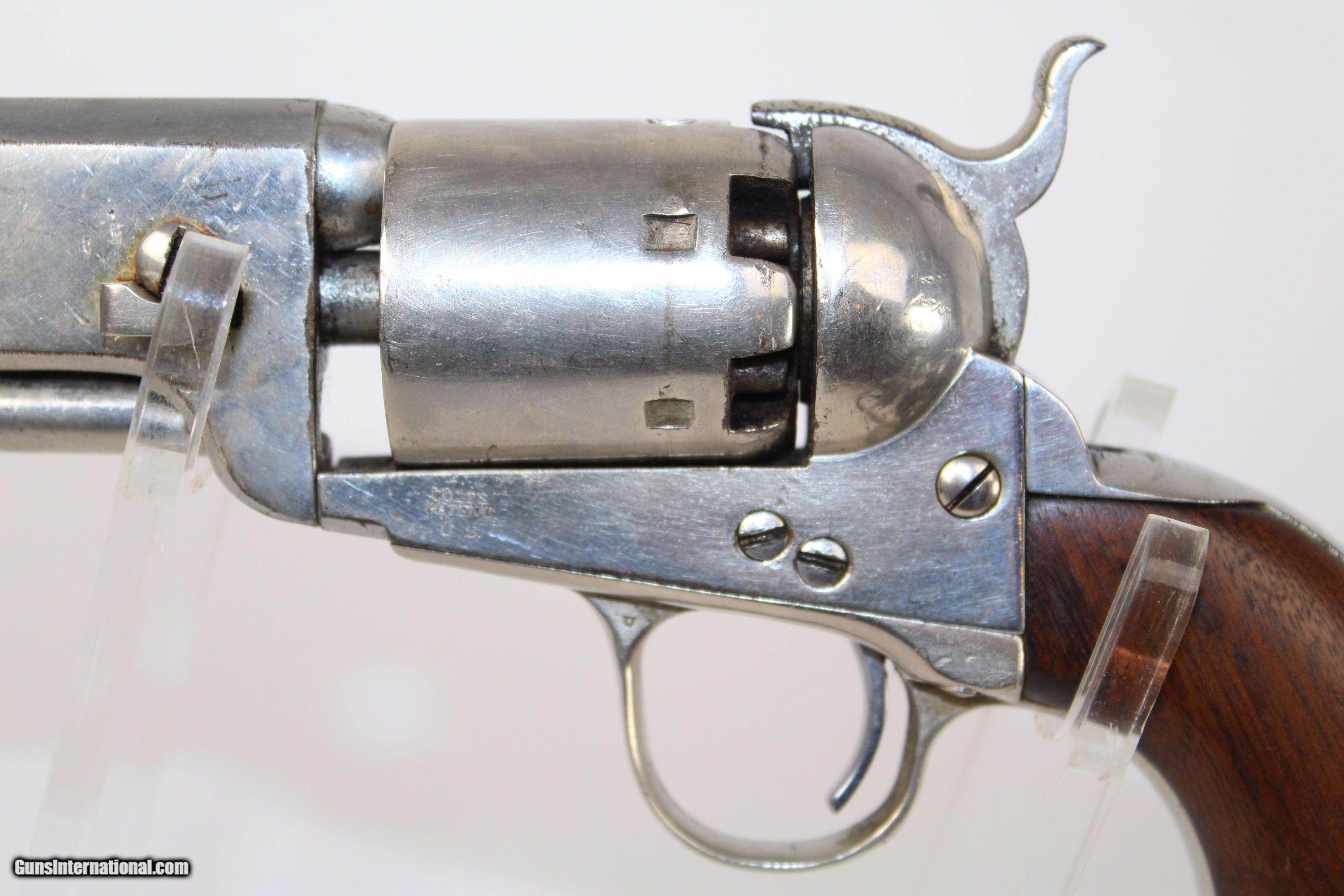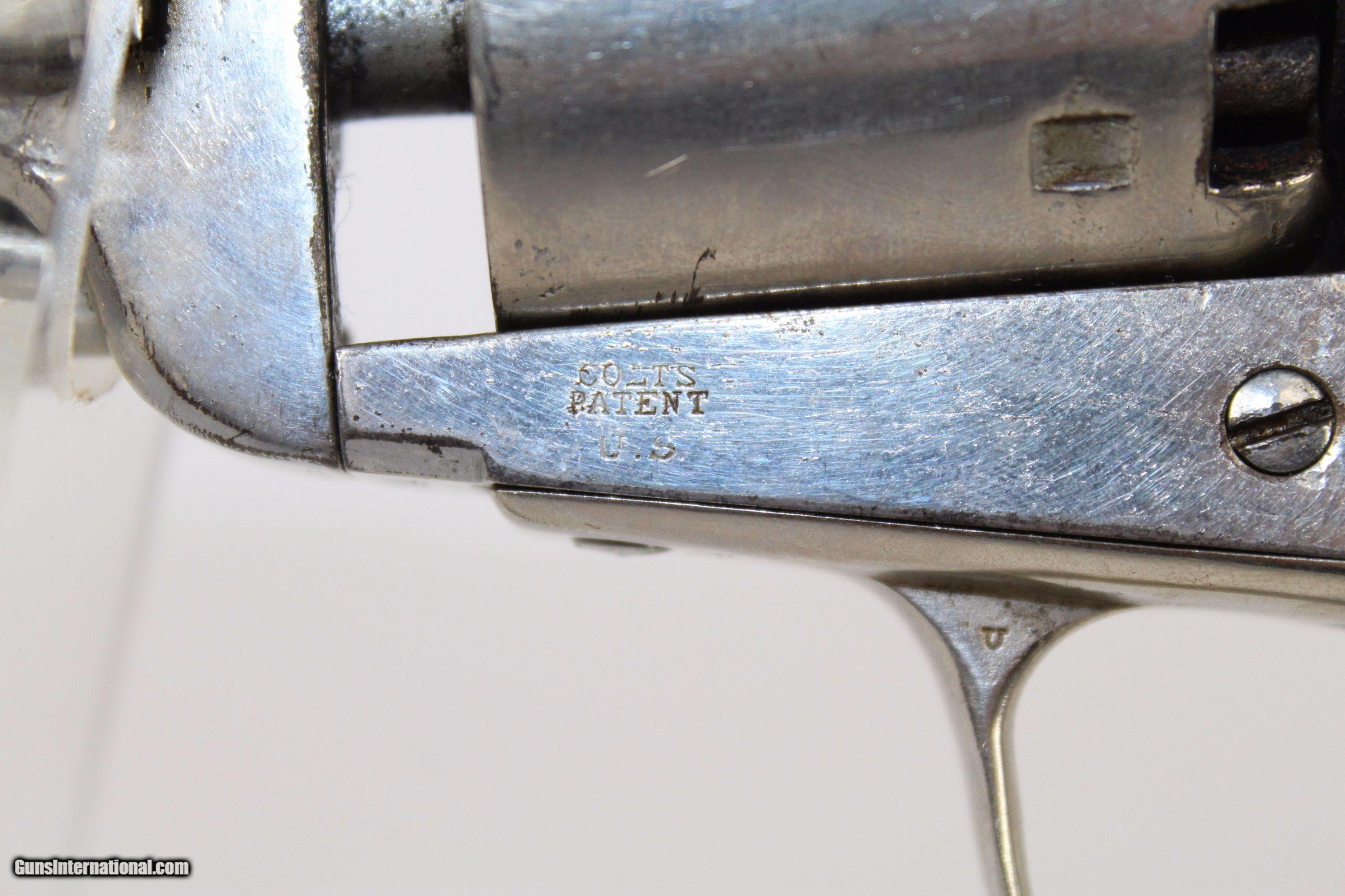 Description: “U.S.N.” MARKED Antique COLT 1851 NAVY Revolver Only 2,000 So Marked, Made in 1856 Here we present an antique Colt 1851 Percussion Navy, made in 1856 in Hartford, Connecticut. Samuel Colt gained an enormous client when the US Army adopted his Model 1860 Army Revolver, but he struggled fruitlessly to get his 1851 Navy Revolver to be adopted by the US Navy. Only 2,000 1851 Navies were purchased by the US Navy. This one is correctly marked “U.S.” under “COLT’S/PATENT” on the left side of the frame, and “U.S.N.” on the bottom of the grip frame. This revolver’s serial number also coincides with the range of those known to have been purchased by the US government: 55500 to 62000. The top of the barrel is marked “—ADDRESS SAML COLT NEW-YORK CITY—”. The overall condition is good. The gun has been refinished in nickel. The markings on the top of the barrel are a bit shy, as is the “U.S.N” marking on the grip strap, indicating that these were polished during the refinish process. The serial numbers have been re-stamped and all numbers match. Wedge is unnumbered. The grips are also refinished. The bore has strong rifling. The action is excellent. Own the original! This is a legitimate antique and not a reproduction. Barrel is 7-1/2 inches. Caliber: .36 Percussion Overall condition as seen in photos. Very Fast. Very Safe. FREE SHIPPING WORLDWIDE. Delivered directly to your door by express mail! Guaranteed AUTHENTIC & Includes CERTIFICATE OF AUTHENTICITY. ancestryguns $2000 #5025 SOLD Antique: Yes |