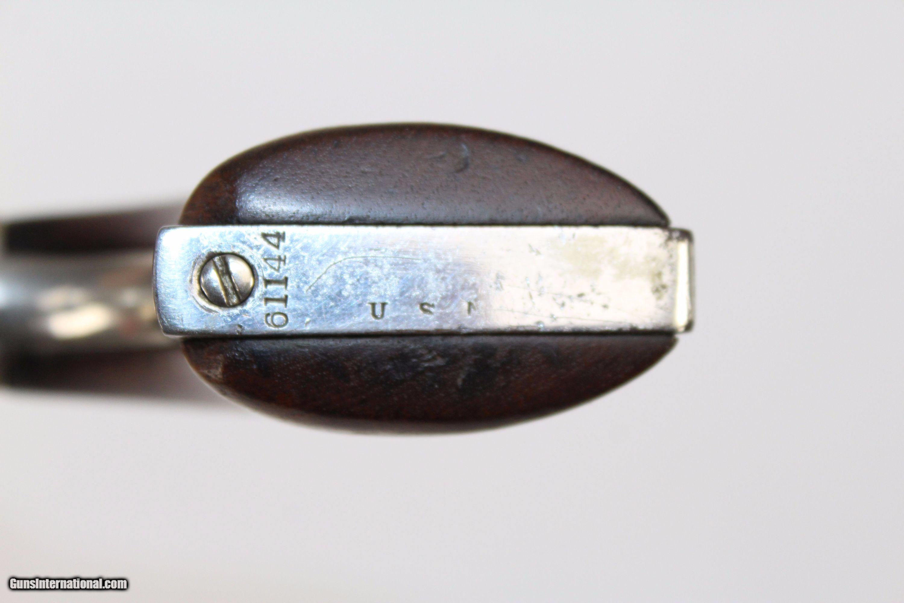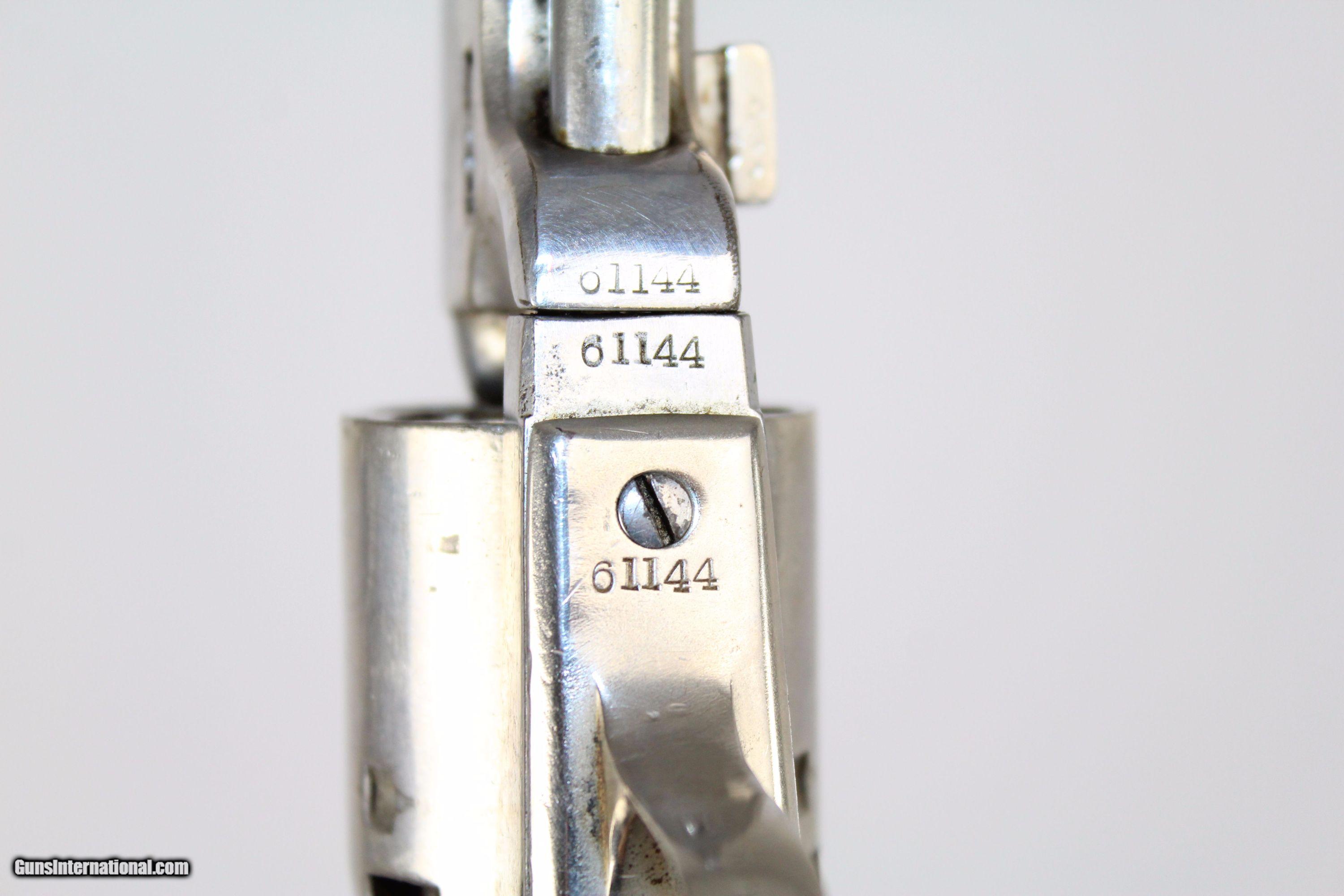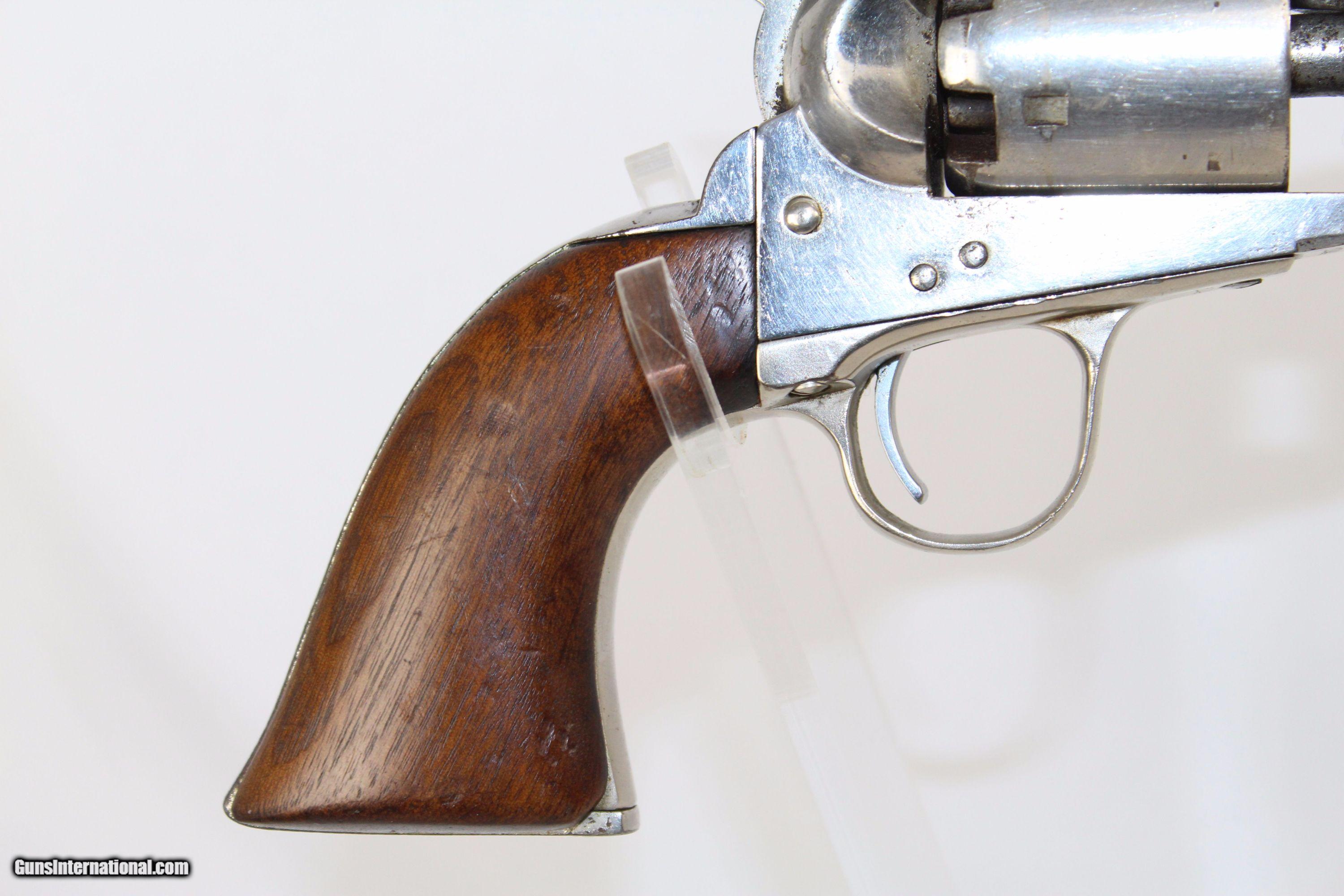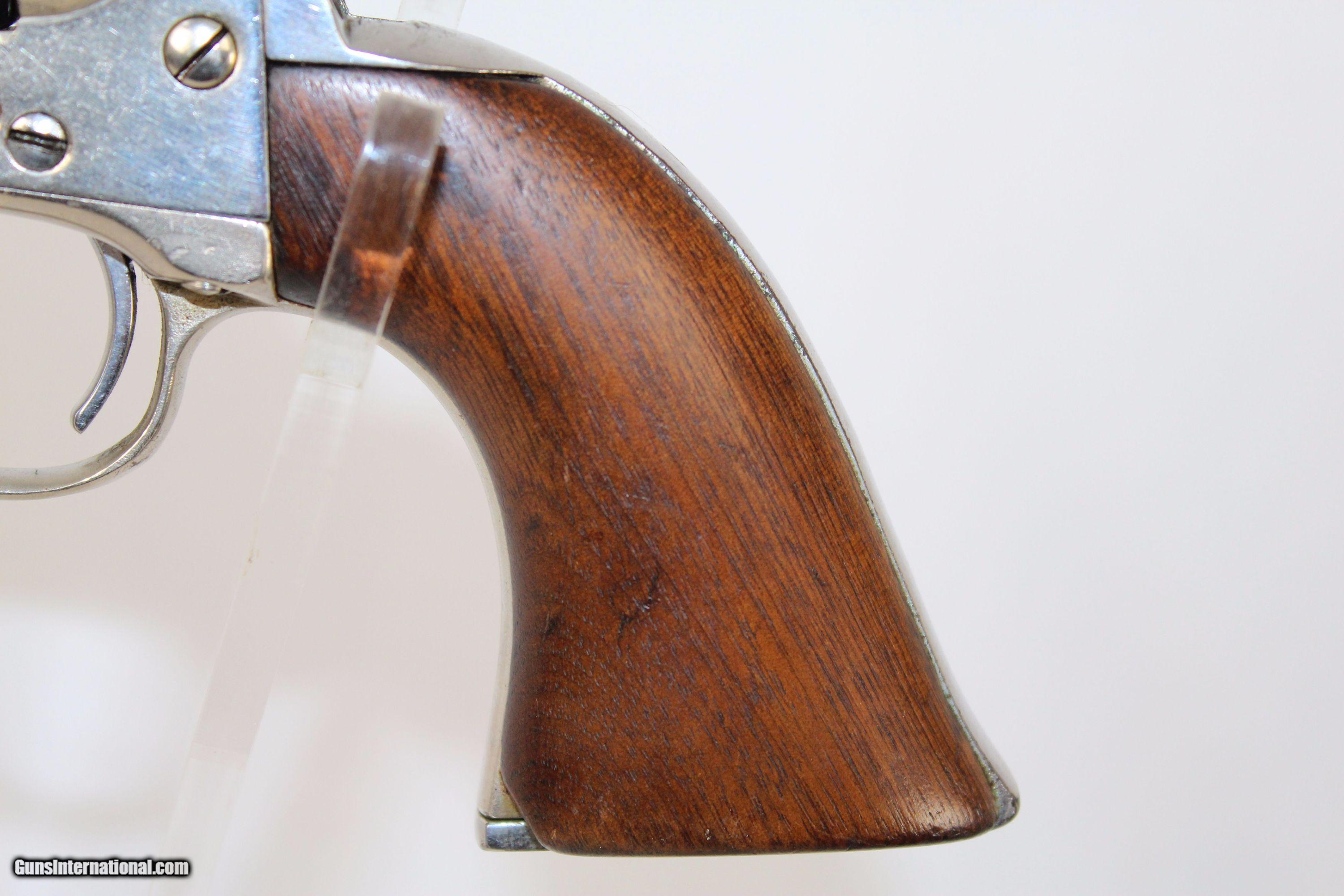 Description: “U.S.N.” MARKED Antique COLT 1851 NAVY Revolver Only 2,000 So Marked, Made in 1856 Here we present an antique Colt 1851 Percussion Navy, made in 1856 in Hartford, Connecticut. Samuel Colt gained an enormous client when the US Army adopted his Model 1860 Army Revolver, but he struggled fruitlessly to get his 1851 Navy Revolver to be adopted by the US Navy. Only 2,000 1851 Navies were purchased by the US Navy. This one is correctly marked “U.S.” under “COLT’S/PATENT” on the left side of the frame, and “U.S.N.” on the bottom of the grip frame. This revolver’s serial number also coincides with the range of those known to have been purchased by the US government: 55500 to 62000. The top of the barrel is marked “—ADDRESS SAML COLT NEW-YORK CITY—”. The overall condition is good. The gun has been refinished in nickel. The markings on the top of the barrel are a bit shy, as is the “U.S.N” marking on the grip strap, indicating that these were polished during the refinish process. The serial numbers have been re-stamped and all numbers match. Wedge is unnumbered. The grips are also refinished. The bore has strong rifling. The action is excellent. Own the original! This is a legitimate antique and not a reproduction. Barrel is 7-1/2 inches. Caliber: .36 Percussion Overall condition as seen in photos. Very Fast. Very Safe. FREE SHIPPING WORLDWIDE. Delivered directly to your door by express mail! Guaranteed AUTHENTIC & Includes CERTIFICATE OF AUTHENTICITY. ancestryguns $2000 #5025 SOLD Antique: Yes |