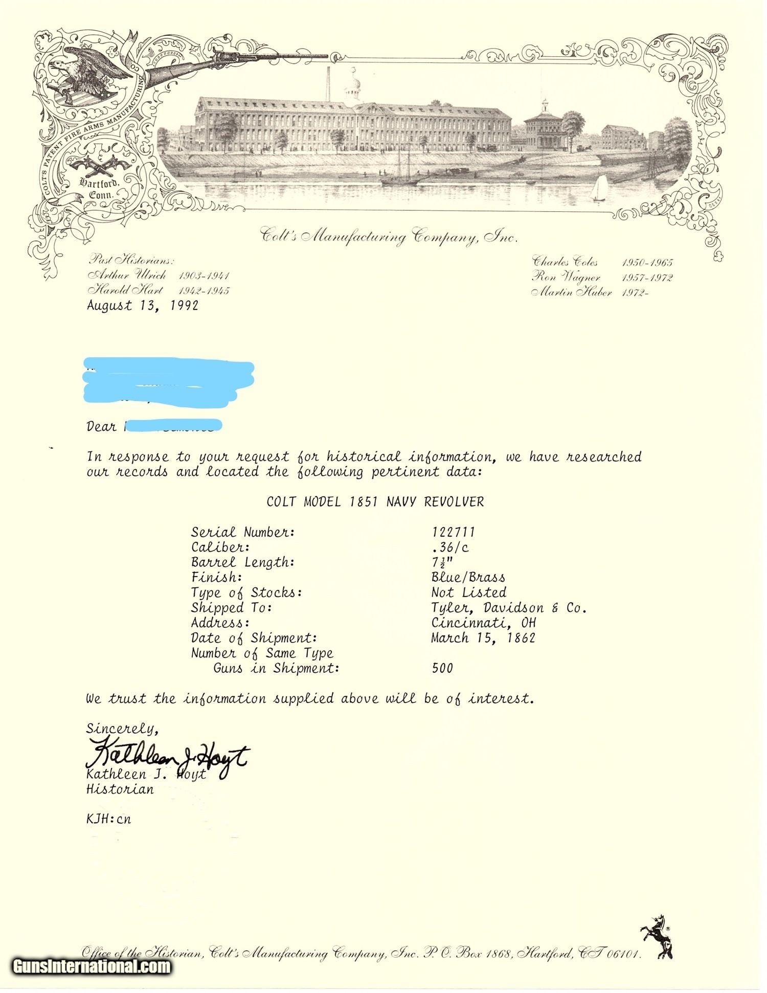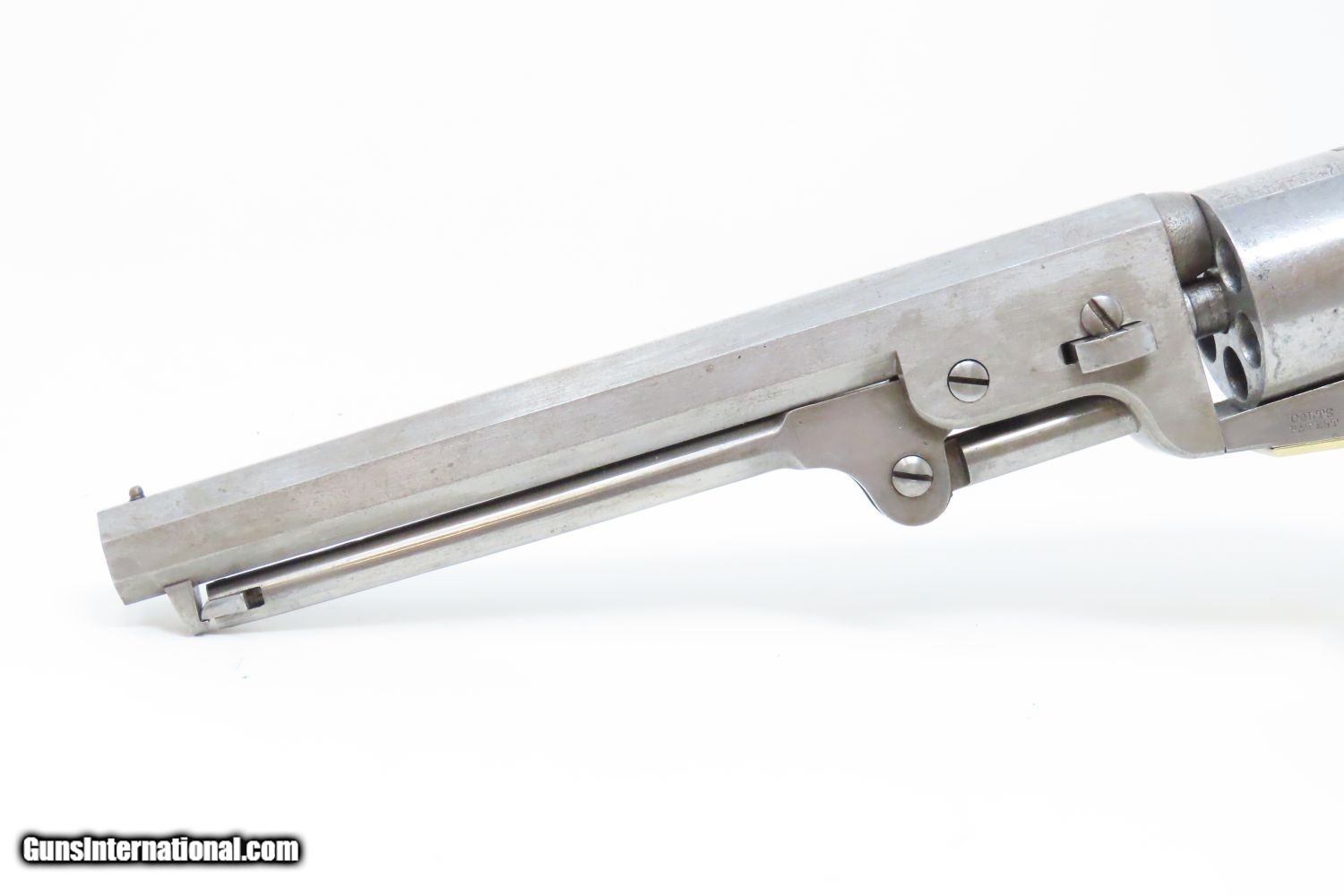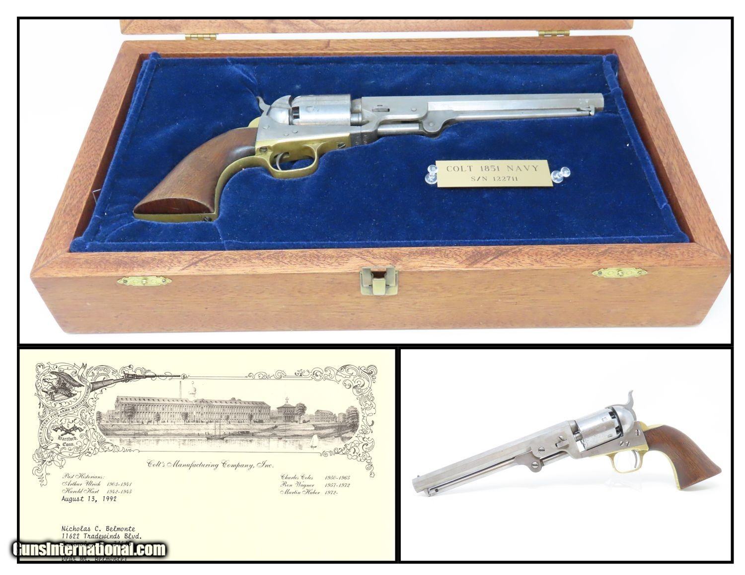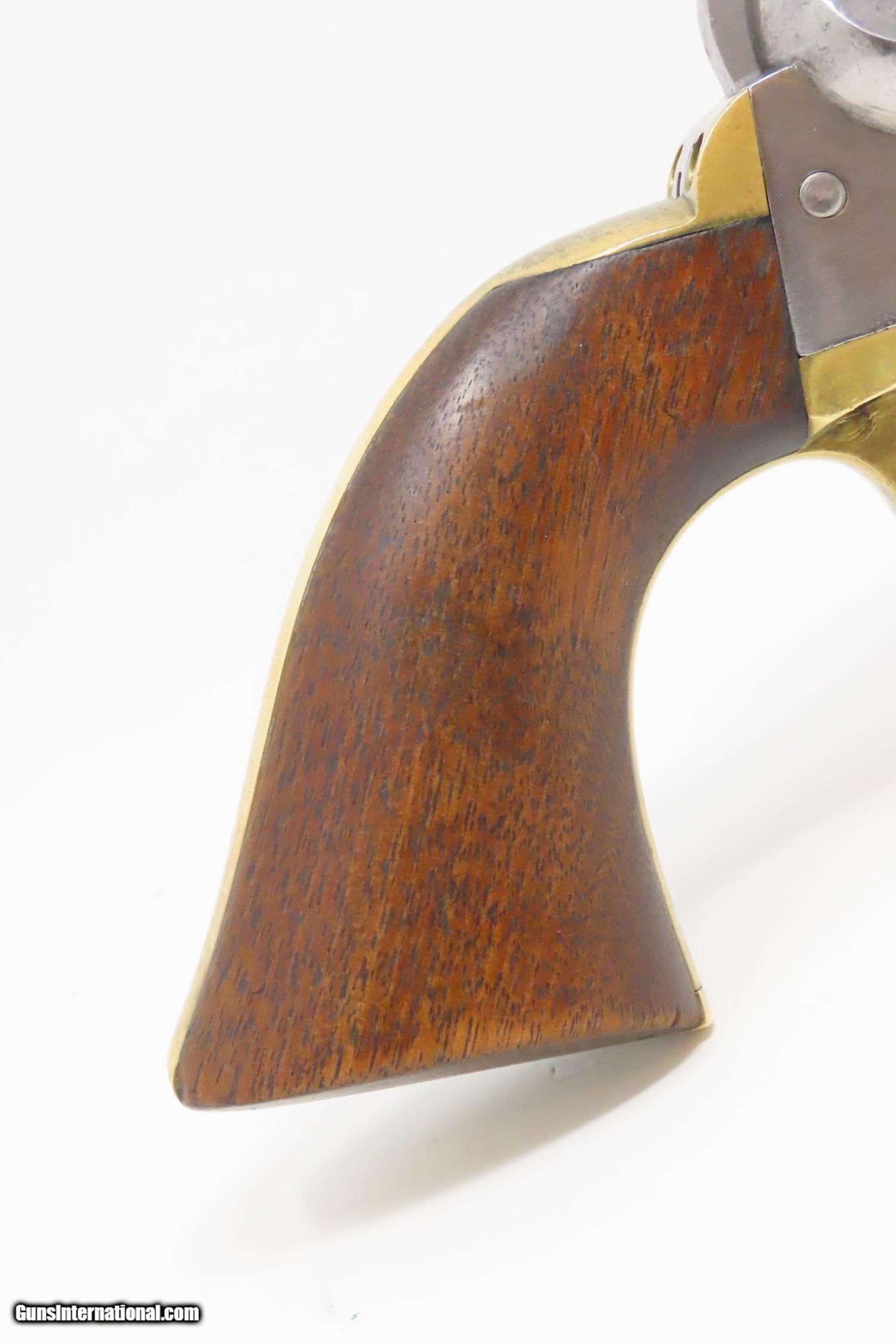 Description: 1862 CINCINATTI Lettered CIVIL WAR COLT 1851 NAVY .36 Revolver OHIO MILITIA To Tyler Davidson & Co. for Sale to State of Ohio Militia! Here we present a Lettered Antique Colt 1851 Navy Revolver, made in 1862 in Hartford, Connecticut. The factory letter indicates that it was one of 500 shipped to Tyler Davidson & Company in Cincinnati, Ohio on March 15, 1862. This is an unusually large, documented shipment that was not to fulfill a federal contract but a commercial contract by a large distributor (Tyler Davidson & Co.) for sale to the State of Ohio militia. A handwritten letter from Tyler Davidson & Company states: Hon Wm. Dennison Gov The State of Ohio. We propose to supply to your order 1000 or 2000 “Colts” and “Beals” best Navy Revolvers complete 22 50/100 each: delivery to commence immediately on receiving the requisition, and continuing at the rate of about 100 pr day. Terms of Payment: Cash in all the months of November and December and final payment not later than 25th of December. -Tyler Davidson Co. Tyler Davidson had the largest hardware store in Cincinnati during this period. One of his clerks, Henry Probasco, would later become his business partner and prompt the “& Co.” of Tyler Davidson & Co. Henry would help the business achieve new heights of success. Upon Tyler’s death in 1865, Henry sold the business and traveled Europe in 1866 with his wife. It had been Tyler and Henry’s intention to build a public fountain in Cincinnati, but it had never gotten further than an idea, possibly due to the Civil War. In 1867, Henry returned to Cincinnati having been to a foundry in Munich and arranging for a magnificent sculpture to be made out of old cannon brass. In 1871, Henry presented the monument to the city, what is now called the Tyler Davidson or Probasco Fountain. It was a large and beautifully ornate piece that was designed to offer a drink to any passerby. This was to promote “temperance”, the movement that was popular at the time to discourage the consumption of alcohol. The original design even chilled the water to provide exquisite refreshment before modern refrigeration and to provide an alternative to saloons for a cool drink. This monument still stands today. The 1851 Navy was one of Samuel Colt’s most famous and successful lines, reaching a production total of 257,348 from 1850 to 1873 (right up to the time of SAA production) from both Hartford and London factories. From Hartford alone, 185,000 were made by the end of the American Civil War. Many of these saw service during the conflict on both sides. There were some military purchases and lots of private purchases by soldiers going off to war. In addition, the Model 1851 was carried by Confederate General Robert E. Lee and was a favorite of “Doc” Holliday and “Wild Bill” Hickok, who carried two of these most famously in his red sash. The overall condition is very good. The action is strong and crisp. The bore remains in good shape with sharp rifling. The cylinder scene remains visible. The walnut grip is in nice shape with only a tiny chip missing from the left toe. All numbers match. This example comes display ready with a navy blue felt lined glass-topped case as well as the Colt Archive Letter. This is a wonderful set with a history that sets this Colt Navy apart! Own the original! This is a legitimate antique and not a reproduction. Barrel is 7-1/2 inches. Caliber: .36 Overall condition as seen in photos. Very Fast. Very Safe. FREE SHIPPING WORLDWIDE. Delivered directly to your door by express mail! Guaranteed AUTHENTIC & Includes CERTIFICATE OF AUTHENTICITY. ancestryguns $4645 #201614 SOLD Antique: Yes |