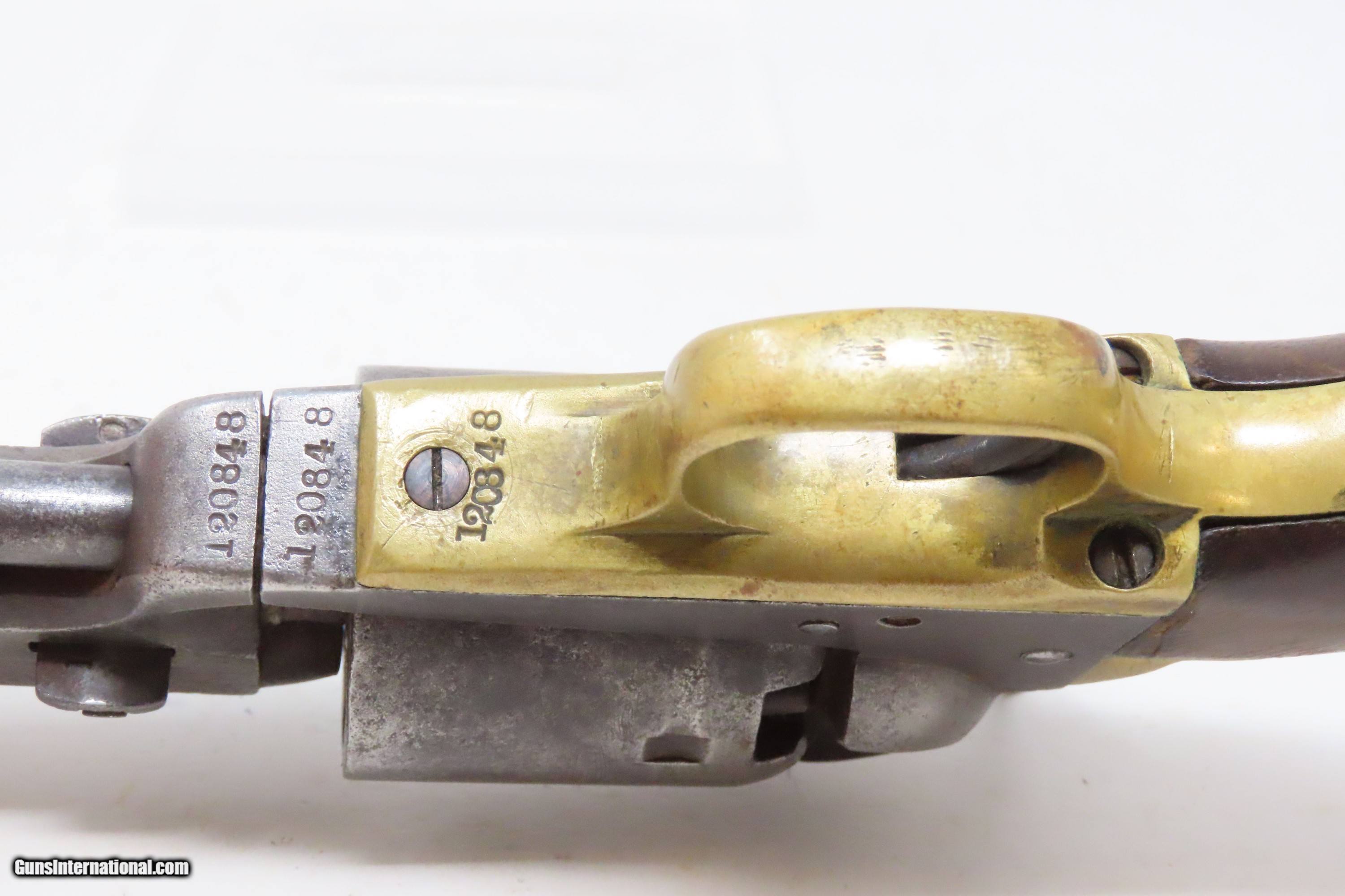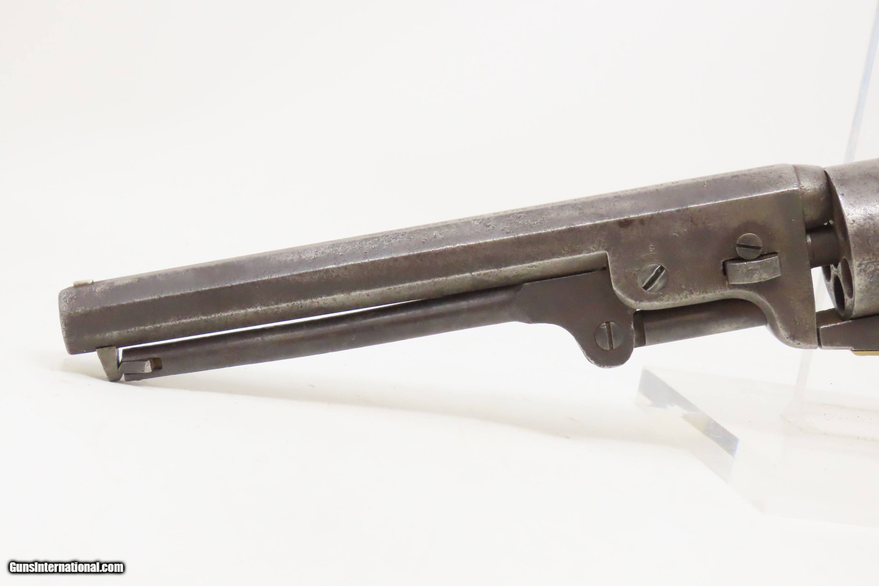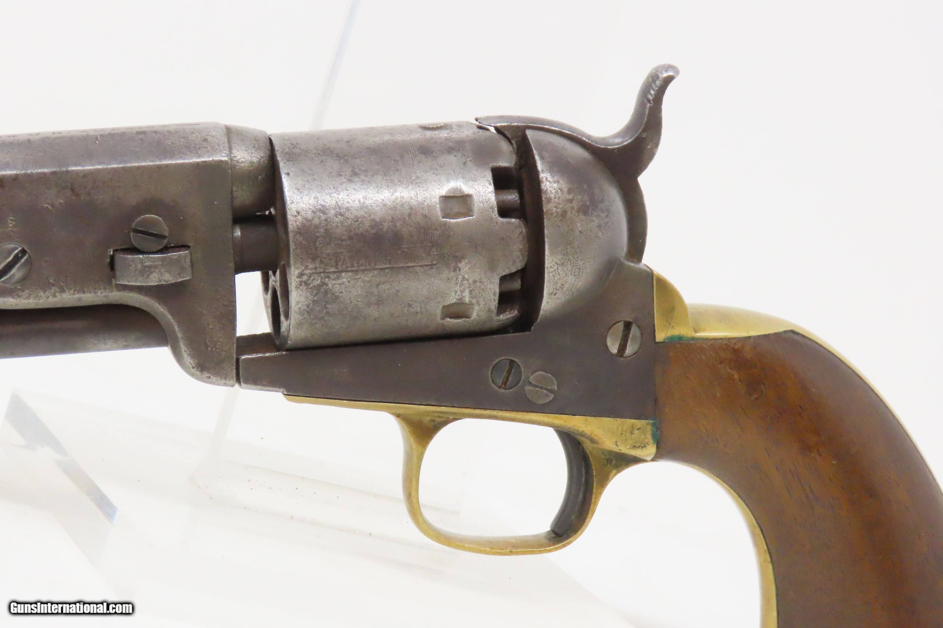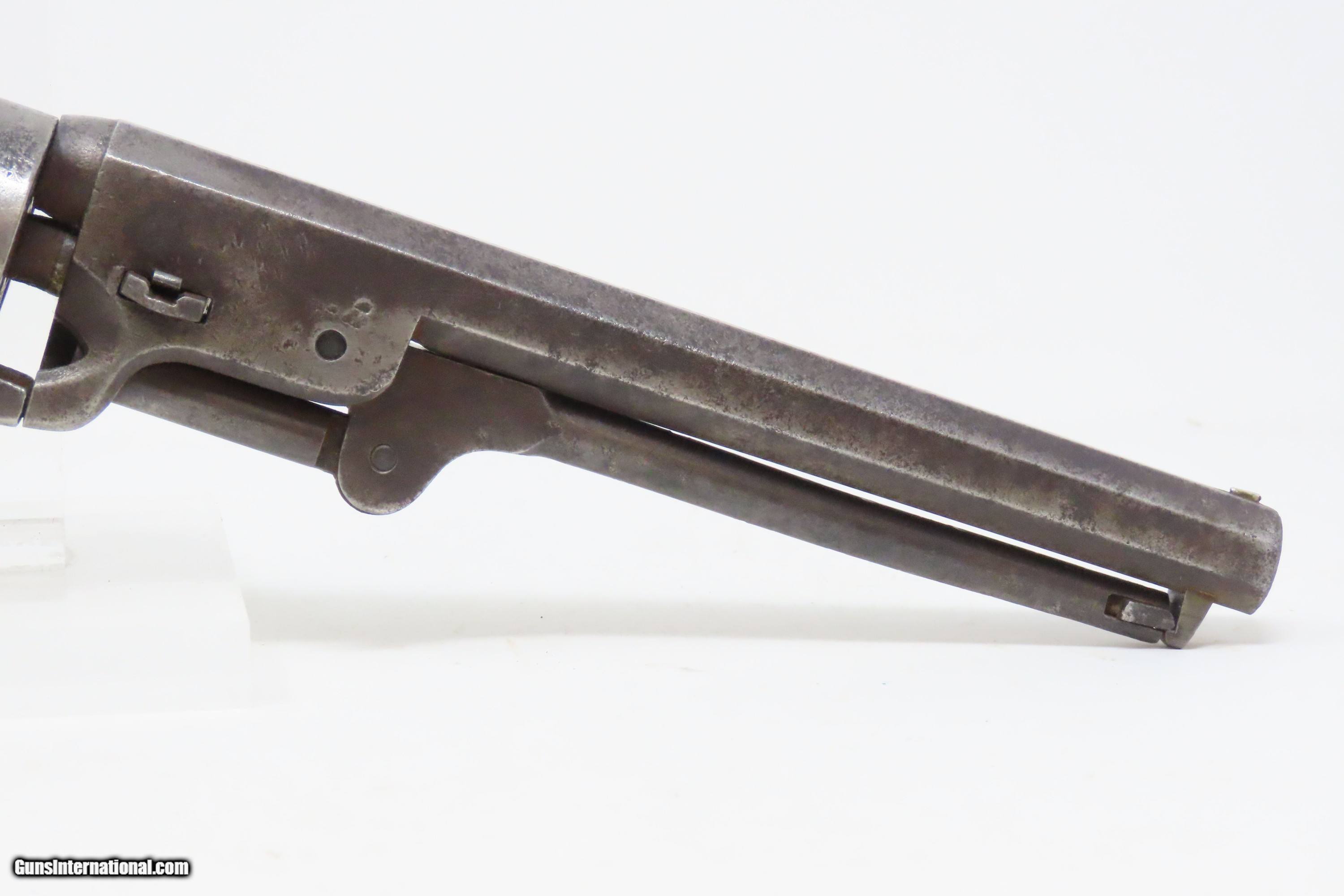 Description: 1862 COLT M1851 NAVY .36 Revolver GUNFIGHTER CIVIL WAR WILD WEST Antique CASE, AMMO, POWDER FLASK, BALL/BULLET MOLD, ELEY CAP TIN Here we present an antique Colt Model 1851 Navy Revolver, made early in the American Civil War in 1862 in Hartford, Connecticut. The 1851 Navy was one of Colt’s most famous and successful lines, reaching a production total of 257,348 from 1850 to 1873 (right up to the time of SAA production) from both Hartford and London factories. From Hartford alone, 185,000 were made by the end of the American Civil War. Many of these saw service during the conflict on both sides. There were some military purchases and lots of private purchases by soldiers going off to war. In addition, the Model 1851 was carried by Confederate General Robert E. Lee and was a favorite of “Doc” Holliday and “Wild Bill” Hickok, who carried two of these most famously in his red sash. The Colt Model 1851 Navy, first known as the “Ranger Model” and also known as the “Revolving Belt Pistol of Naval Caliber,” was designed between 1847 and 1850, manufactured from 1850 until 1873, and was the second most popular Colt percussion revolver after only the Model 1849 Pocket. Though its name implies maritime use, most Navy revolvers primarily saw use on dry land, including in the Old West, which truly, the Colt 1851 Navy revolver ushered in the era of the gunfighter. Among the many guns that were used on the western frontier, none was more popular in its day than the Colt percussion revolver designated the 1851 Navy. This single action revolver weighed in at roughly 42 ounces. Prior to the Navy's introduction, hand gunners had to make do with the Colt Walker and Dragoon revolvers, both of which weighed over four pounds. These big guns were best suited for carry in pommel holsters on the saddle. The Colt Navy was the first popular single-action revolver that could be worn comfortably on the belt. Prior to the beginning of the Civil War, the state of Missouri was a hotbed of trouble that often broke out in shooting fights. Bill Anderson, Jesse and Frank James, and the Youngers all cut their teeth on this border trouble and were ready to go when leaders like William Quantrill enlisted them in his guerilla band during the war. The boys from Missouri became quite proficient with their six-guns and generally carried a brace of Dragoons on their saddle pommels and a brace of Navy revolvers on their hip. The overall condition is good. Gray patina throughout. Numbers match. The action (hammer/trigger) is strong, though the cylinder indexing is slightly slow. The bore is patinated with good rifling. The grip is solid. The fitted and lined case is marked “SANTA FE” on the bottom and is in good condition. The flask is a Dixon & Sons Colt’s Patent, the bullet mold is also Colt’s. The cap tin is from Eley. Also included are lead bullets and case key. Own the original! This is a legitimate antique and not a reproduction. Barrel is 7-1/2 inches. Caliber: .36 Percussion Overall condition as seen in photos. Very Fast. Very Safe. FREE SHIPPING WORLDWIDE. Delivered directly to your door by express mail! Guaranteed AUTHENTIC & Includes CERTIFICATE OF AUTHENTICITY. ancestryguns $3800 #230909 SOLD Antique: Yes |