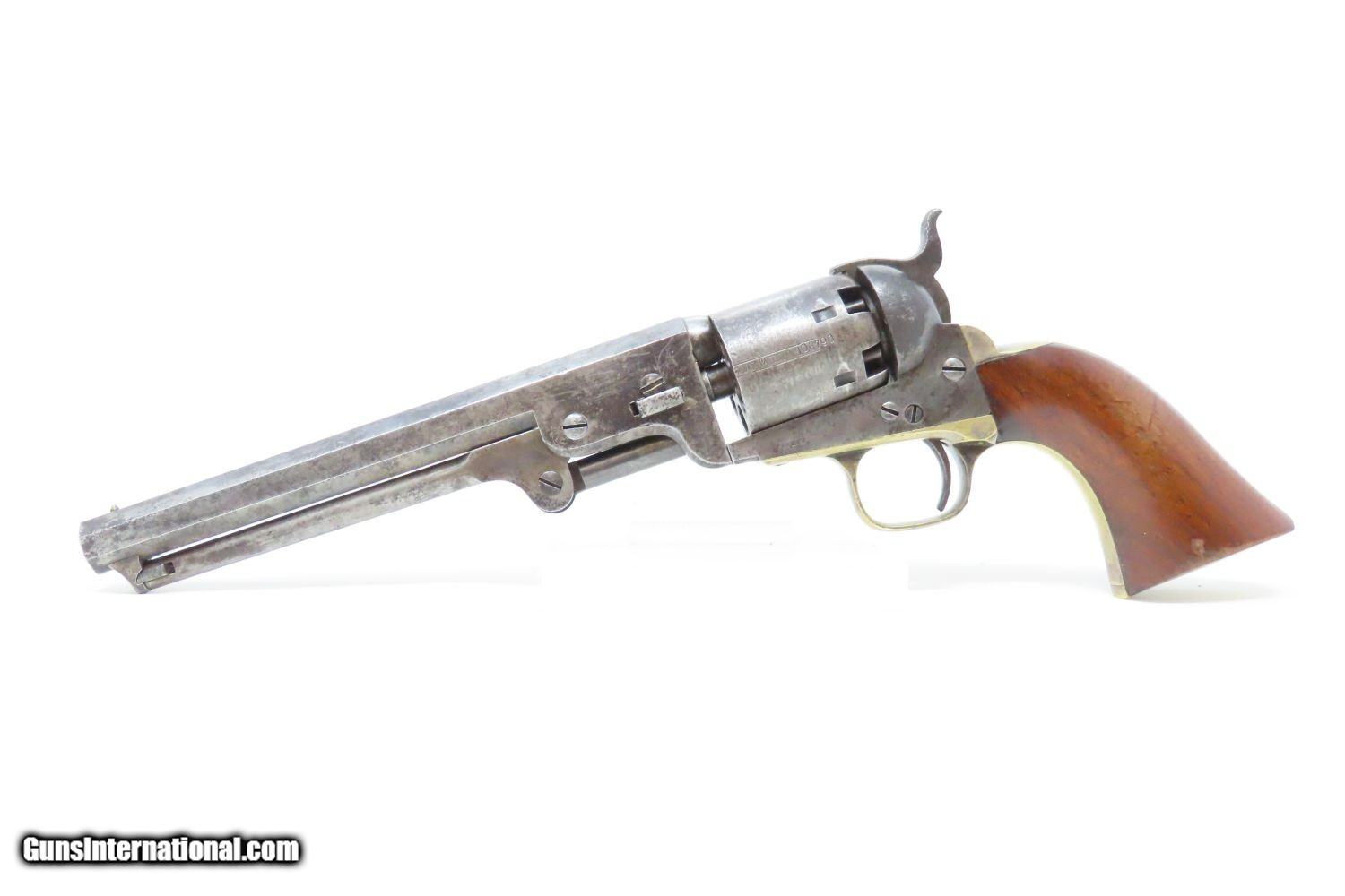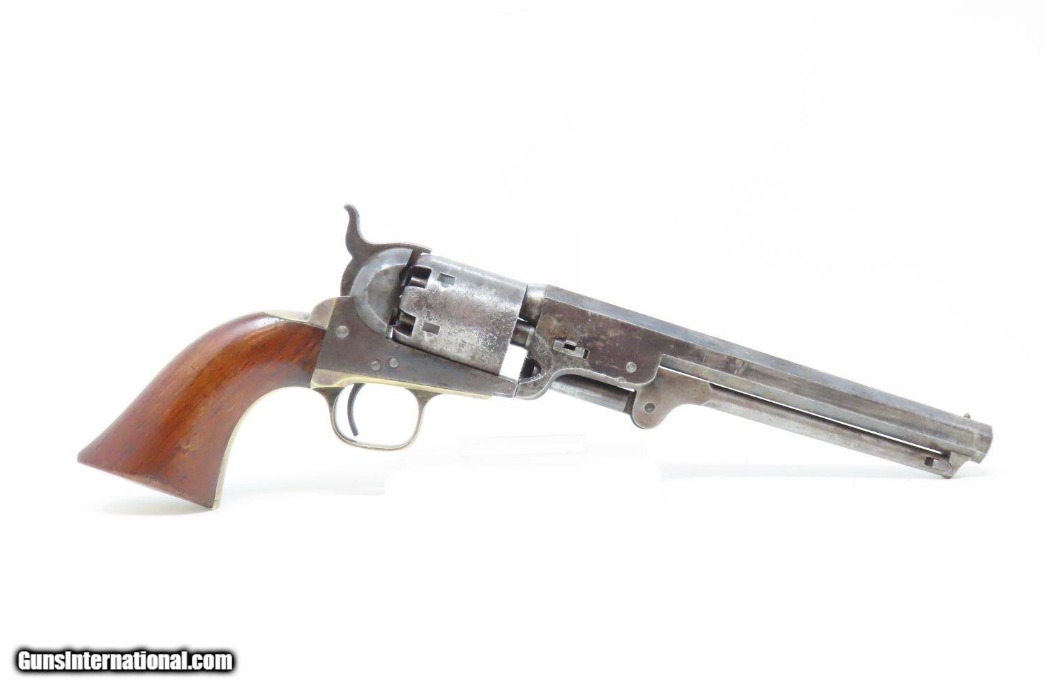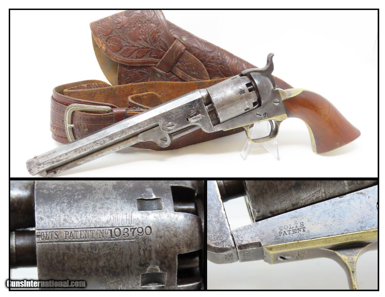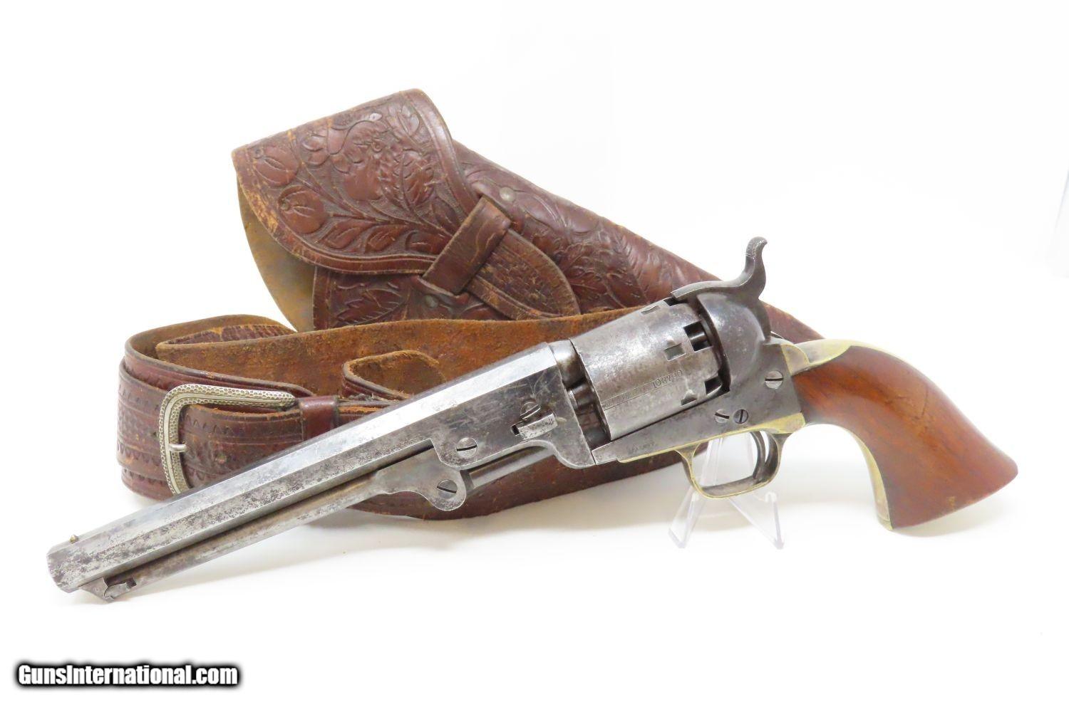Description: CIVIL WAR Era Antique COLT Model 1851 NAVY .36 Caliber PERCUSSION Revolver Manufactured in 1861 with BELT & TOOLED HOLSTER! Here we present an antique Colt Model 1851 Navy Percussion Revolver, made in 1861 in Hartford, Connecticut. The 1851 Navy was one of Colt’s most famous and successful lines, reaching a production total of 257,348 from 1850 to 1873 (right up to the time of SAA production) from both Hartford and London factories. From Hartford alone, 185,000 were made by the end of the American Civil War. Many of these saw service during the conflict on both sides. There were some military purchases and lots of private purchases by soldiers going off to war. In addition, the Model 1851 was carried by Confederate General Robert E. Lee and was a favorite of “Doc” Holliday and “Wild Bill” Hickok, who carried two of these most famously in his red sash. Truly, the Colt 1851 Navy revolver ushered in the era of the gunfighter. Among the many guns that were used on the western frontier, none was more popular in its day than the Colt percussion revolver designated the 1851 Navy. This single action revolver weighed in at roughly 42 ounces. Prior to the Navy's introduction, hand gunners had to make do with the Colt Walker and Dragoon revolvers, both of which weighed over four pounds. These big guns were best suited for carry in pommel holsters on the saddle. The Colt Navy was the first popular single-action revolver that could be worn comfortably on the belt. Prior to the beginning of the Civil War, the state of Missouri was a hotbed of trouble that often broke out in shooting fights. Bill Anderson, Jesse and Frank James, and the Youngers all cut their teeth on this border trouble and were ready to go when leaders like William Quantrill enlisted them in his guerilla band during the war. The boys from Missouri became quite proficient with their six-guns and generally carried a brace of Dragoons on their saddle pommels and a brace of Navy revolvers on their hip. The overall condition is very good. The action is excellent with a tight lockup. Great bore with sharp rifling. The grip is in great shape with expected handling wear. Numbers match. The Battle of Campeche cylinder scene remains quite clear! A very nice Colt 1851 Navy with a very handsome tooled leather holster and belt! Own the original! This is a legitimate antique and not a reproduction. Barrel is 7-1/2 inches. Caliber: .36 Overall condition as seen in photos. Very Fast. Very Safe. FREE SHIPPING WORLDWIDE. Delivered directly to your door by express mail! Guaranteed AUTHENTIC & Includes CERTIFICATE OF AUTHENTICITY. ancestryguns $3915 #210332 SOLD Antique: Yes |