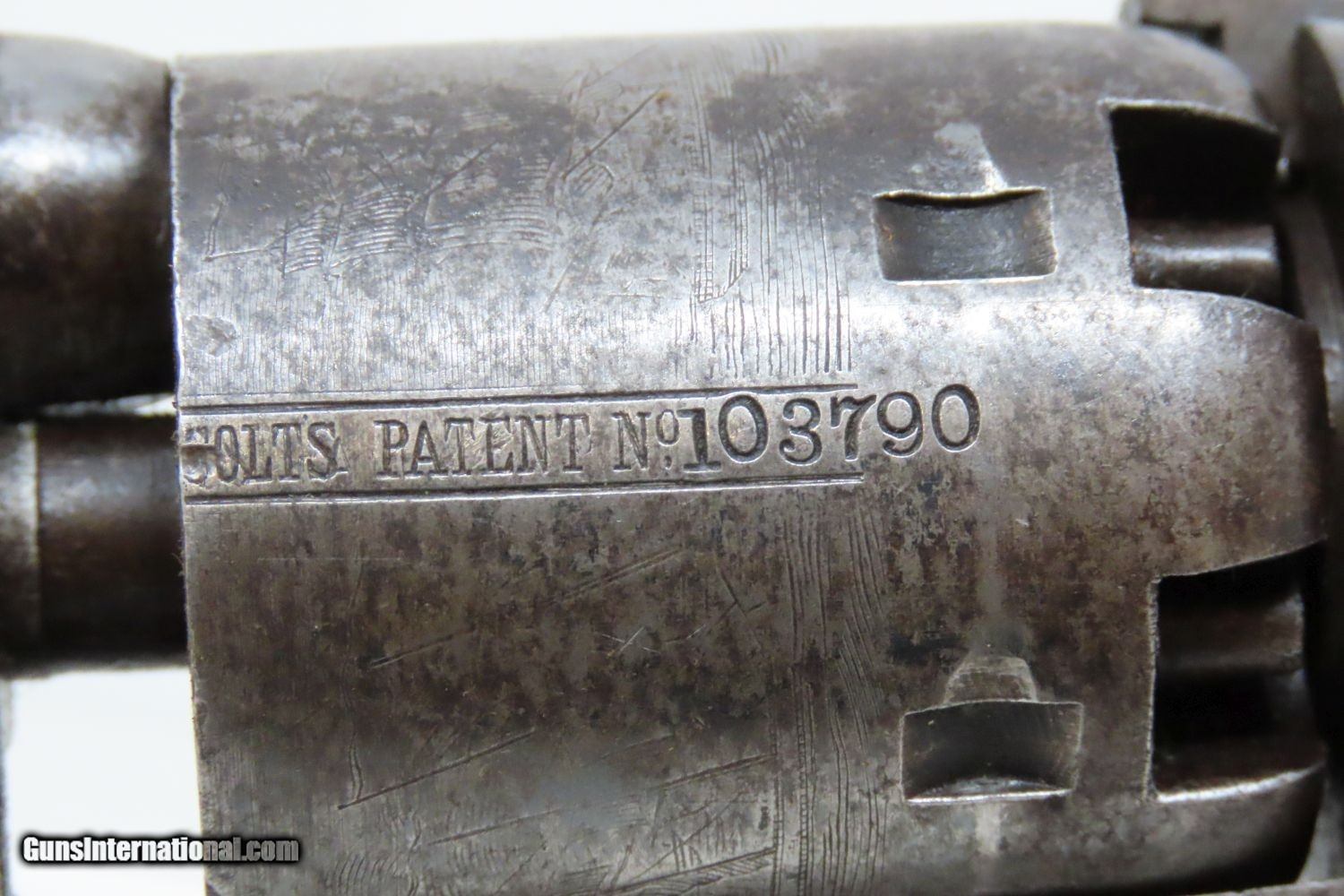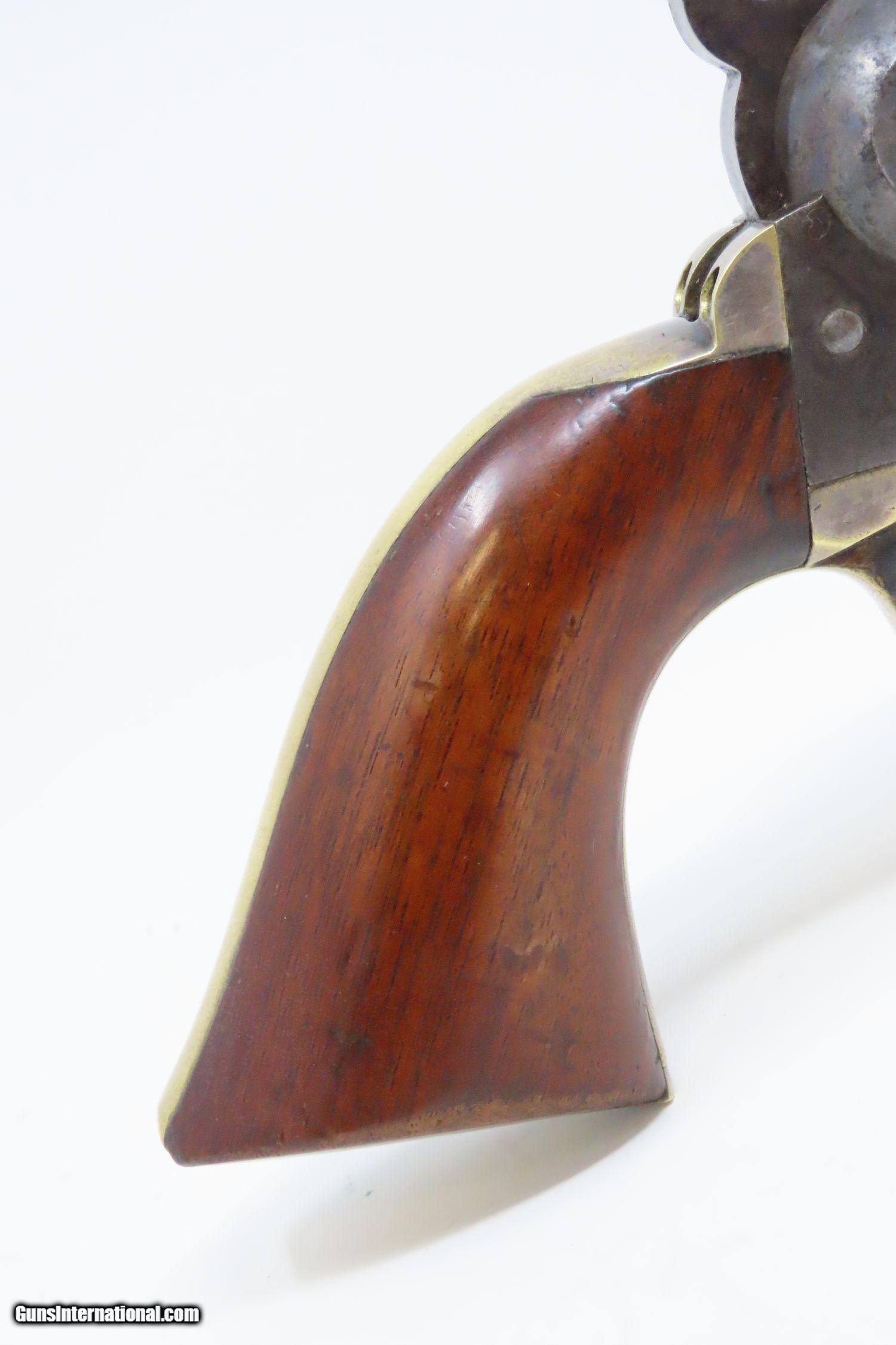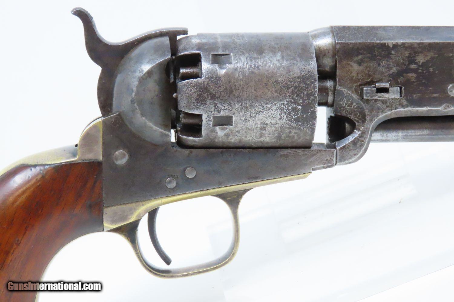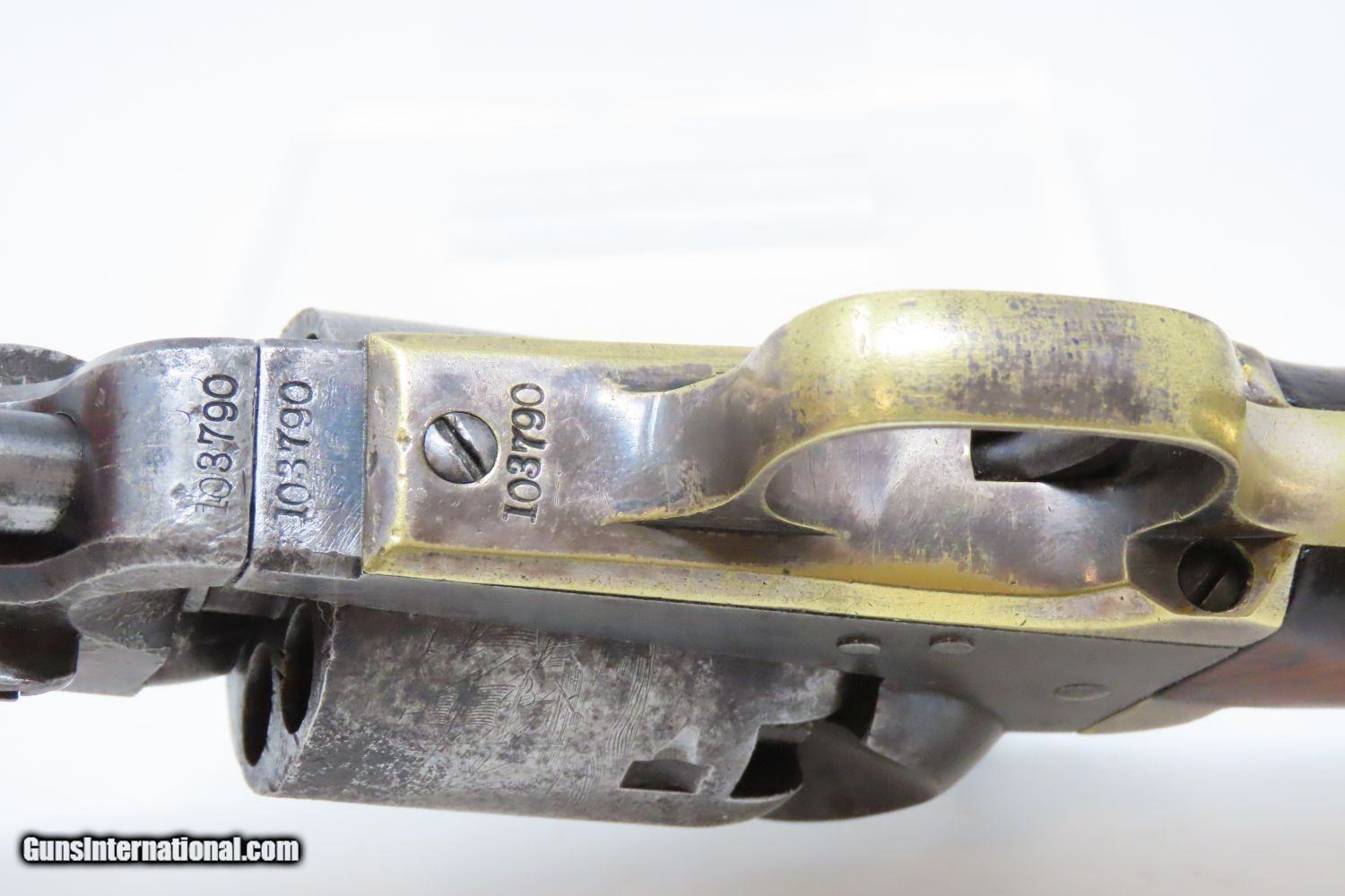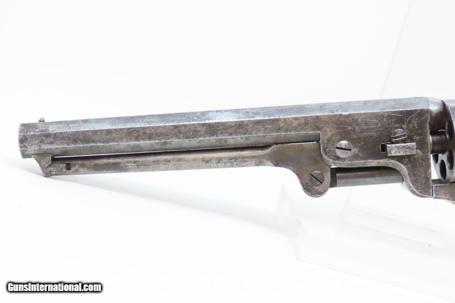 Description: CIVIL WAR Era Antique COLT Model 1851 NAVY .36 Caliber PERCUSSION Revolver Manufactured in 1861 with BELT & TOOLED HOLSTER! Here we present an antique Colt Model 1851 Navy Percussion Revolver, made in 1861 in Hartford, Connecticut. The 1851 Navy was one of Colt’s most famous and successful lines, reaching a production total of 257,348 from 1850 to 1873 (right up to the time of SAA production) from both Hartford and London factories. From Hartford alone, 185,000 were made by the end of the American Civil War. Many of these saw service during the conflict on both sides. There were some military purchases and lots of private purchases by soldiers going off to war. In addition, the Model 1851 was carried by Confederate General Robert E. Lee and was a favorite of “Doc” Holliday and “Wild Bill” Hickok, who carried two of these most famously in his red sash. Truly, the Colt 1851 Navy revolver ushered in the era of the gunfighter. Among the many guns that were used on the western frontier, none was more popular in its day than the Colt percussion revolver designated the 1851 Navy. This single action revolver weighed in at roughly 42 ounces. Prior to the Navy's introduction, hand gunners had to make do with the Colt Walker and Dragoon revolvers, both of which weighed over four pounds. These big guns were best suited for carry in pommel holsters on the saddle. The Colt Navy was the first popular single-action revolver that could be worn comfortably on the belt. Prior to the beginning of the Civil War, the state of Missouri was a hotbed of trouble that often broke out in shooting fights. Bill Anderson, Jesse and Frank James, and the Youngers all cut their teeth on this border trouble and were ready to go when leaders like William Quantrill enlisted them in his guerilla band during the war. The boys from Missouri became quite proficient with their six-guns and generally carried a brace of Dragoons on their saddle pommels and a brace of Navy revolvers on their hip. The overall condition is very good. The action is excellent with a tight lockup. Great bore with sharp rifling. The grip is in great shape with expected handling wear. Numbers match. The Battle of Campeche cylinder scene remains quite clear! A very nice Colt 1851 Navy with a very handsome tooled leather holster and belt! Own the original! This is a legitimate antique and not a reproduction. Barrel is 7-1/2 inches. Caliber: .36 Overall condition as seen in photos. Very Fast. Very Safe. FREE SHIPPING WORLDWIDE. Delivered directly to your door by express mail! Guaranteed AUTHENTIC & Includes CERTIFICATE OF AUTHENTICITY. ancestryguns $3915 #210332 SOLD Antique: Yes |