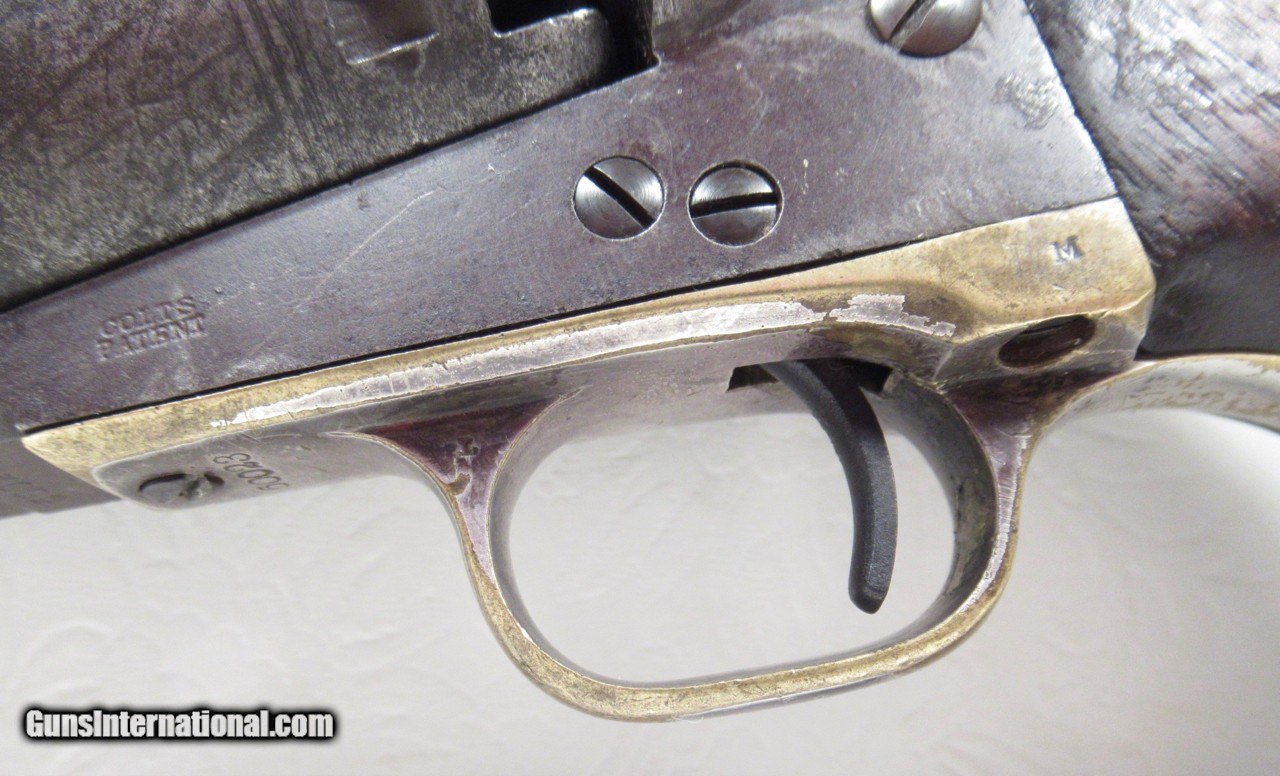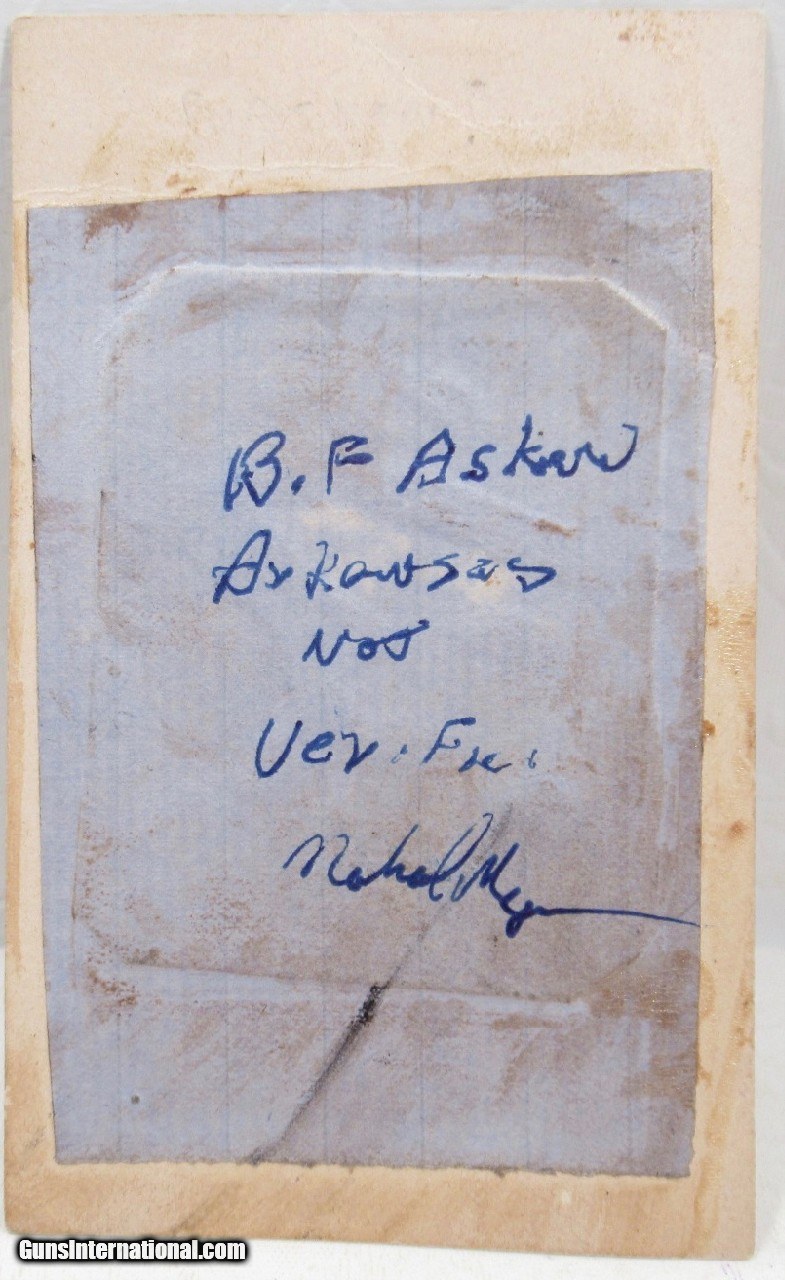 Description: Colt Model 1851 Navy Revolver; Serial No. 60023; Standard .36 Caliber with 7 ½” Barrel; Made 1856; 100% Original Condition with All Matching Numbers; Matching Wedge Un-marked; Metal Dark Blue/Brown Patina with Good Amount of Silver Plating on Trigger Guard; Though Faded, The Serial No. in Ink on Inside of Grips Backstrap Channel; Good Action and Typical Black Powder Bore; Back Strap Inscribed “To B.F. Askew from Col. Sam Colt”; Askew was a Big Wig Politician and Confederate Solider from Magnolia, Arkansas; He Enlisted in the Confederate Army in 1861, First Volunteers, Arkansas; Also Enlisted 4/1/1862 as 2nd Lieutenant of Co. B AR. 9th Infantry; Rare Col. Sam Colt Revolver Presented to Arkansas Politician and Confederate Solider; From an Austin, Texas Estate; See All Photos for Condition; No Texts; Call (254)541-5765 or Email Only; PERSONAL PROPERTY of Harold Wieser; NOTICE: We Do Not Do Any Consignments - All Items Listed are Owned by Us - NO SALES to New Jersey or New York City - Antiques Only to Massachusetts and California; NOTE: All Modern Firearms Must Go to FFL Dealer who will Accept From Individual with Texas Driver License; Price: $24,975 + $45 S&H Via USPS Priority Mail; Payment Address: Harold Wieser - 1466 U.S. Hwy 77 - Rosebud, TX 76570; SEND PAYMENTS VIA USPS PRIORITY MAIL; BEWARE of SCAMS!!! - DO NOT SEND MONEY or CORRESPONDENTS ELECTRONICALLY UNLESS YOU HAVE SPOKEN to HAROLD WIESER FIRST! (254)541-5765 SOLD Antique: Yes Manufacturer: Colt Model: 1851 Navy Serial Number: 60023 |