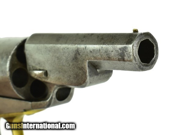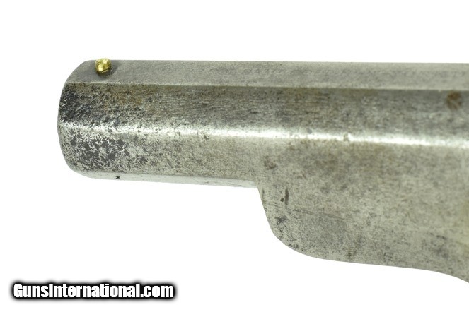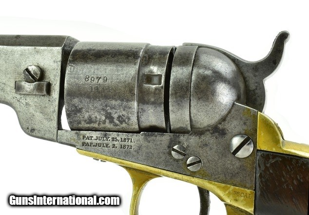 Description: Colt Pocket Navy Revolver Conversion to Cartridge. .38 Rimfire caliber. Frame has the cartridge conversion patent dates. Barrel length 3” (probably was a 4 1/2” barrel originally). Shortened barrel was done during the period of use. Cylinder matching number is faint but visible below the original cylinder number so, all matching numbers. Bore is very good to excellent. Grips are good plus with later on varnish. The shortened barrel was professionally done with a proper muzzle crown job. Overall condition is very good. Really interesting short barrel conversion. Would like to see a photo of the original owner.