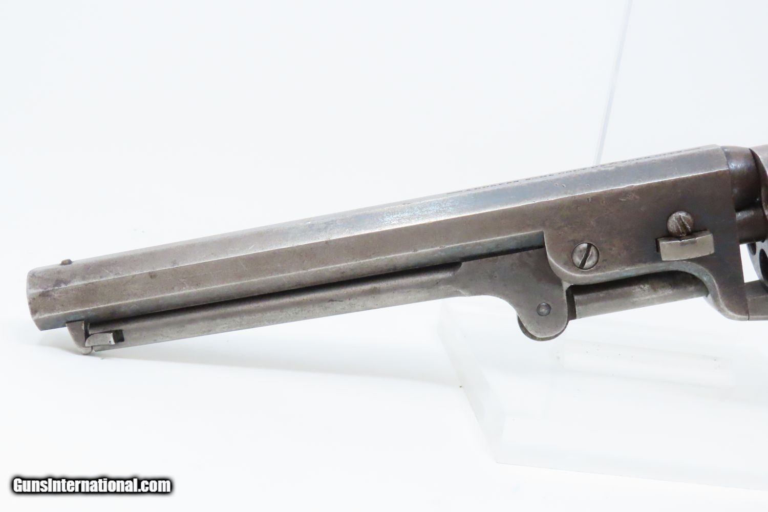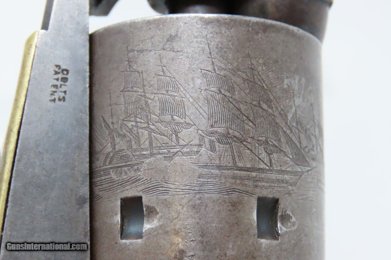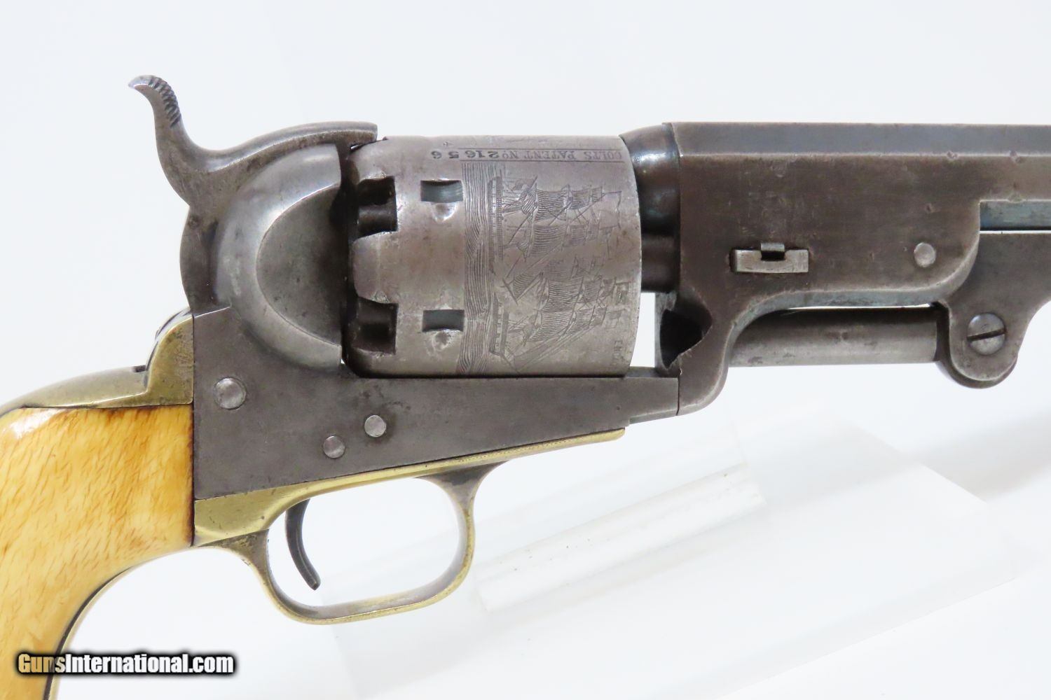 Description: FANTASTIC 3rd Model COLT Model 1851 NAVY .36 Caliber Revolver Antique IVORY MADE in 1853 with ANTIQUE IVORY GRIPS! Here we present an antique Colt Model 1851 Navy Percussion Revolver, made in 1853 in Hartford, Connecticut. The 1851 Navy was one of Colt’s most famous and successful lines, reaching a production total of 257,348 from 1850 to 1873 (right up to the time of SAA production) from both Hartford and London factories. From Hartford alone, 185,000 were made by the end of the American Civil War. Many of these saw service during the conflict on both sides. There were some military purchases and lots of private purchases by soldiers going off to war. In addition, the Model 1851 was carried by Confederate General Robert E. Lee and was a favorite of “Doc” Holliday and “Wild Bill” Hickok, who carried two of these most famously in his red sash. Truly, the Colt 1851 Navy revolver ushered in the era of the gunfighter. Among the many guns that were used on the western frontier, none was more popular in its day than the Colt percussion revolver designated the 1851 Navy. This single action revolver weighed in at roughly 42 ounces. Prior to the Navy's introduction, hand gunners had to make do with the Colt Walker and Dragoon revolvers, both of which weighed over four pounds. These big guns were best suited for carry in pommel holsters on the saddle. The Colt Navy was the first popular single-action revolver that could be worn comfortably on the belt. Prior to the beginning of the Civil War, the state of Missouri was a hotbed of trouble that often broke out in shooting fights. Bill Anderson, Jesse and Frank James, and the Youngers all cut their teeth on this border trouble and were ready to go when leaders like William Quantrill enlisted them in his guerilla band during the war. The boys from Missouri became quite proficient with their six-guns and generally carried a brace of Dragoons on their saddle pommels and a brace of Navy revolvers on their hip. This 3rd Model features the characteristic small, round brass trigger guard. Antique ivory grip. The cylinder roll engraving on the 1851 Navy features a scene from the Battle of Campeche executed by American engraver Waterman Ormsby. The engraving pays homage to Texas in their fight with the Mexican government for independence. During this particular battle, the Mexican Navy wielded two ironclad steamers, while the Texans were armed with a variety of wooden ships, led by Commodore Edwin Moore. The scene also appears on the cylinders of the Colt 1860 Army and 1861 Navy Revolvers. The overall condition is near fine. Original blue and silver plate finish. The bore is bright with sharp rifling. The ivory grip is smooth and solid with a lovely aged yellow color. The Battle of Campeche cylinder scene is wonderfully preserved. Numbers match. This is a superior example of an early Colt Model 1851 Navy with handsome ivory grips! Own the original! This is a legitimate antique and not a reproduction. Barrel is 7-1/2 inches. Caliber: .36 Percussion Overall condition as seen in photos. Very Fast. Very Safe. FREE SHIPPING WORLDWIDE. Delivered directly to your door by express mail! Guaranteed AUTHENTIC & Includes CERTIFICATE OF AUTHENTICITY. ancestryguns $6325 #210796 SOLD Antique: Yes |