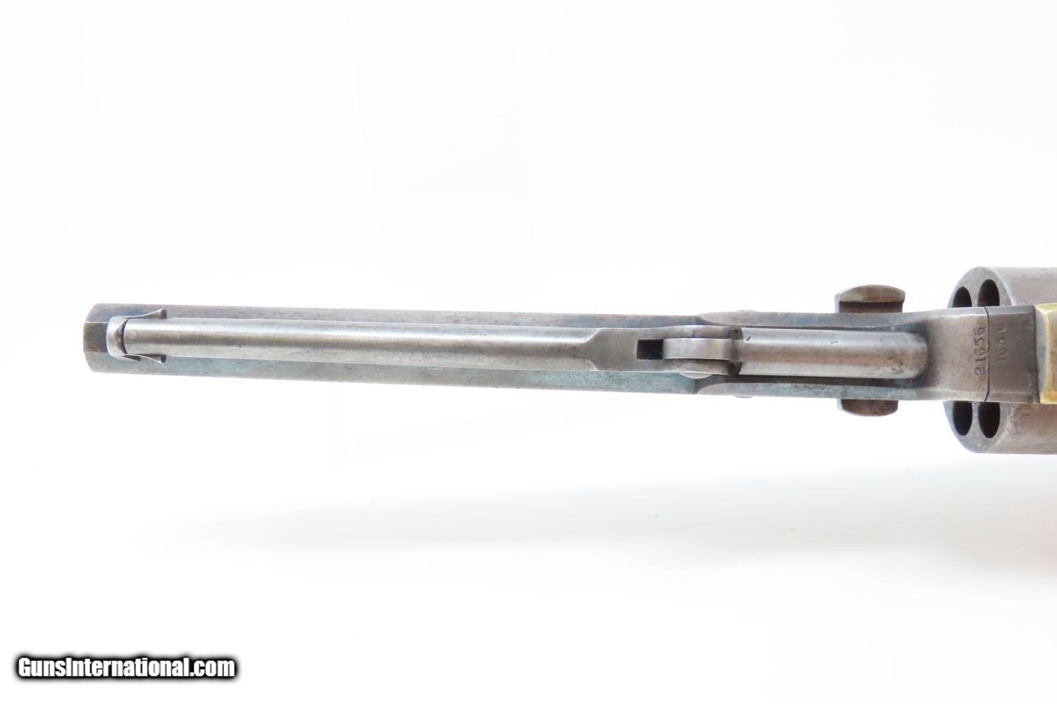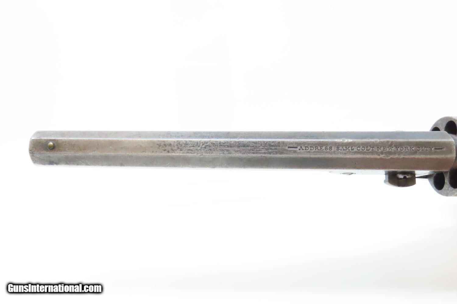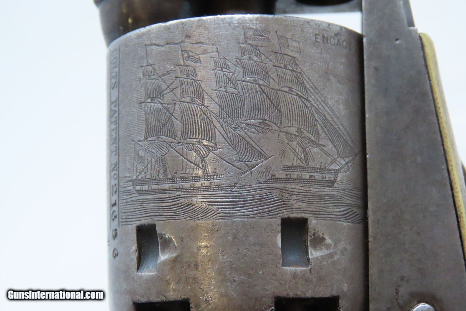 Description: FANTASTIC 3rd Model COLT Model 1851 NAVY .36 Caliber Revolver Antique IVORY MADE in 1853 with ANTIQUE IVORY GRIPS! Here we present an antique Colt Model 1851 Navy Percussion Revolver, made in 1853 in Hartford, Connecticut. The 1851 Navy was one of Colt’s most famous and successful lines, reaching a production total of 257,348 from 1850 to 1873 (right up to the time of SAA production) from both Hartford and London factories. From Hartford alone, 185,000 were made by the end of the American Civil War. Many of these saw service during the conflict on both sides. There were some military purchases and lots of private purchases by soldiers going off to war. In addition, the Model 1851 was carried by Confederate General Robert E. Lee and was a favorite of “Doc” Holliday and “Wild Bill” Hickok, who carried two of these most famously in his red sash. Truly, the Colt 1851 Navy revolver ushered in the era of the gunfighter. Among the many guns that were used on the western frontier, none was more popular in its day than the Colt percussion revolver designated the 1851 Navy. This single action revolver weighed in at roughly 42 ounces. Prior to the Navy's introduction, hand gunners had to make do with the Colt Walker and Dragoon revolvers, both of which weighed over four pounds. These big guns were best suited for carry in pommel holsters on the saddle. The Colt Navy was the first popular single-action revolver that could be worn comfortably on the belt. Prior to the beginning of the Civil War, the state of Missouri was a hotbed of trouble that often broke out in shooting fights. Bill Anderson, Jesse and Frank James, and the Youngers all cut their teeth on this border trouble and were ready to go when leaders like William Quantrill enlisted them in his guerilla band during the war. The boys from Missouri became quite proficient with their six-guns and generally carried a brace of Dragoons on their saddle pommels and a brace of Navy revolvers on their hip. This 3rd Model features the characteristic small, round brass trigger guard. Antique ivory grip. The cylinder roll engraving on the 1851 Navy features a scene from the Battle of Campeche executed by American engraver Waterman Ormsby. The engraving pays homage to Texas in their fight with the Mexican government for independence. During this particular battle, the Mexican Navy wielded two ironclad steamers, while the Texans were armed with a variety of wooden ships, led by Commodore Edwin Moore. The scene also appears on the cylinders of the Colt 1860 Army and 1861 Navy Revolvers. The overall condition is near fine. Original blue and silver plate finish. The bore is bright with sharp rifling. The ivory grip is smooth and solid with a lovely aged yellow color. The Battle of Campeche cylinder scene is wonderfully preserved. Numbers match. This is a superior example of an early Colt Model 1851 Navy with handsome ivory grips! Own the original! This is a legitimate antique and not a reproduction. Barrel is 7-1/2 inches. Caliber: .36 Percussion Overall condition as seen in photos. Very Fast. Very Safe. FREE SHIPPING WORLDWIDE. Delivered directly to your door by express mail! Guaranteed AUTHENTIC & Includes CERTIFICATE OF AUTHENTICITY. ancestryguns $6325 #210796 SOLD Antique: Yes |