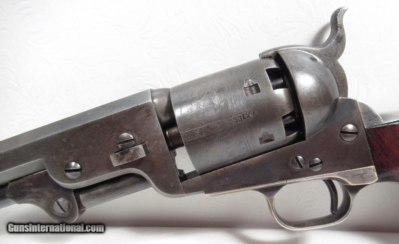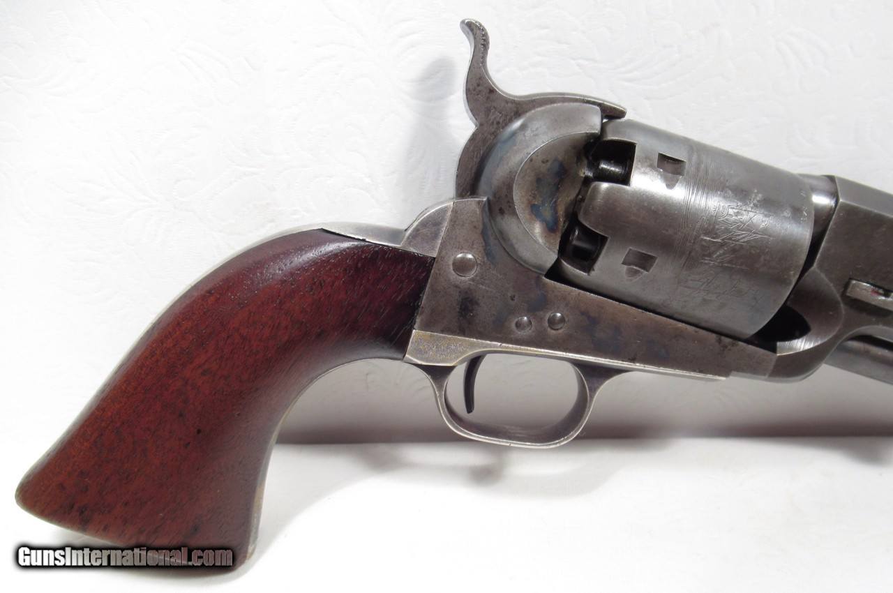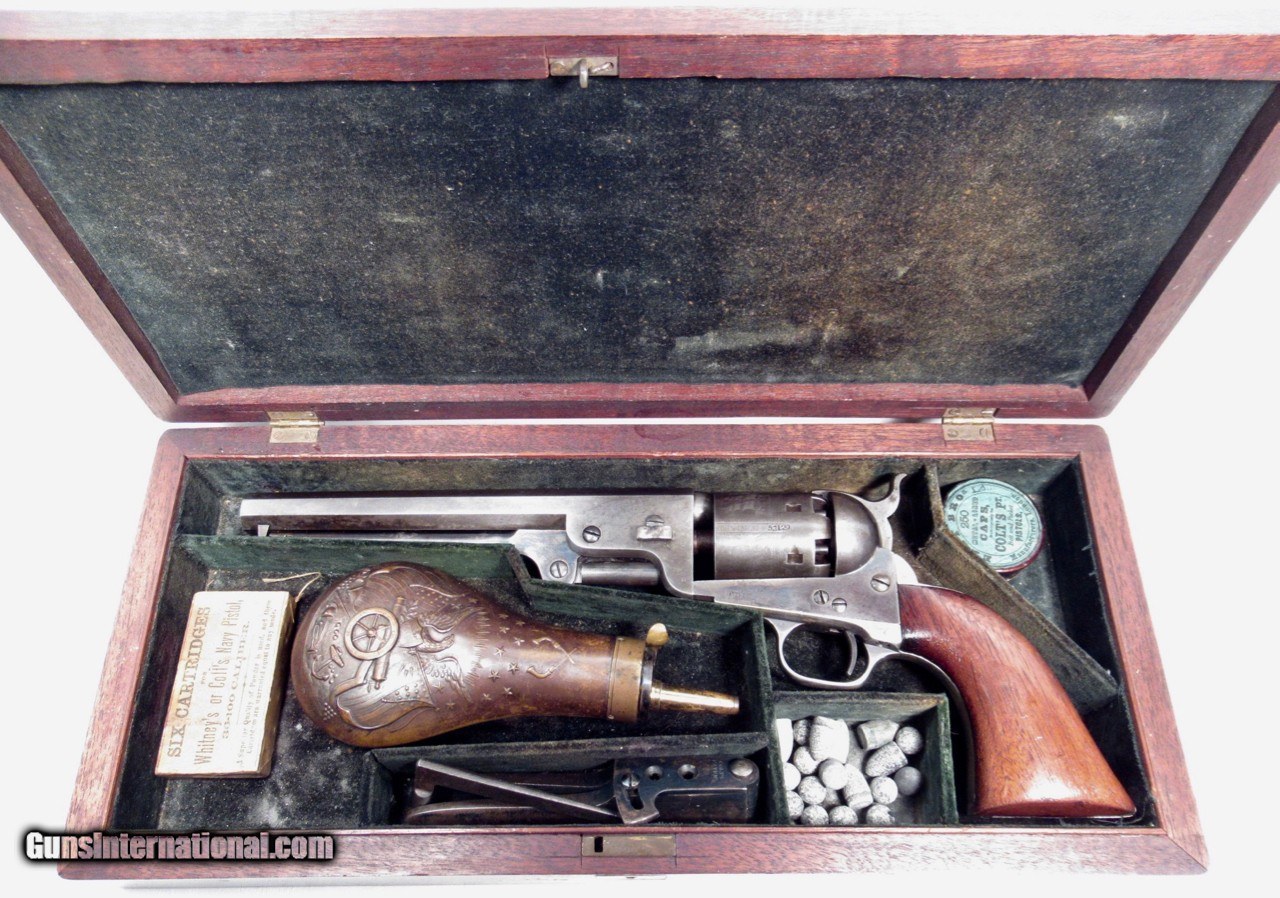 Description: Colt 1851 Navy Revolver; Serial No. 53129; .36 Caliber; 7 ½” Barrel Small Guard; 100% Correct, Original, and Matching – Including Wedge; One of the Best Known; Most of the Original Metal Finish Remains; All Original Varnish Remains on Grips; PERFECT ACTION and STRONG SHINY BORE; Very Nice Original Case with Accessories; Really Nice 161 Year-Old Cased Colt; Made 1856; See All Photos for Condition; No Texts. Call or Email Only; PERSONAL PROPERTY of Harold Wieser; Price: $14,975 + $45 S&H Via FedEx Express; PLEASE DO NOT SEND PAYMENT THROUGH U.S. POSTAL SERVICE; Price includes insured shipping; return policy: three days inspection from the date the item is received; full refund of shipping both ways ONLY IF THE ITEM IS MISREPRESENTED. SOLD Antique: Yes Manufacturer: Colt Model: 1851 Navy Serial Number: 53129 |