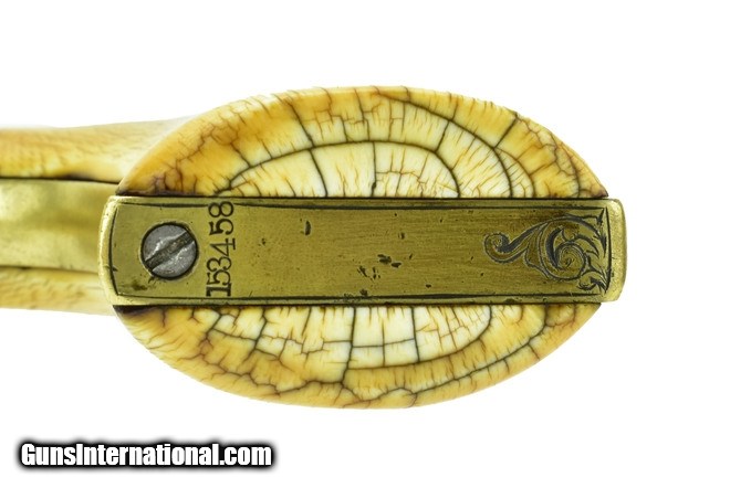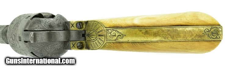Description: New York Engraved Colt 1851 Navy. Made in 1863. Gray patina on metal with spots of light pitting. Grips are old period one piece ivories. Action works well. Gun locks up tight. This gun was definitely engraved during the period of use, but the quality of the engraving is not as good as you find on some guns. We called it New York, since it is not factory, but this could just as easily been done in Mexico. SOLD Antique: Yes |