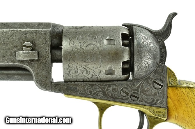 New York Engraved Colt 1851 Navy. Made in 1863. Gray patina on metal with spots of light pitting. Grips are old period one piece ivories. Action works well. Gun locks up tight. This gun was definitely engraved during the period of use, but the quality of the engraving is not as good as you find on some guns. We called it New York, since it is not factory, but this could just as easily been done in Mexico.