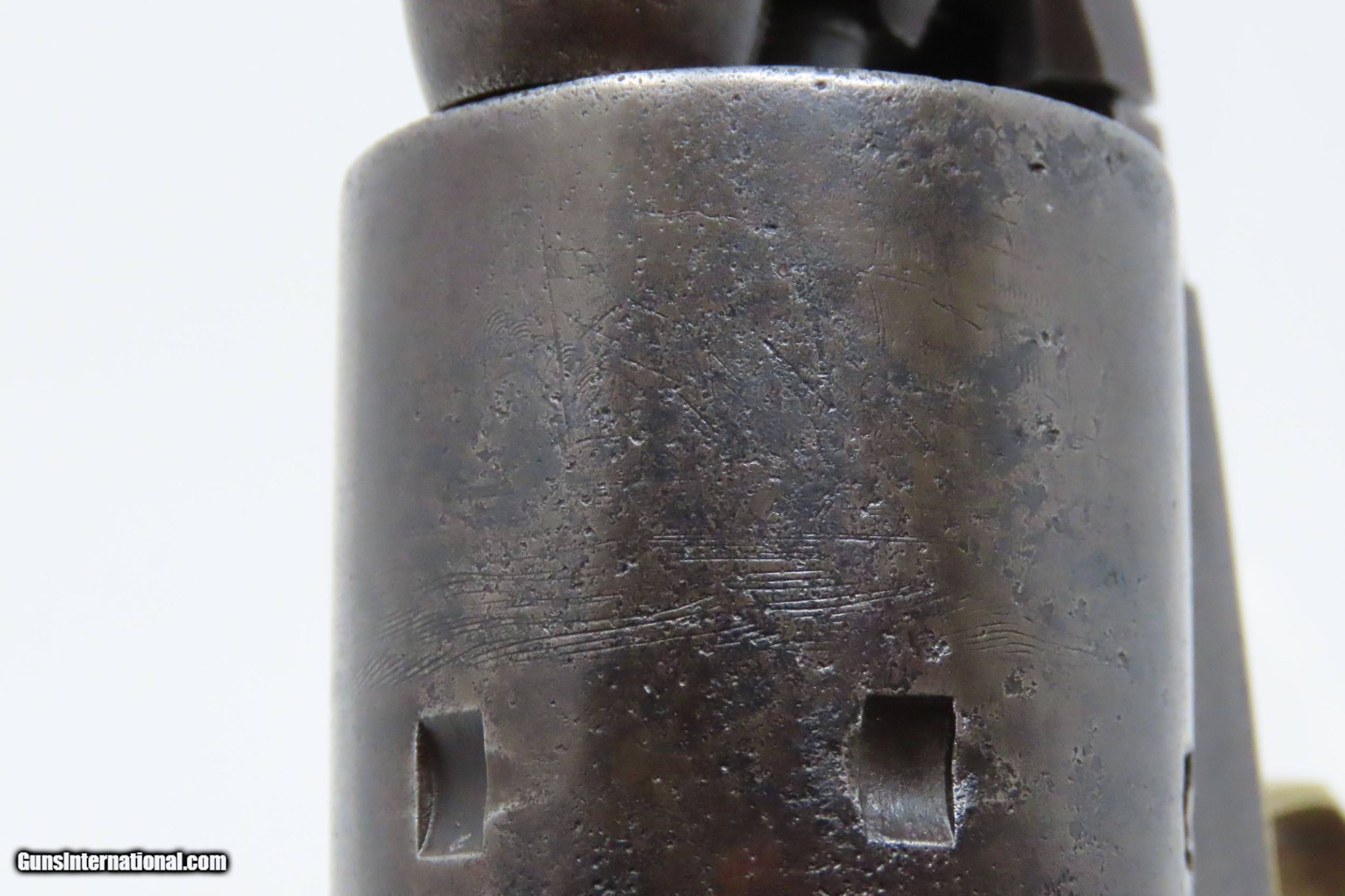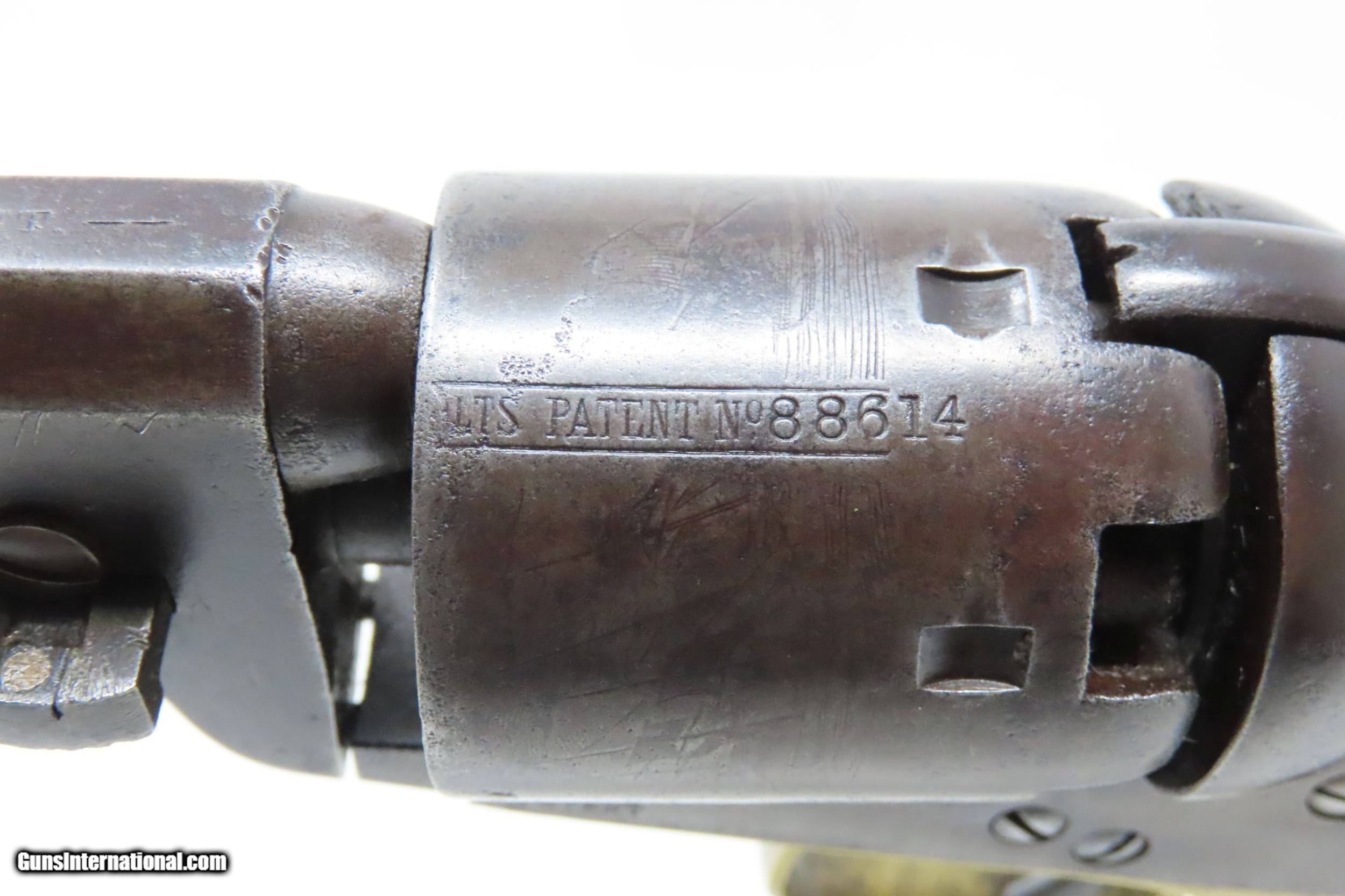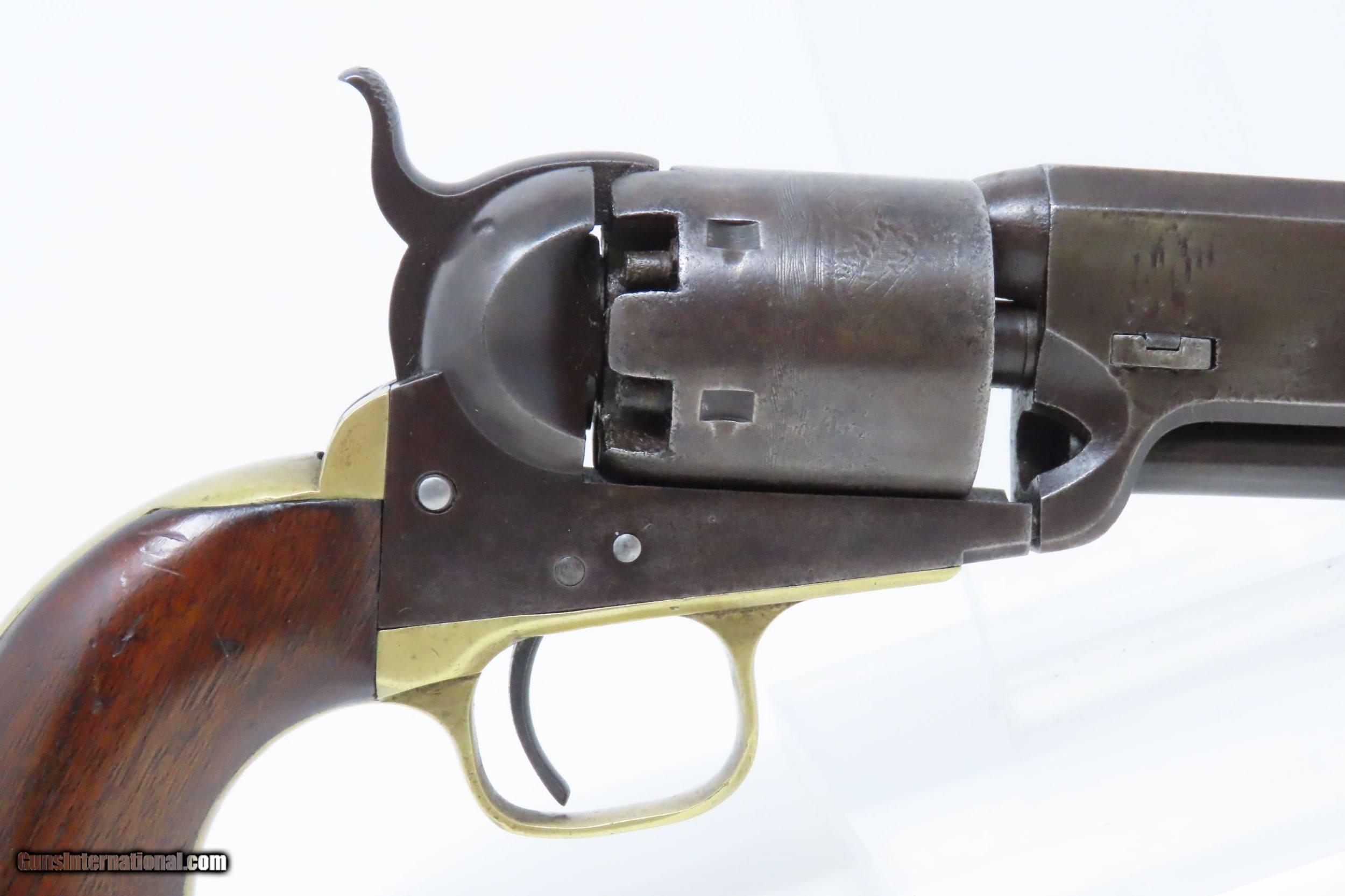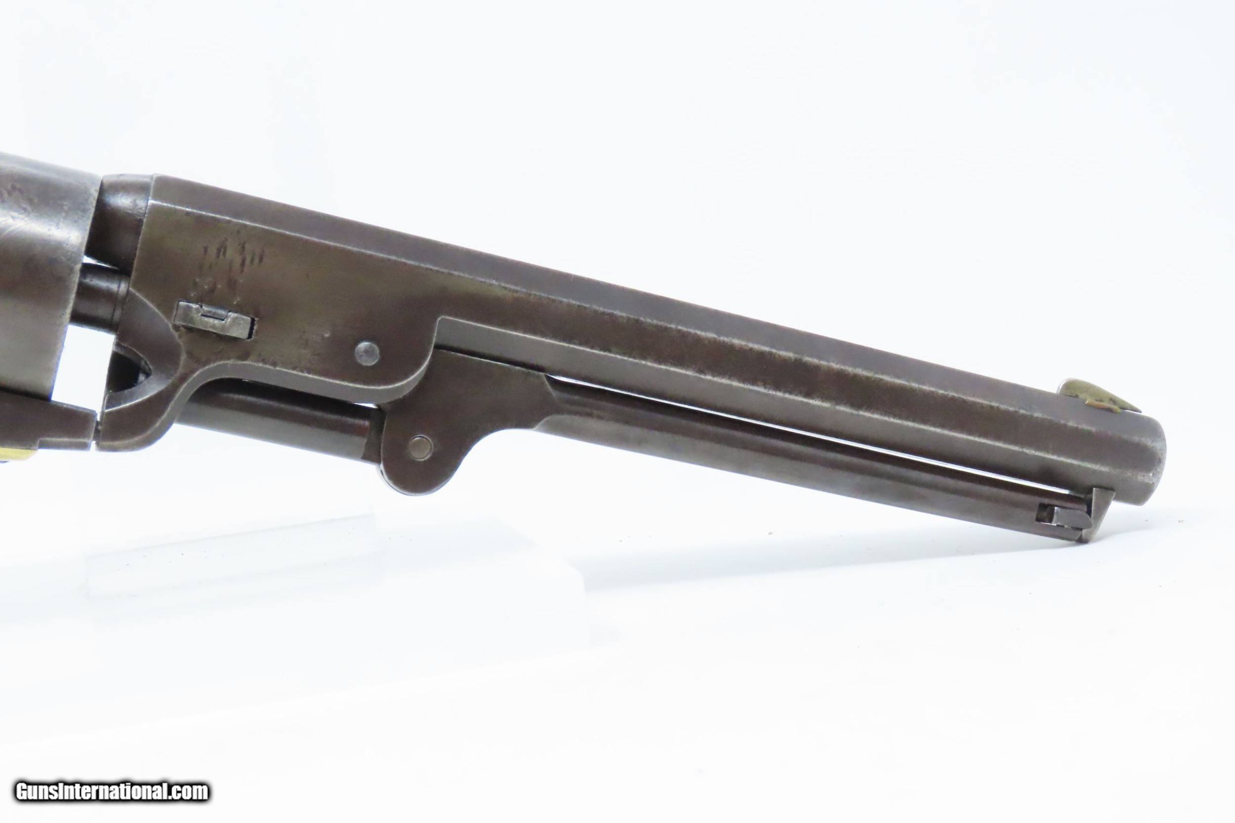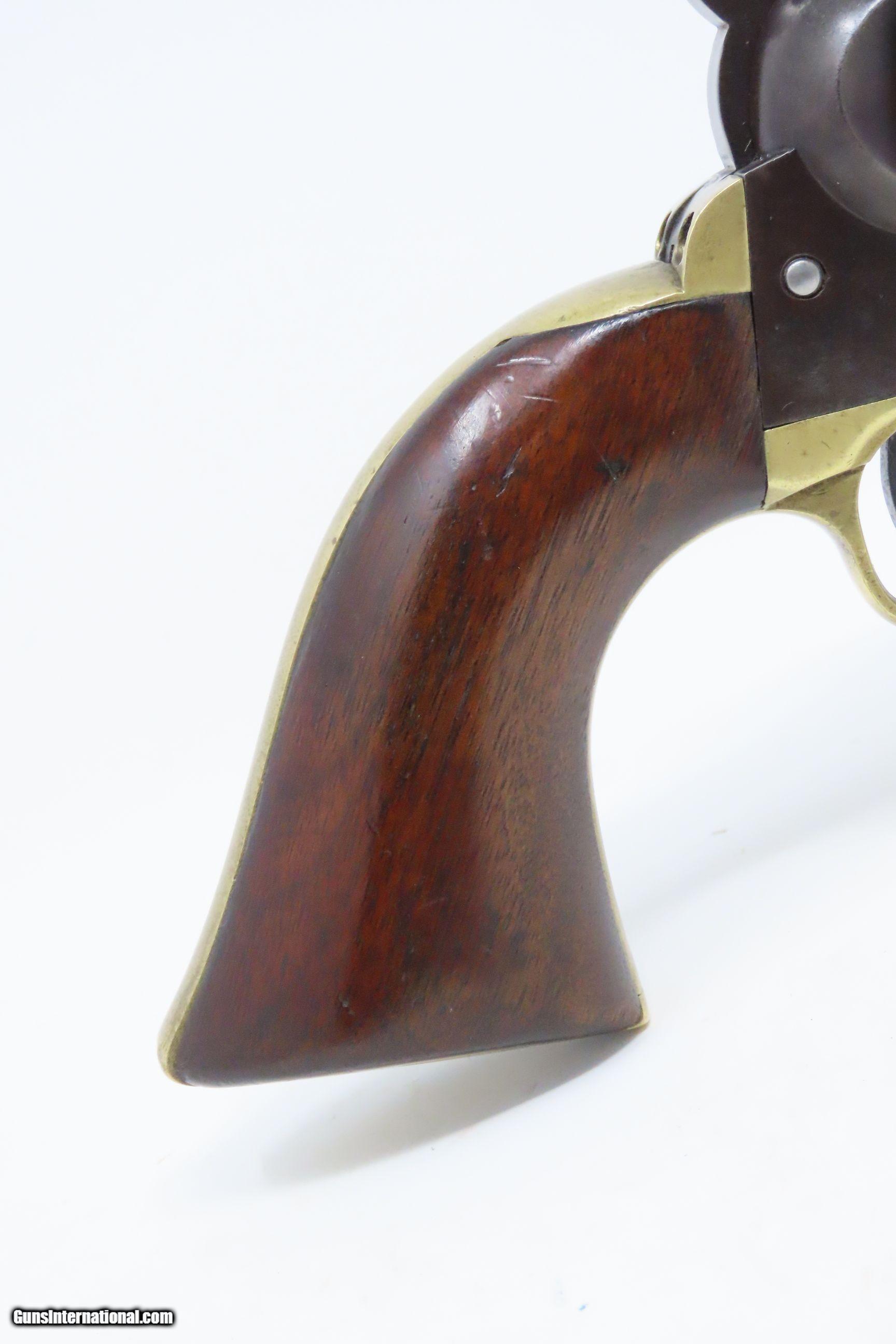 Description: Pre-CIVIL WAR Antique COLT Model 1851 NAVY .36 Caliber PERCUSSION Revolver Manufactured in 1858 in Hartford, Connecticut! Here we present an antique Colt Model 1851 Navy Percussion Revolver, made just 3 years prior to the American Civil War in 1858 in Hartford, Connecticut. The 1851 Navy was one of Colt’s most famous and successful lines, reaching a production total of 257,348 from 1850 to 1873 (right up to the time of SAA production) from both Hartford and London factories. From Hartford alone, 185,000 were made by the end of the American Civil War. Many of these saw service during the conflict on both sides. There were some military purchases and lots of private purchases by soldiers going off to war. In addition, the Model 1851 was carried by Confederate General Robert E. Lee and was a favorite of “Doc” Holliday and “Wild Bill” Hickok, who carried two of these most famously in his red sash. The Colt Model 1851 Navy, first known as the "Ranger Model" and also known as the "Revolving Belt Pistol of Naval Caliber," was designed between 1847 and 1850, manufactured from 1850 until 1873, and was the second most popular Colt percussion revolver after only the Model 1849 Pocket. Though its name implies maritime use, most Navy revolvers primarily saw use on dry land, including in the Old West, which truly, the Colt 1851 Navy revolver ushered in the era of the gunfighter. Among the many guns that were used on the western frontier, none was more popular in its day than the Colt percussion revolver designated the 1851 Navy. This single action revolver weighed in at roughly 42 ounces. Prior to the Navy's introduction, hand gunners had to make do with the Colt Walker and Dragoon revolvers, both of which weighed over four pounds. These big guns were best suited for carry in pommel holsters on the saddle. The Colt Navy was the first popular single-action revolver that could be worn comfortably on the belt. Prior to the beginning of the Civil War, the state of Missouri was a hotbed of trouble that often broke out in shooting fights. Bill Anderson, Jesse and Frank James, and the Youngers all cut their teeth on this border trouble and were ready to go when leaders like William Quantrill enlisted them in his guerilla band during the war. The boys from Missouri became quite proficient with their six-guns and generally carried a brace of Dragoons on their saddle pommels and a brace of Navy revolvers on their hip. The overall condition is very good. Excellent action. The bore is in good shape for age with sharp rifling. Dark patina. There is evident rounding of the edges of the muzzle from many times being unholstered and holstered. The blade front sight is a very nice period addition. Numbers match. The cylinder scene is intact. Though there is a little gap between frame and barrel, there is still solid connection (i.e. it is not sloppy) and the cylinder still revolves properly. The grip is in good shape with an average amount of handling wear, especially noticeable around the skirt of the grip. A well-used and still strong 1851 Navy from before the War Between the States! Own the original! This is a legitimate antique and not a reproduction. Barrel is 7-1/2 inches. Caliber: .36 Percussion Overall condition as seen in photos. Very Fast. Very Safe. FREE SHIPPING WORLDWIDE. Delivered directly to your door by express mail! Guaranteed AUTHENTIC & Includes CERTIFICATE OF AUTHENTICITY. ancestryguns $2995 #217172 SOLD Antique: Yes |