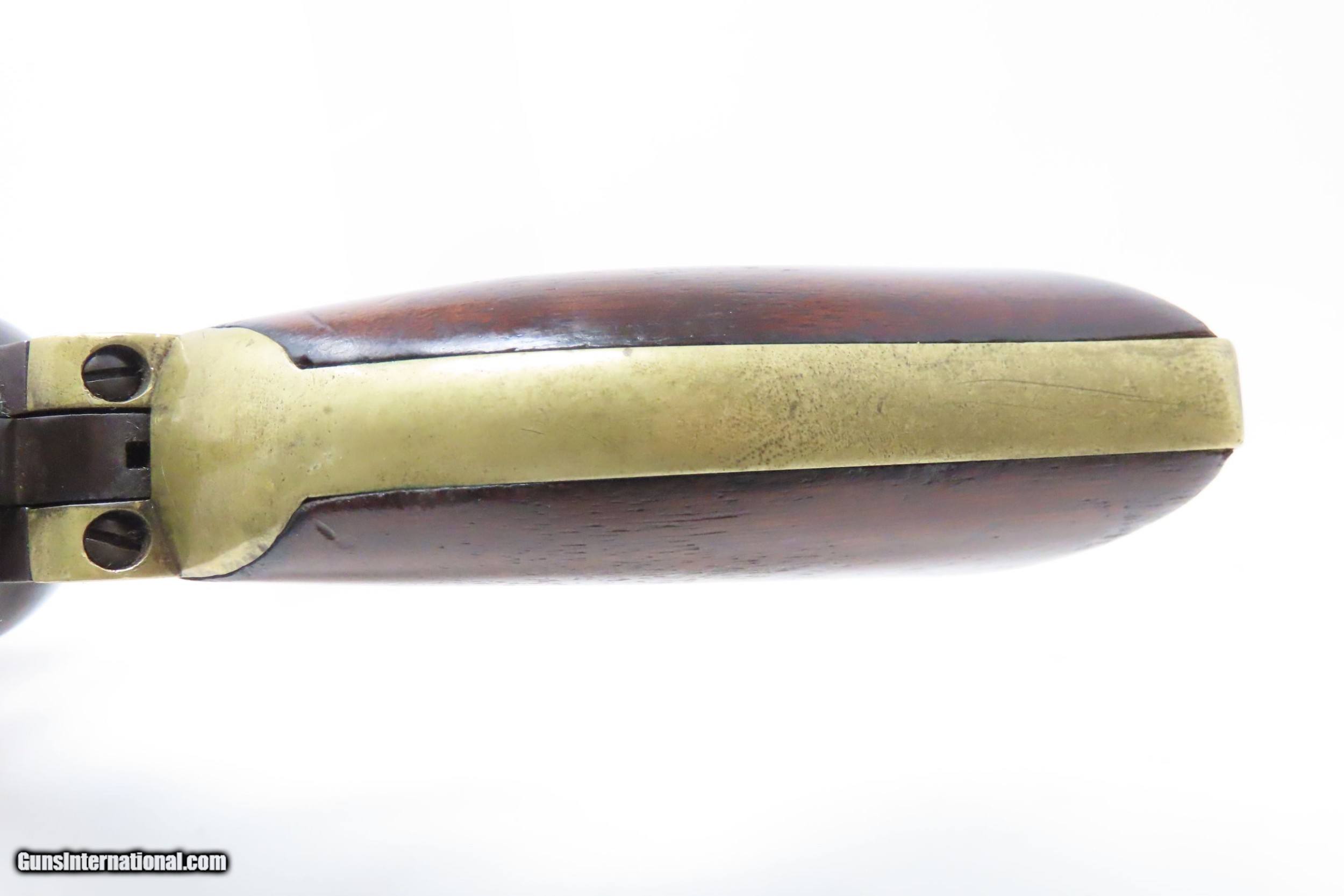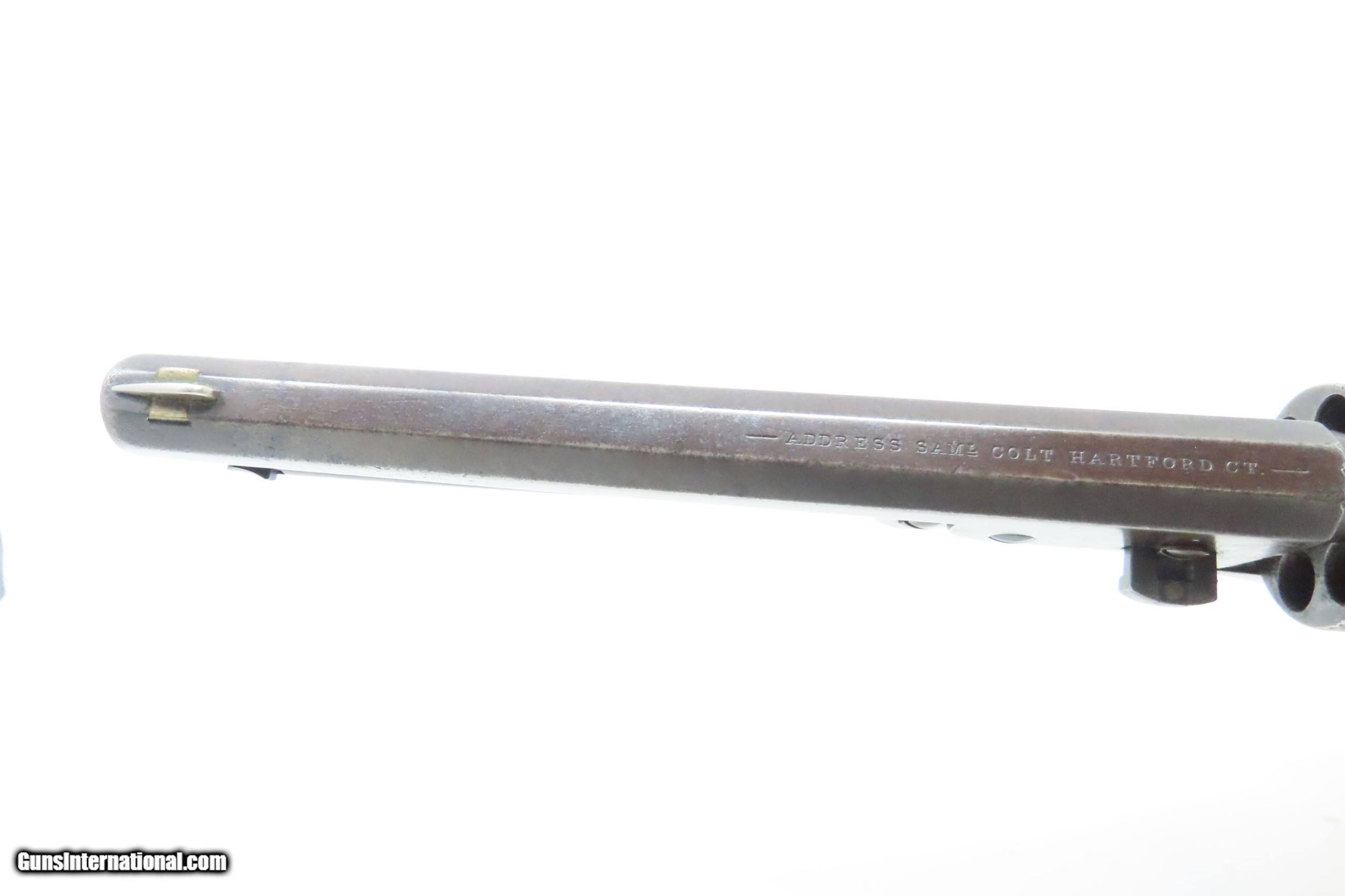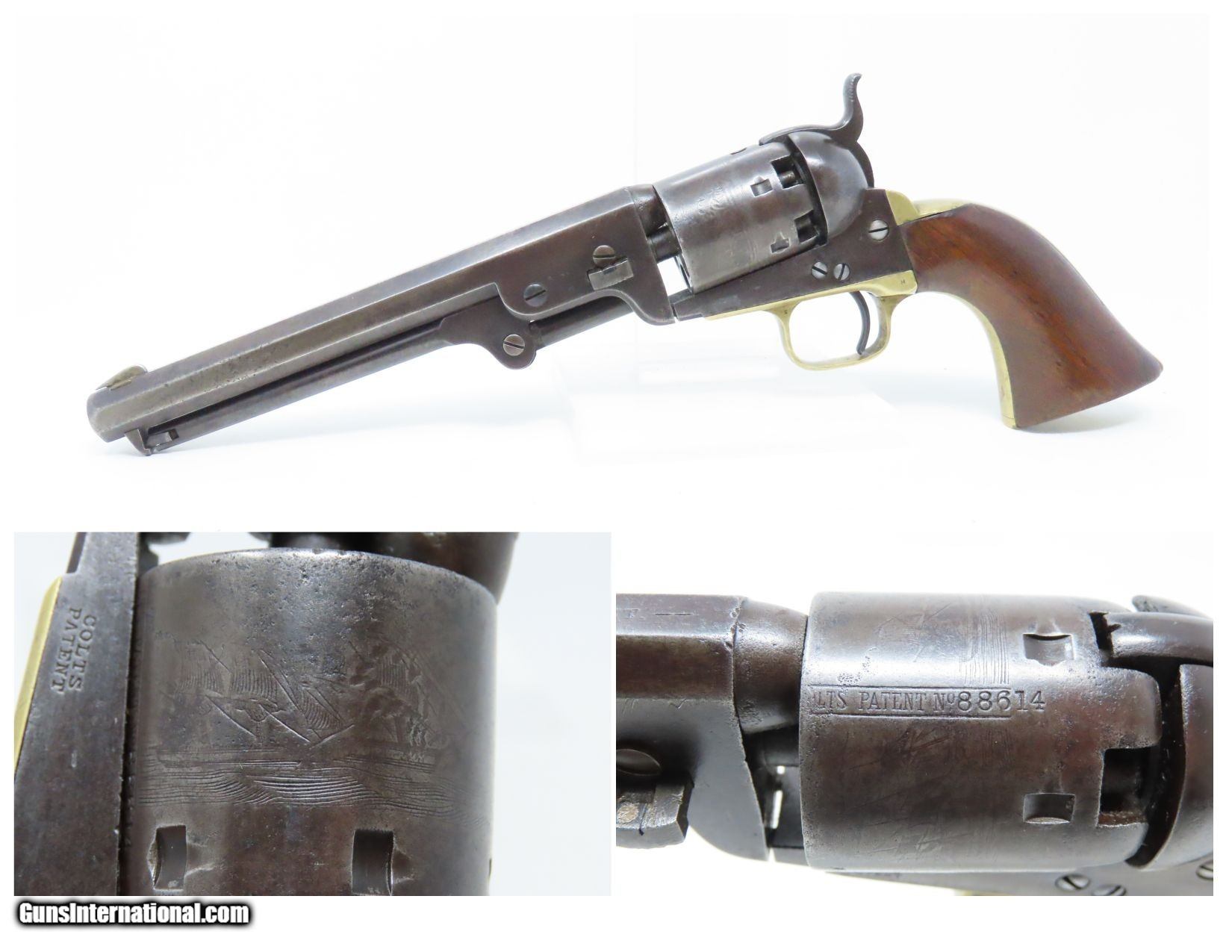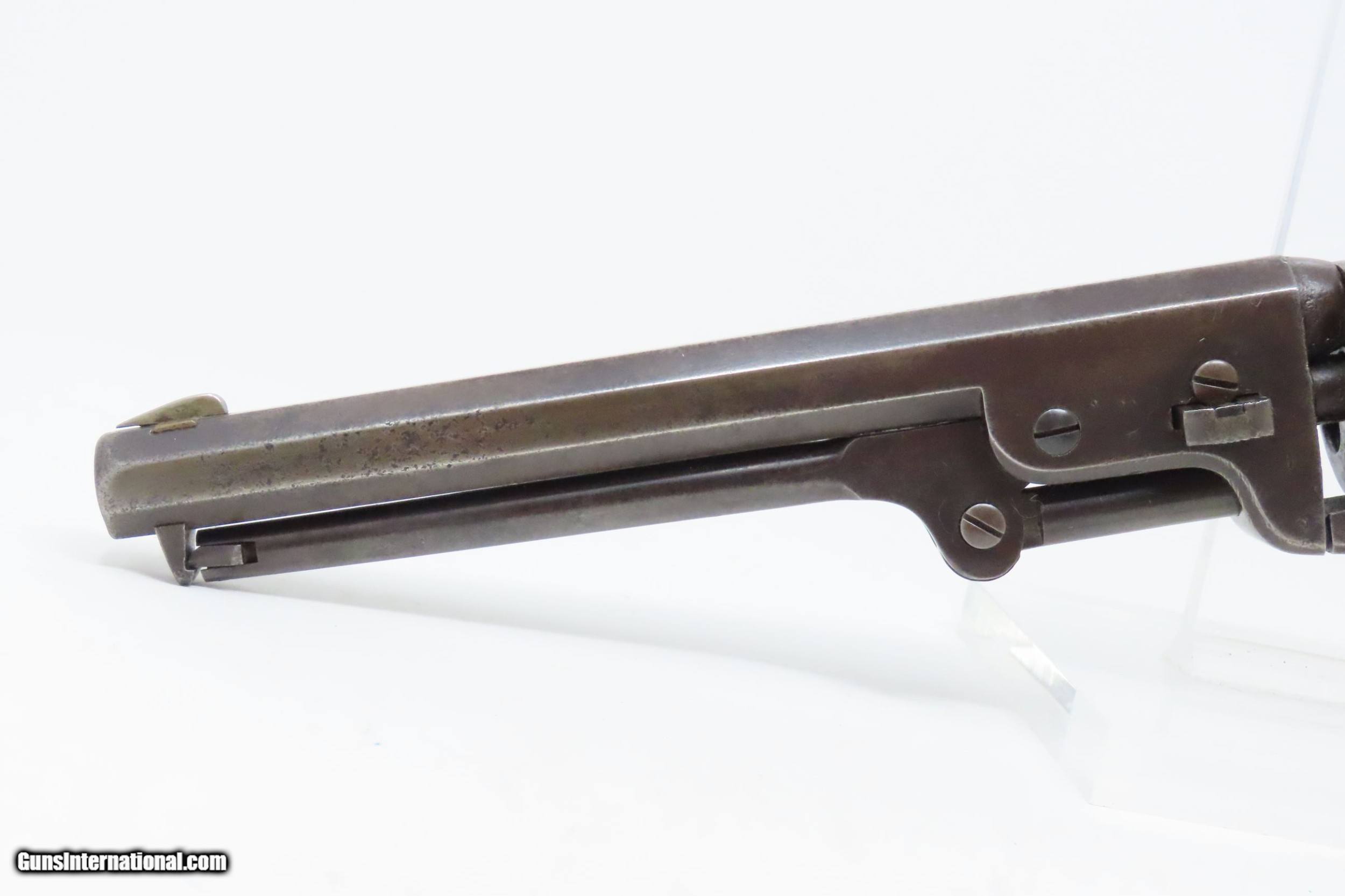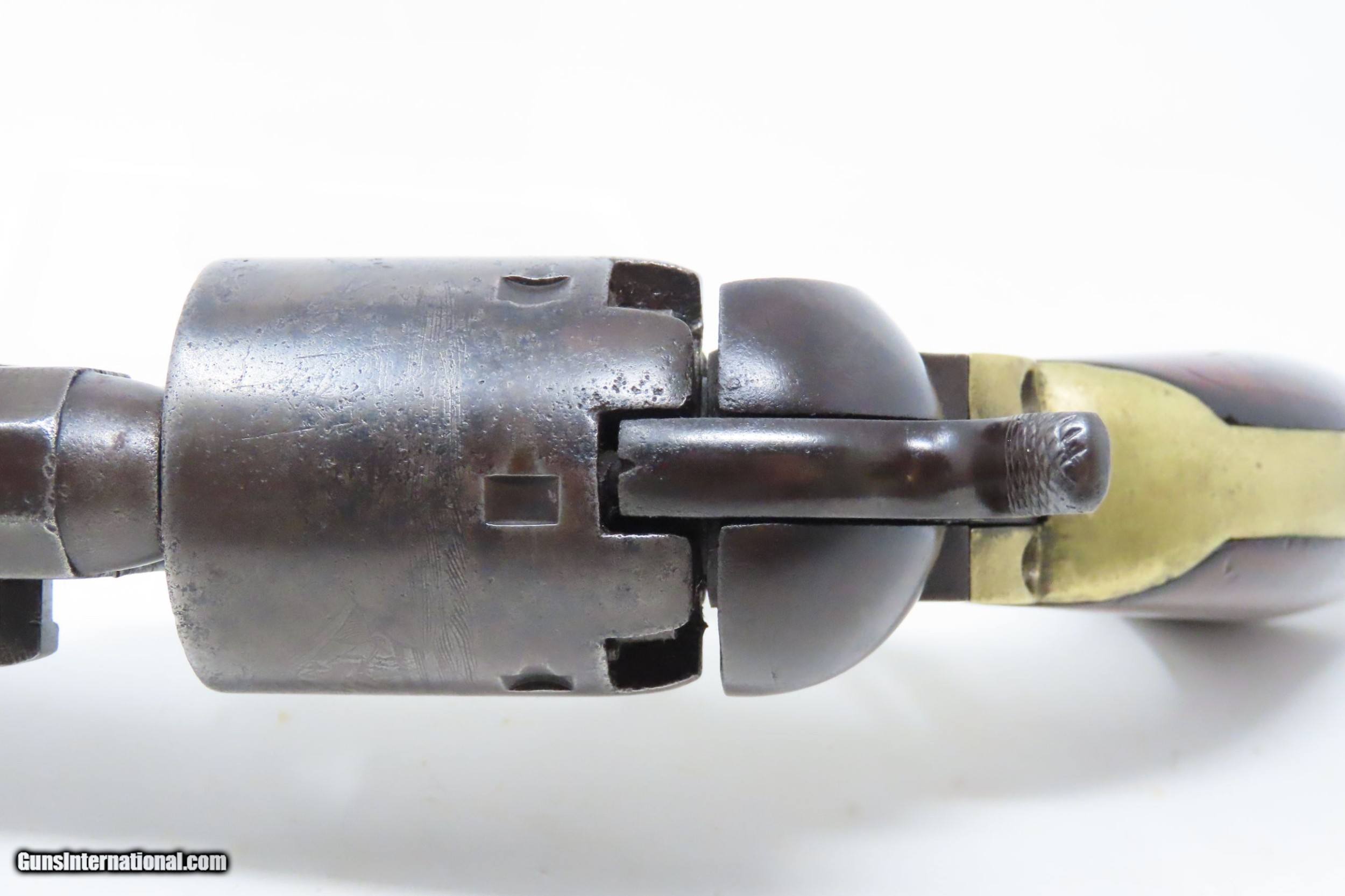 Description: Pre-CIVIL WAR Antique COLT Model 1851 NAVY .36 Caliber PERCUSSION Revolver Manufactured in 1858 in Hartford, Connecticut! Here we present an antique Colt Model 1851 Navy Percussion Revolver, made just 3 years prior to the American Civil War in 1858 in Hartford, Connecticut. The 1851 Navy was one of Colt’s most famous and successful lines, reaching a production total of 257,348 from 1850 to 1873 (right up to the time of SAA production) from both Hartford and London factories. From Hartford alone, 185,000 were made by the end of the American Civil War. Many of these saw service during the conflict on both sides. There were some military purchases and lots of private purchases by soldiers going off to war. In addition, the Model 1851 was carried by Confederate General Robert E. Lee and was a favorite of “Doc” Holliday and “Wild Bill” Hickok, who carried two of these most famously in his red sash. The Colt Model 1851 Navy, first known as the "Ranger Model" and also known as the "Revolving Belt Pistol of Naval Caliber," was designed between 1847 and 1850, manufactured from 1850 until 1873, and was the second most popular Colt percussion revolver after only the Model 1849 Pocket. Though its name implies maritime use, most Navy revolvers primarily saw use on dry land, including in the Old West, which truly, the Colt 1851 Navy revolver ushered in the era of the gunfighter. Among the many guns that were used on the western frontier, none was more popular in its day than the Colt percussion revolver designated the 1851 Navy. This single action revolver weighed in at roughly 42 ounces. Prior to the Navy's introduction, hand gunners had to make do with the Colt Walker and Dragoon revolvers, both of which weighed over four pounds. These big guns were best suited for carry in pommel holsters on the saddle. The Colt Navy was the first popular single-action revolver that could be worn comfortably on the belt. Prior to the beginning of the Civil War, the state of Missouri was a hotbed of trouble that often broke out in shooting fights. Bill Anderson, Jesse and Frank James, and the Youngers all cut their teeth on this border trouble and were ready to go when leaders like William Quantrill enlisted them in his guerilla band during the war. The boys from Missouri became quite proficient with their six-guns and generally carried a brace of Dragoons on their saddle pommels and a brace of Navy revolvers on their hip. The overall condition is very good. Excellent action. The bore is in good shape for age with sharp rifling. Dark patina. There is evident rounding of the edges of the muzzle from many times being unholstered and holstered. The blade front sight is a very nice period addition. Numbers match. The cylinder scene is intact. Though there is a little gap between frame and barrel, there is still solid connection (i.e. it is not sloppy) and the cylinder still revolves properly. The grip is in good shape with an average amount of handling wear, especially noticeable around the skirt of the grip. A well-used and still strong 1851 Navy from before the War Between the States! Own the original! This is a legitimate antique and not a reproduction. Barrel is 7-1/2 inches. Caliber: .36 Percussion Overall condition as seen in photos. Very Fast. Very Safe. FREE SHIPPING WORLDWIDE. Delivered directly to your door by express mail! Guaranteed AUTHENTIC & Includes CERTIFICATE OF AUTHENTICITY. ancestryguns $2995 #217172 SOLD Antique: Yes |