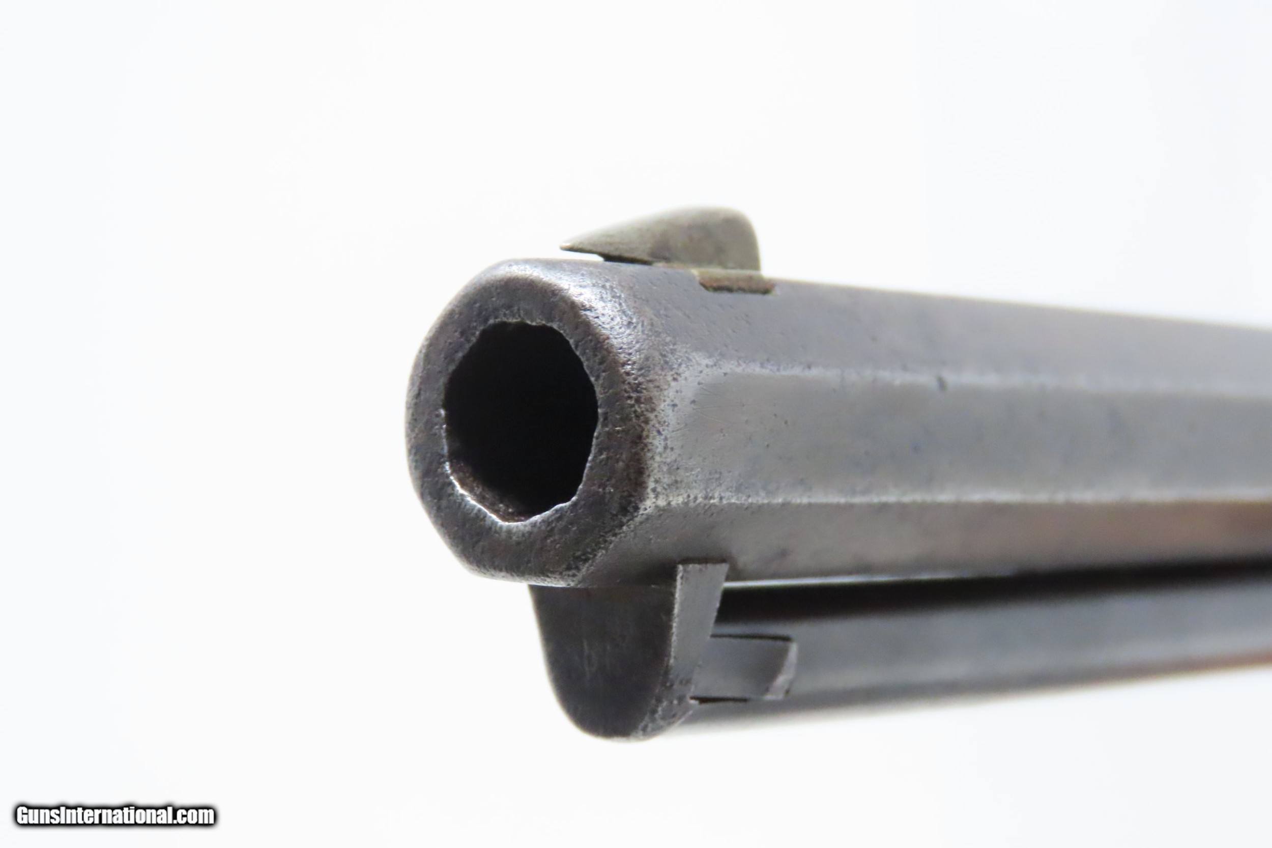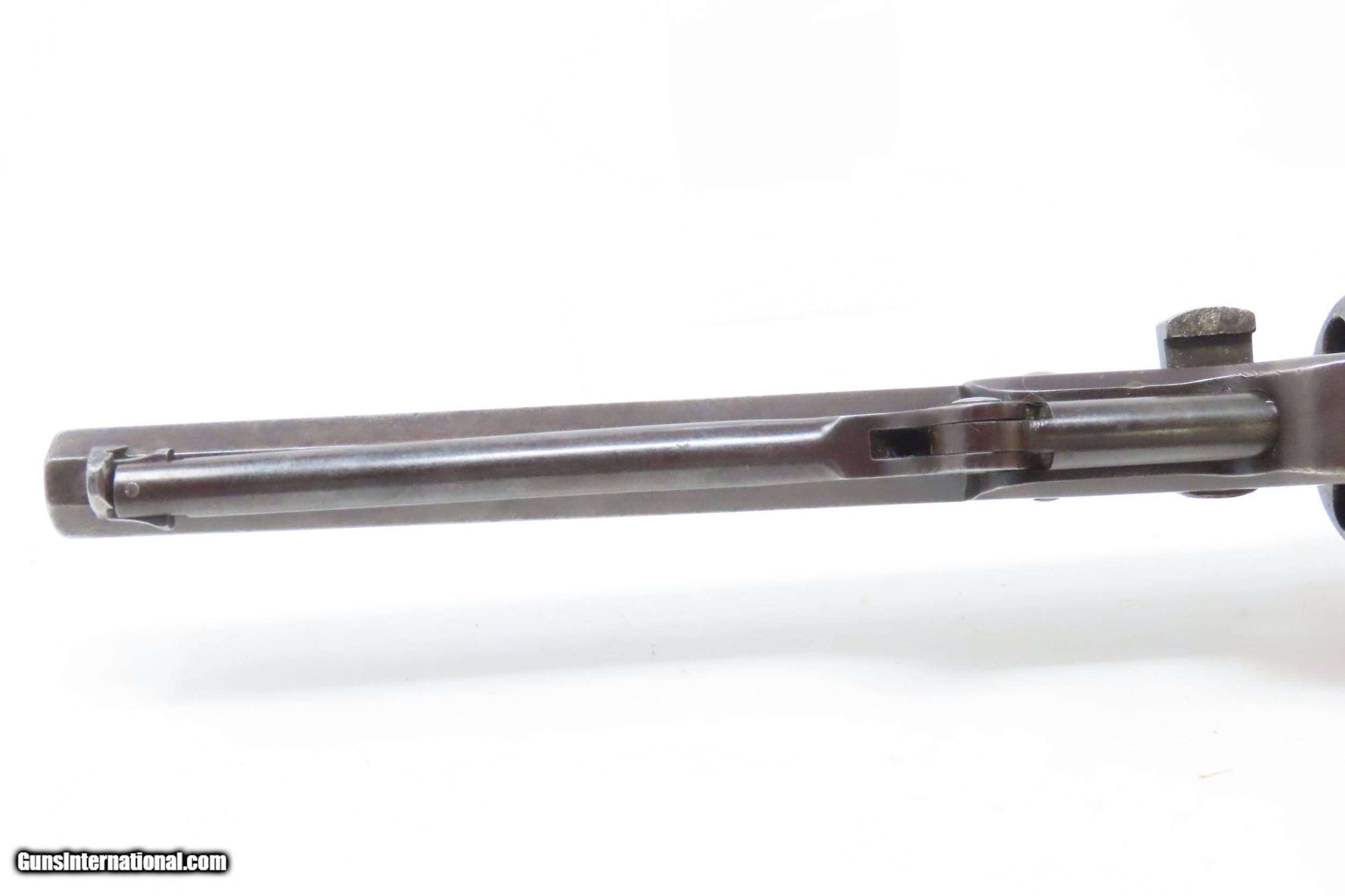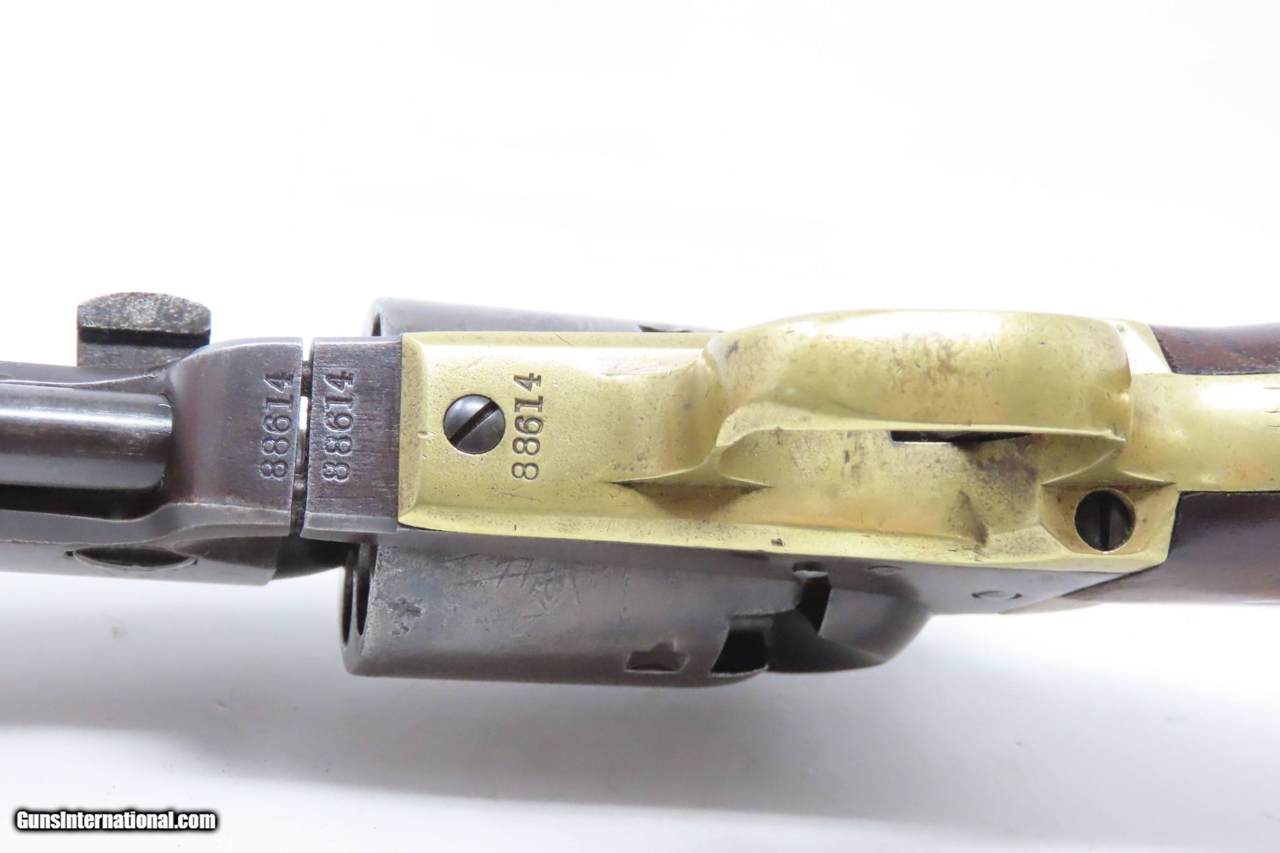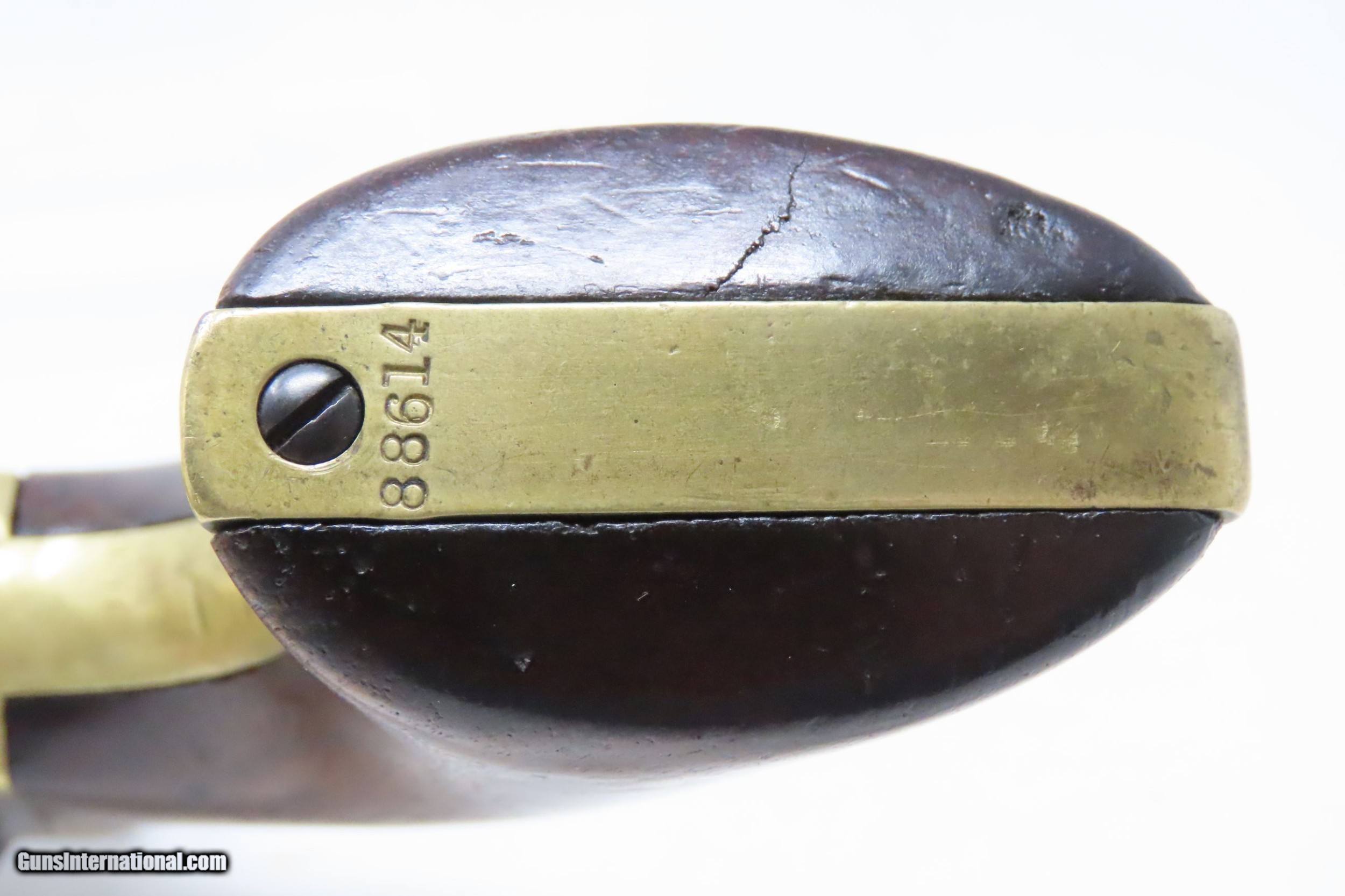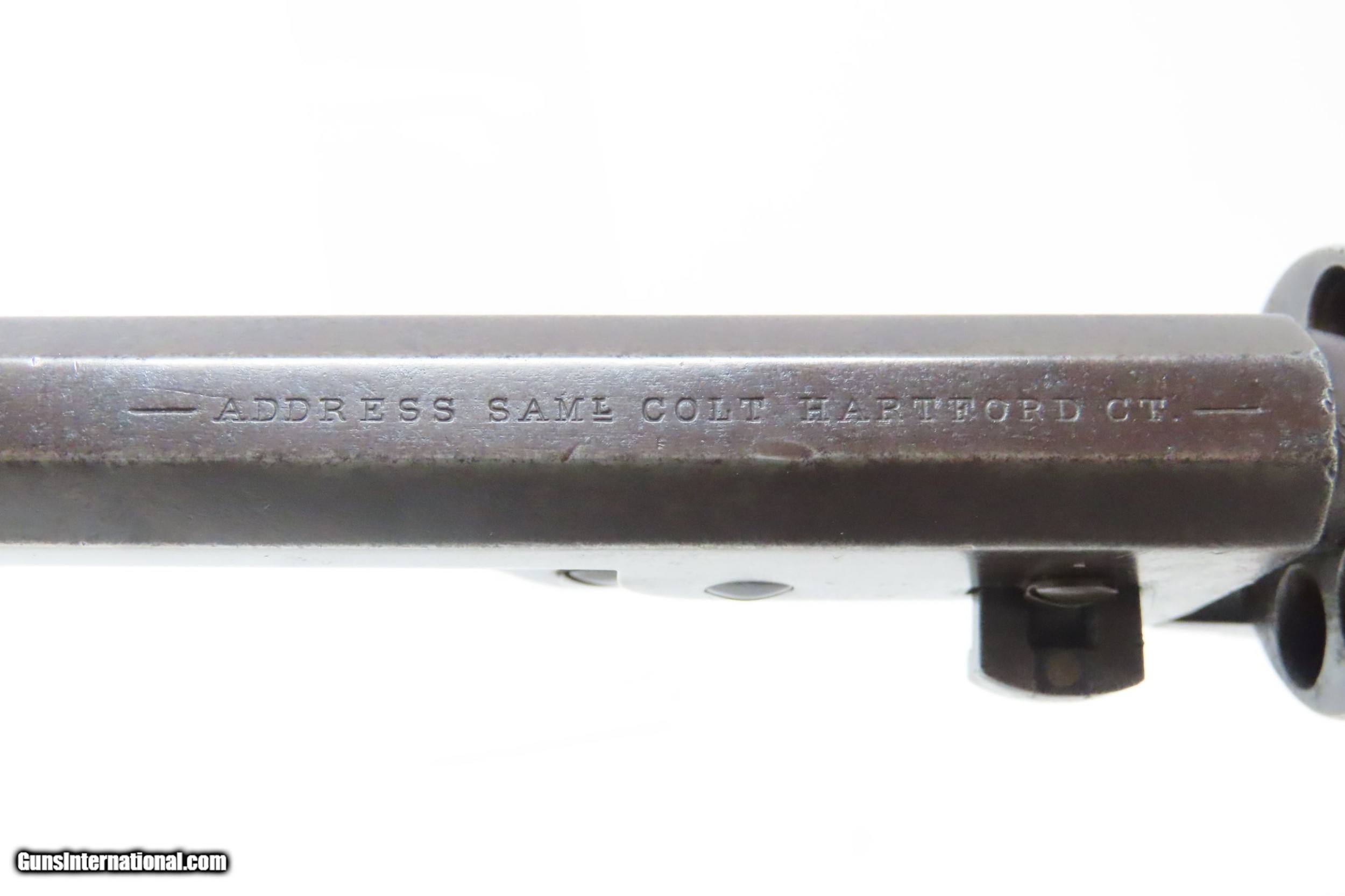 Description: Pre-CIVIL WAR Antique COLT Model 1851 NAVY .36 Caliber PERCUSSION Revolver Manufactured in 1858 in Hartford, Connecticut! Here we present an antique Colt Model 1851 Navy Percussion Revolver, made just 3 years prior to the American Civil War in 1858 in Hartford, Connecticut. The 1851 Navy was one of Colt’s most famous and successful lines, reaching a production total of 257,348 from 1850 to 1873 (right up to the time of SAA production) from both Hartford and London factories. From Hartford alone, 185,000 were made by the end of the American Civil War. Many of these saw service during the conflict on both sides. There were some military purchases and lots of private purchases by soldiers going off to war. In addition, the Model 1851 was carried by Confederate General Robert E. Lee and was a favorite of “Doc” Holliday and “Wild Bill” Hickok, who carried two of these most famously in his red sash. The Colt Model 1851 Navy, first known as the "Ranger Model" and also known as the "Revolving Belt Pistol of Naval Caliber," was designed between 1847 and 1850, manufactured from 1850 until 1873, and was the second most popular Colt percussion revolver after only the Model 1849 Pocket. Though its name implies maritime use, most Navy revolvers primarily saw use on dry land, including in the Old West, which truly, the Colt 1851 Navy revolver ushered in the era of the gunfighter. Among the many guns that were used on the western frontier, none was more popular in its day than the Colt percussion revolver designated the 1851 Navy. This single action revolver weighed in at roughly 42 ounces. Prior to the Navy's introduction, hand gunners had to make do with the Colt Walker and Dragoon revolvers, both of which weighed over four pounds. These big guns were best suited for carry in pommel holsters on the saddle. The Colt Navy was the first popular single-action revolver that could be worn comfortably on the belt. Prior to the beginning of the Civil War, the state of Missouri was a hotbed of trouble that often broke out in shooting fights. Bill Anderson, Jesse and Frank James, and the Youngers all cut their teeth on this border trouble and were ready to go when leaders like William Quantrill enlisted them in his guerilla band during the war. The boys from Missouri became quite proficient with their six-guns and generally carried a brace of Dragoons on their saddle pommels and a brace of Navy revolvers on their hip. The overall condition is very good. Excellent action. The bore is in good shape for age with sharp rifling. Dark patina. There is evident rounding of the edges of the muzzle from many times being unholstered and holstered. The blade front sight is a very nice period addition. Numbers match. The cylinder scene is intact. Though there is a little gap between frame and barrel, there is still solid connection (i.e. it is not sloppy) and the cylinder still revolves properly. The grip is in good shape with an average amount of handling wear, especially noticeable around the skirt of the grip. A well-used and still strong 1851 Navy from before the War Between the States! Own the original! This is a legitimate antique and not a reproduction. Barrel is 7-1/2 inches. Caliber: .36 Percussion Overall condition as seen in photos. Very Fast. Very Safe. FREE SHIPPING WORLDWIDE. Delivered directly to your door by express mail! Guaranteed AUTHENTIC & Includes CERTIFICATE OF AUTHENTICITY. ancestryguns $2995 #217172 SOLD Antique: Yes |