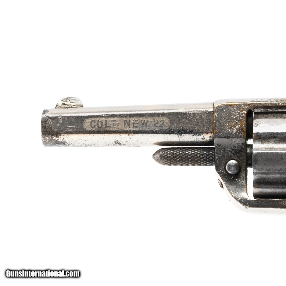 Description: " The Colt New Line seven-shot 22 revolver was made between 1873 and 1877. This is the second model with long cylinder flutes. The left side of the barrel is etched COLT NEW 22 and the top has the standard Colt name and address. The 2.25"" barrel has a good bore with some firing erosion. The gun retains approx. 85% of its nikel finish with loss on the barrel bottom, top strap, cylinder, and left side. The top strap has a series of small dents. This revolver is circa 1876. The rosewood grips are fine. The action functions correctly. SOLD Antique: Yes |