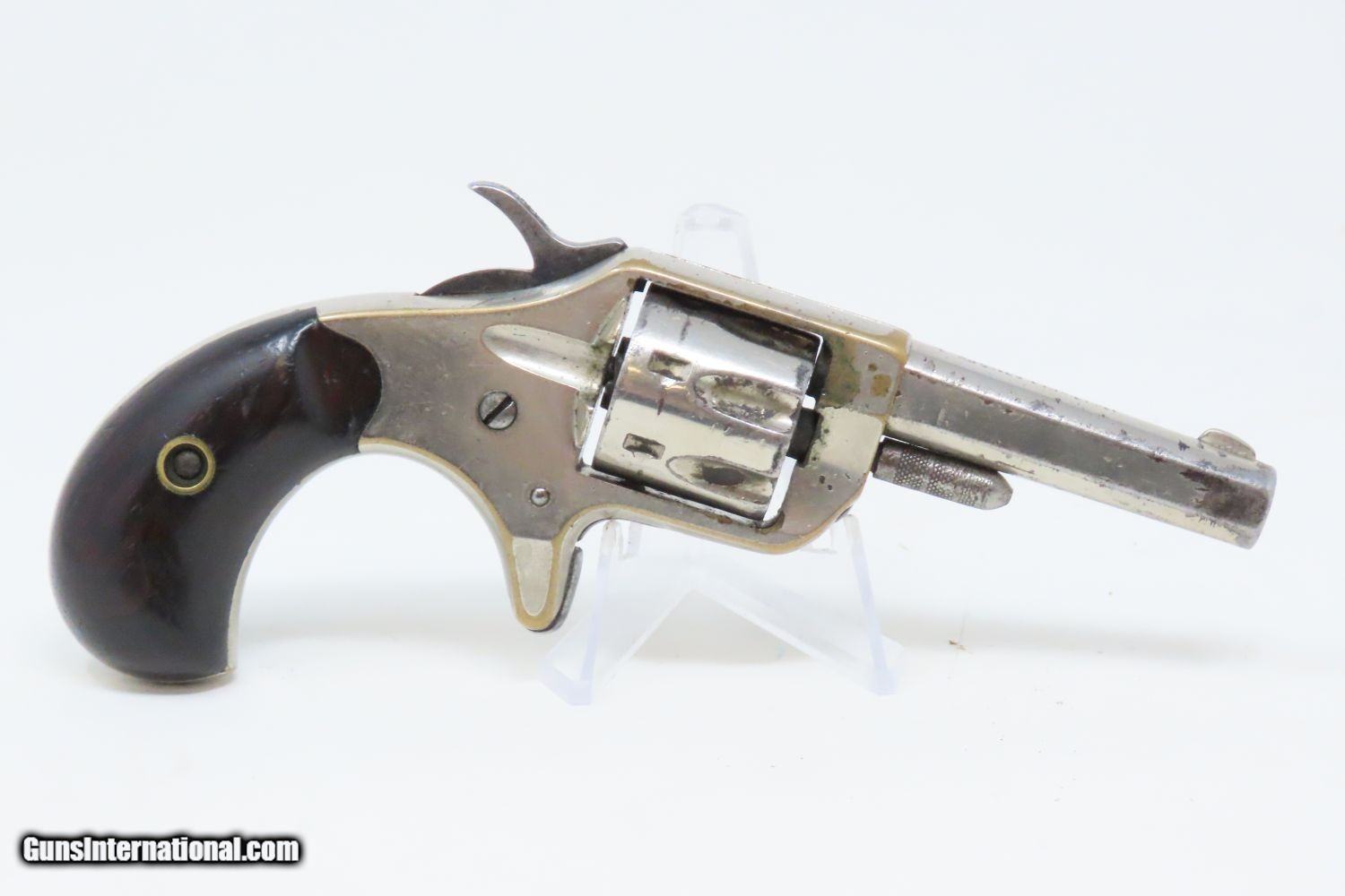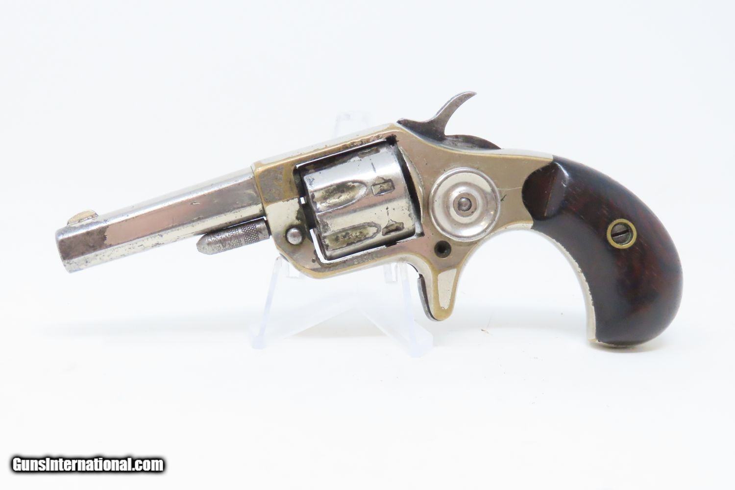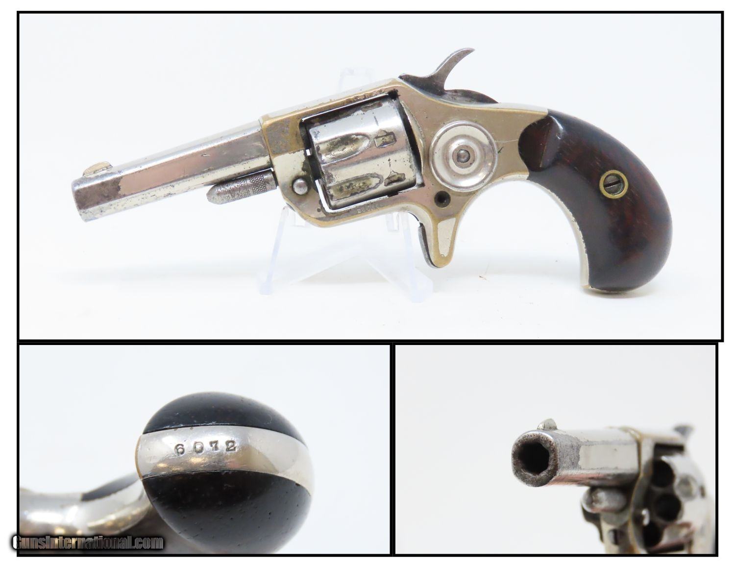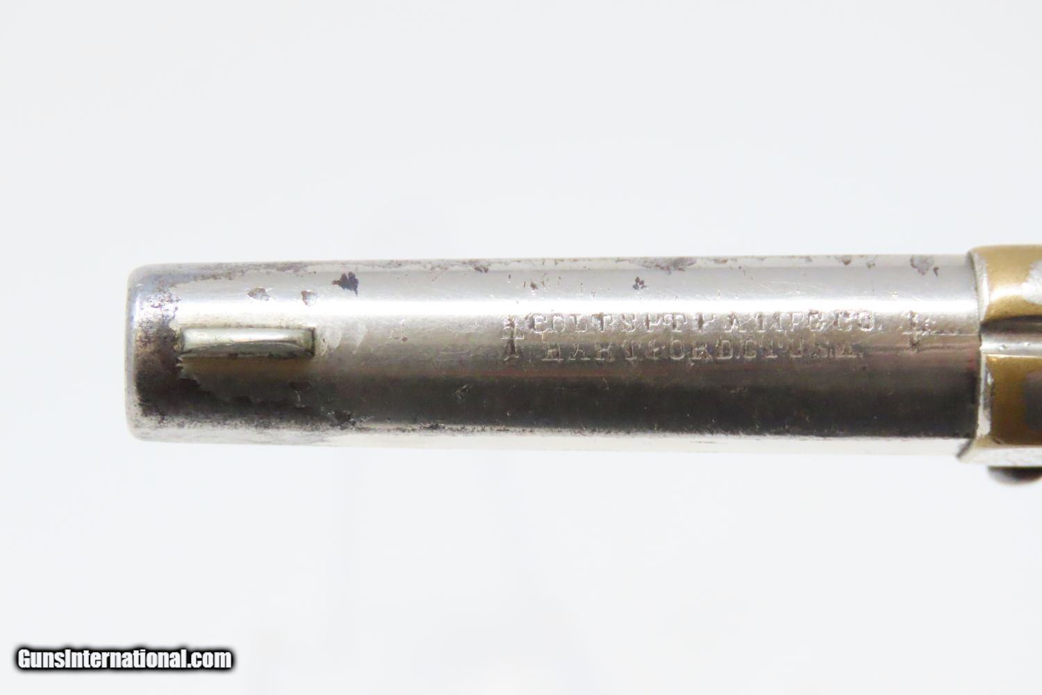 Description: Antique 7-Shot COLT “NEW LINE” .22 Rimfire Spur Trigger POCKET Revolver Late Manufactured with Nickel Plating! Here we present an antique Colt New Line .22 Revolver First Model, made in 1877 in Hartford, Connecticut. The New Line was a single action pocket revolver introduced by the Colt’s Patent Fire Arms Manufacturing Company in 1873 and continued through 1877. Two years after the Colt House Revolver, a year after the Colt Open Top, and almost simultaneously alongside the Colt Peacemaker, the Colt New Line was one of the first metallic cartridge, rear-loading revolvers manufactured by Colt. It was designed to be a handy pocket-carry revolver, chambered in .22 rimfire, which was very popular for self-defense in these days. The revolver features 7 shots of .22 rimfire. Of all the Colt “New Line” revolvers made, the .22 caliber was the only one featuring a 7 shot cylinder. All other calibers utilized a 5-shot cylinder. Patent dates are on the bottom of the barrel. The overall condition is very good. The action is strong. The original nickel finish remains bright with some brass showing through on the corners. The head of the trigger screw is broken, though this is only aesthetic and does not affect the mechanics of the revolver. Both rosewood grips are firm with expected handling wear. All markings are clear and the number match! The bore is bright with nice rifling. A very nice little 7-shot .22 from Colt! Own the original! This is a legitimate antique and not a reproduction. Barrel is 2-1/4 inches. Caliber: .22 Rimfire Short Overall condition as seen in photos. Very Fast. Very Safe. FREE SHIPPING WORLDWIDE. Delivered directly to your door by express mail! Guaranteed AUTHENTIC & Includes CERTIFICATE OF AUTHENTICITY. ancestryguns $1045 #201504 SOLD Antique: Yes |