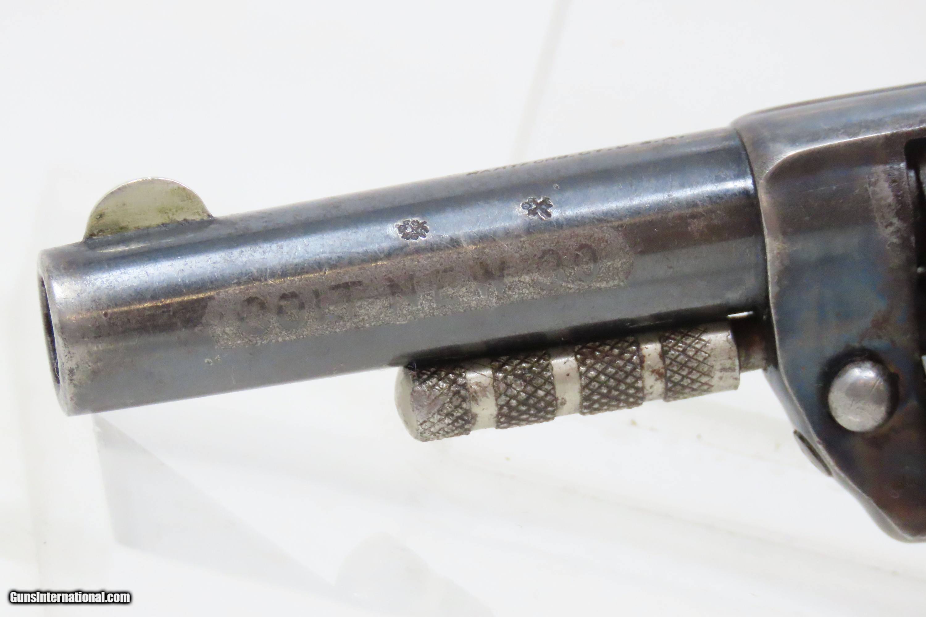 Description: Antique COLT “NEW LINE” .30 RF ETCHED PANEL Pocket Revolver ANTIQUE IVORIES BRITISH PROOFED Blued SELF DEFENSE HIDEOUT Revolver Here we present an antique British Proofed Etched Panel Colt New Line .30 Caliber Revolver, made in 1876 in Hartford, Connecticut. A single action revolver, this small pocket revolver was one of a number of inexpensive handguns produced by Colt from 1873 to 1884. The “New Line” was Colt’s first production model handgun chambered for .32 caliber and outnumbered all other pistols in Colt’s “New Line” group. This revolver utilized a .30 caliber cartridge matched to a 5-shot fluted cylinder fitted to a 2-1/4” long round barrel. The .30 caliber models were manufactured between 1874 and 1876 with 10,946 revolvers being produced. This revolver was designed to be a small but potent self-defense revolver for stowing in one’s pocket in the 19th Century. Spur Trigger “Suicide Special” manufacture was fierce during this time, and Colt struggled to compete against the countless small shops making very similar, less expensive revolvers, though not necessarily of the same quality. The Colt remained a steady, reliable force in firearms for much longer than the rest. This revolver features 5 shots of .30 caliber, a handsome blued finish and antique ivory grips. The New Line series of revolvers, including all calibers, was a single action pocket revolver introduced by the Colt’s Patent Fire Arms Manufacturing Company in 1873 and continued through 1884. Two years after the Colt House Revolver, a year after the Colt Open Top, and almost simultaneously alongside the Colt Peacemaker, the Colt New Line was one of the first metallic cartridge, rear-loading revolvers manufactured by Colt. The overall condition is very good. Original blue. The bore is rifled and in good shape. The action needs a little bit of work as the hammer doesn’t fully cock without indexing the cylinder manually. Markings are legible. A crack is present on the right grip yet remains seated firmly. Numbers match. The arbor pin is a replacement and does not sit flush against the frame. Own the original! This is a legitimate antique and not a reproduction. Barrel is 2-1/4 inches. Caliber: .30 Rimfire Overall condition as seen in photos. Very Fast. Very Safe. FREE SHIPPING WORLDWIDE. Delivered directly to your door by express mail! Guaranteed AUTHENTIC & Includes CERTIFICATE OF AUTHENTICITY. ancestryguns $1200 #240035 SOLD Antique: Yes |