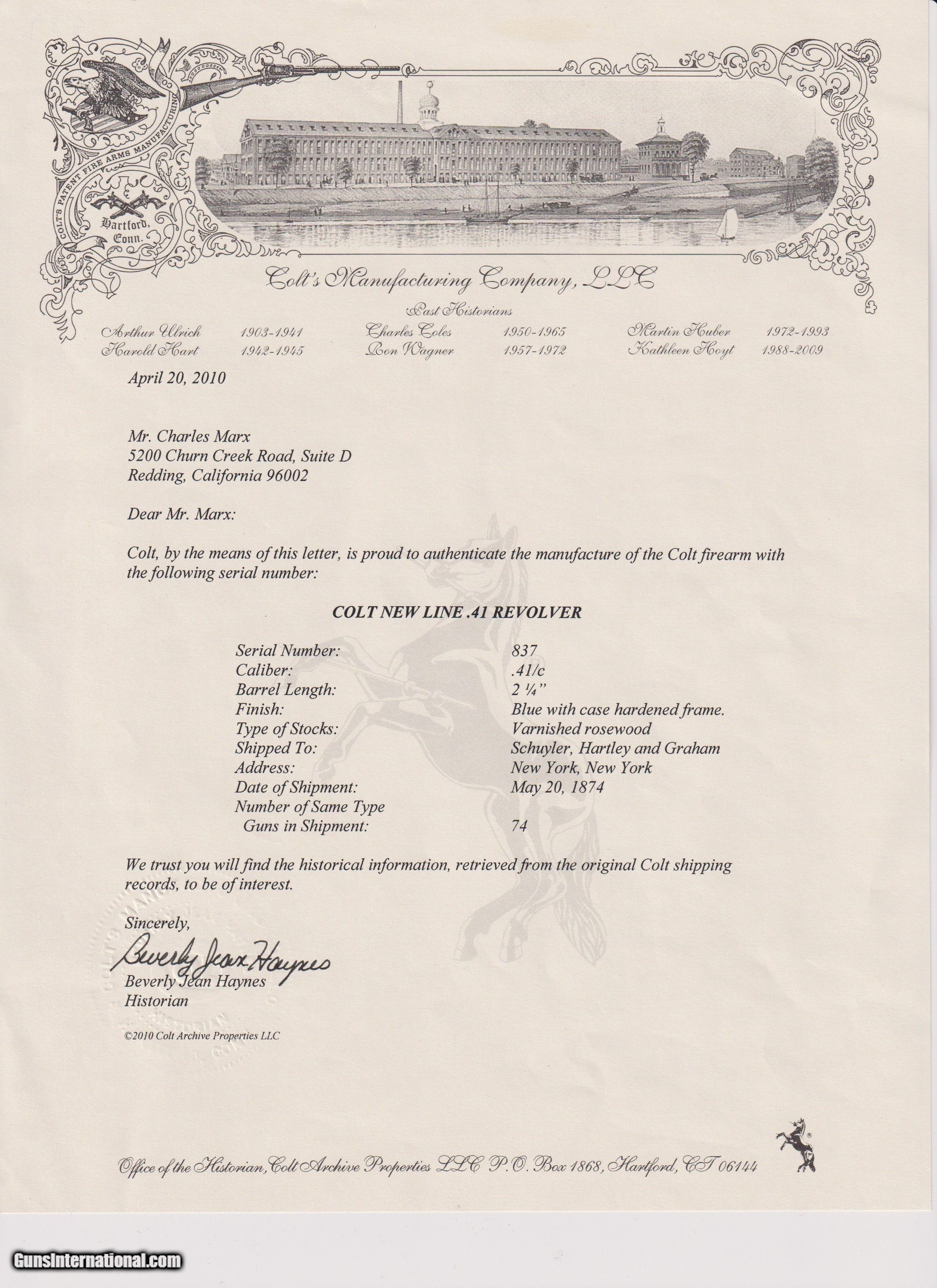 Description: LETTERED Antique Engraved Gold COLT NEW LINE .41 RF Revolver w/PEARL GRIPS NEW YORK Shipped to SCHUYLER, HARTLEY & GRAHAM Here Ancestry Guns presents an antique Gold Plated, Engraved and Factory Lettered Colt “New Line” .41 Caliber Rimfire Revolver made in 1874 in Hartford, Connecticut. This handy little 5-shot Colt, referred to as the “Big Colt” when it came out, carried quite the punch for a pocket self-defense revolver. The large caliber of this variation makes it the most desirable of the “New Lines” with approximately 10,702 manufactured from 1874-1879 due to the short production run. This revolver was designed to be a small but potent self-defense revolver for stowing in one’s pocket in the 19th Century. Spur Trigger manufacture was fierce during this time, and Colt struggled to compete against the countless small shops making very similar, less expensive revolvers, though not necessarily of the same quality. The Colt remained a steady, reliable force in firearms for much longer than the rest. The New Line series of revolvers, including all calibers, was a single action pocket revolver introduced by the Colt’s Patent Fire Arms Manufacturing Company in 1873 and continued through 1884. Two years after the Colt House Revolver, a year after the Colt Open Top, and almost simultaneously alongside the Colt Peacemaker, the Colt New Line was one of the first metallic cartridge, rear-loading revolvers manufactured by Colt. With such a limited number of examples and the larger caliber, this is a very desirable firearm for a Colt collector. The included factory letter lists the revolver in .41 caliber with blue and casehardened finish and varnished rosewood grips when shipped to Schuyler, Hartley & Graham in New York on May 20, 1874, as part of a 74 gun shipment. Schuyler, Hartley & Graham was the largest firearms dealer in the United States in 1860. Jacob Rutsen Schuyler (1816-1887), Marcellus Hartley (1828-1902) and Malcolm Graham (1832-1899) incorporated their company on March 1, 1854. In 1876 Schuyler retired from the company and by 1880 they changed the name to Hartley and Graham. The overall condition is nearing fine. Some original finishes are preserved sharing space with a bright gray patina. Excellent action. The bore is bright with a few spots of pitting and sharp rifling. Crisp engravings. Markings are legible. Visible numbers match. Own the original! This is a legitimate antique and not a reproduction. Barrel is 2-1/4 inches. Caliber: .41 Rimfire Grips: Pearl Overall condition as seen in photos. Very Fast. Very Safe. FREE SHIPPING WORLDWIDE. Delivered directly to your door by express mail! Guaranteed AUTHENTIC & Includes CERTIFICATE OF AUTHENTICITY. $4500 #259584 Antique: Yes Price: $4,500.00 Buy Now Pay with