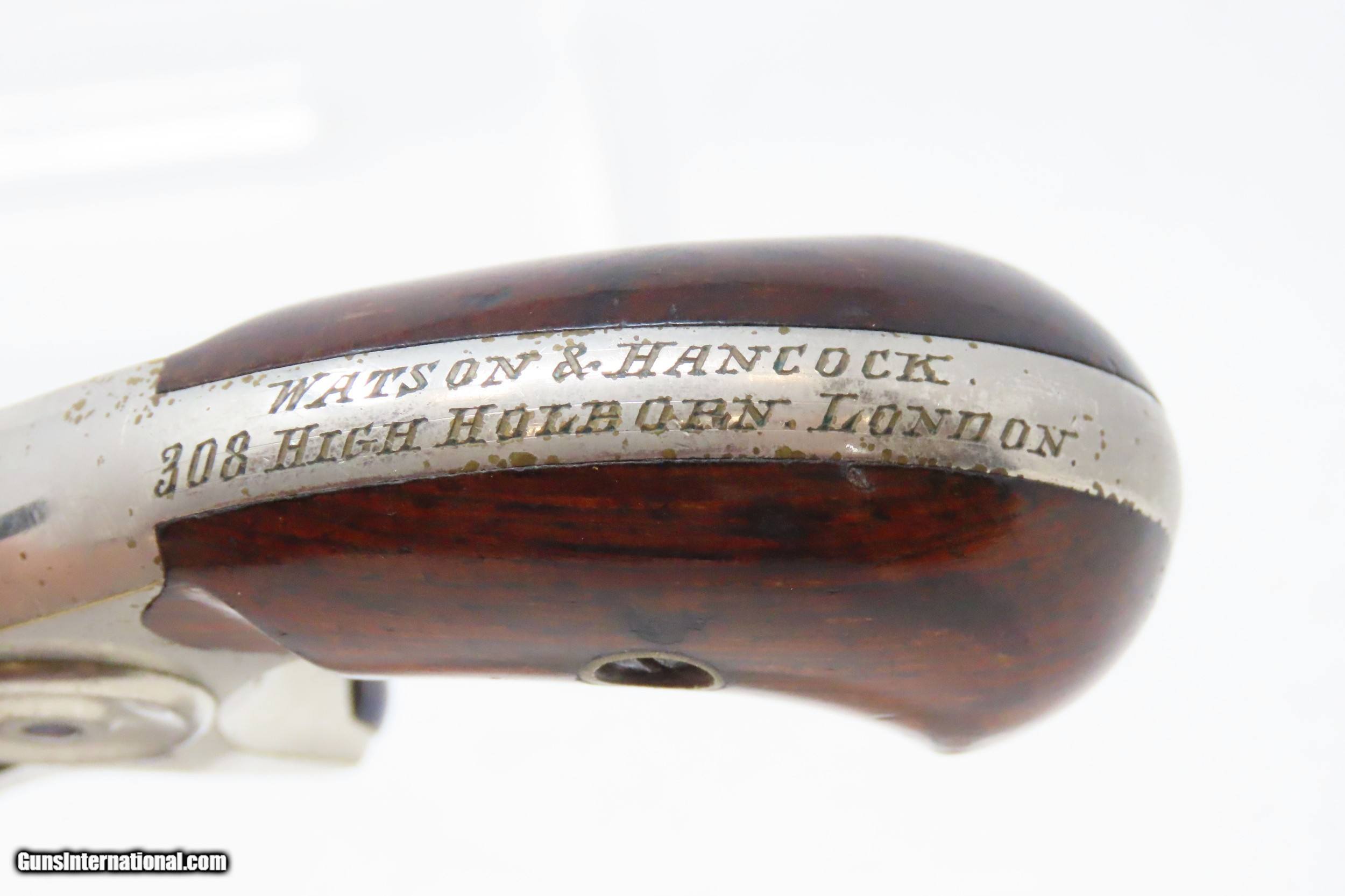 Description: LONDON RETAILER Marked Antique COLT “NEW LINE” .22 RF ETCHED PANEL Revolver Nickel Plated SELF DEFENSE Hideout Revolver Here we present an antique London Retailer Marked Etched Panel Colt New Line .22 Revolver, made in 1877 in Hartford, Connecticut. The New Line was a single action pocket revolver introduced by the Colt’s Patent Fire Arms Manufacturing Company in 1873 and continued through 1884, with the .22 caliber being manufactured between 1873 and 1877 with a total of roughly 55,343 being manufactured. Two years after the Colt House Revolver, a year after the Colt Open Top, and almost simultaneously alongside the Colt Peacemaker, the Colt New Line was one of the first metallic cartridge, rear-loading revolvers manufactured by Colt. It was designed to be a handy pocket-carry revolver, chambered in .22 rimfire, which was very popular for self-defense in those days. The revolver features 7 shots of .22 rimfire. Of all the Colt “New Line” revolvers made, the .22 caliber was the only one featuring a 7 shot cylinder. All other calibers utilized a 5-shot cylinder. Etched on the left side of the barrel is “COLT NEW 22”. The backstrap on this example is marked “WATSON & HANCOCK/308 HIGH HOLBORN/LONDON”. From Nigel Brow's British Gunmakers, they were at 313 High Holborn between 1868 to 1881. Then, 308 High Holborn between1882 to 1890. The overall condition is fine. Original nickel finish. Excellent action. The bore is in good condition. Legible markings. Numbers match. Both grips are seated firmly and remains solid. Own the original! This is a legitimate antique and not a reproduction. Barrel is 2-1/4 inches. Caliber: .22 Rimfire Overall condition as seen in photos. Very Fast. Very Safe. FREE SHIPPING WORLDWIDE. Delivered directly to your door by express mail! Guaranteed AUTHENTIC & Includes CERTIFICATE OF AUTHENTICITY. ancestryguns $1500 #227663 SOLD Antique: Yes |