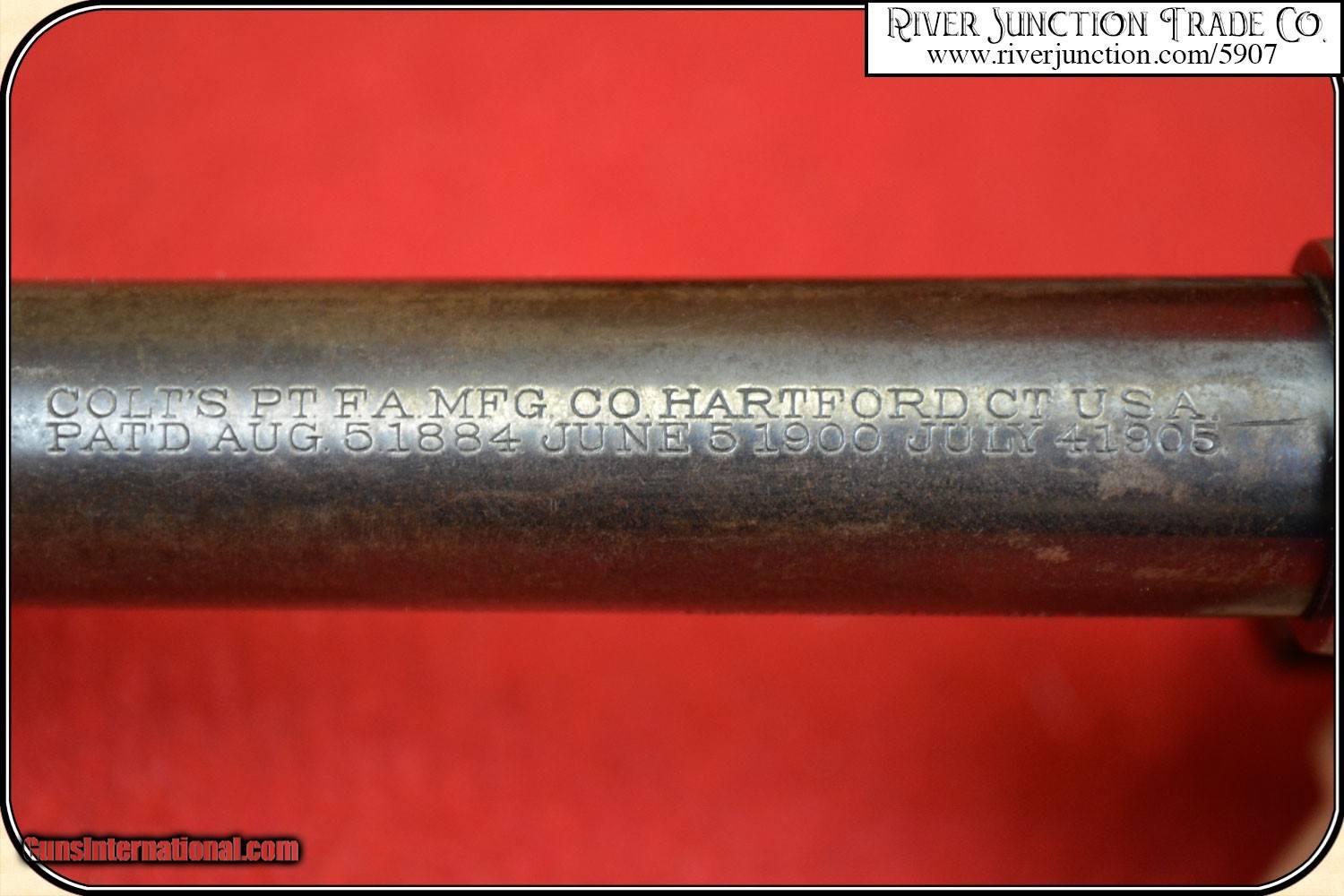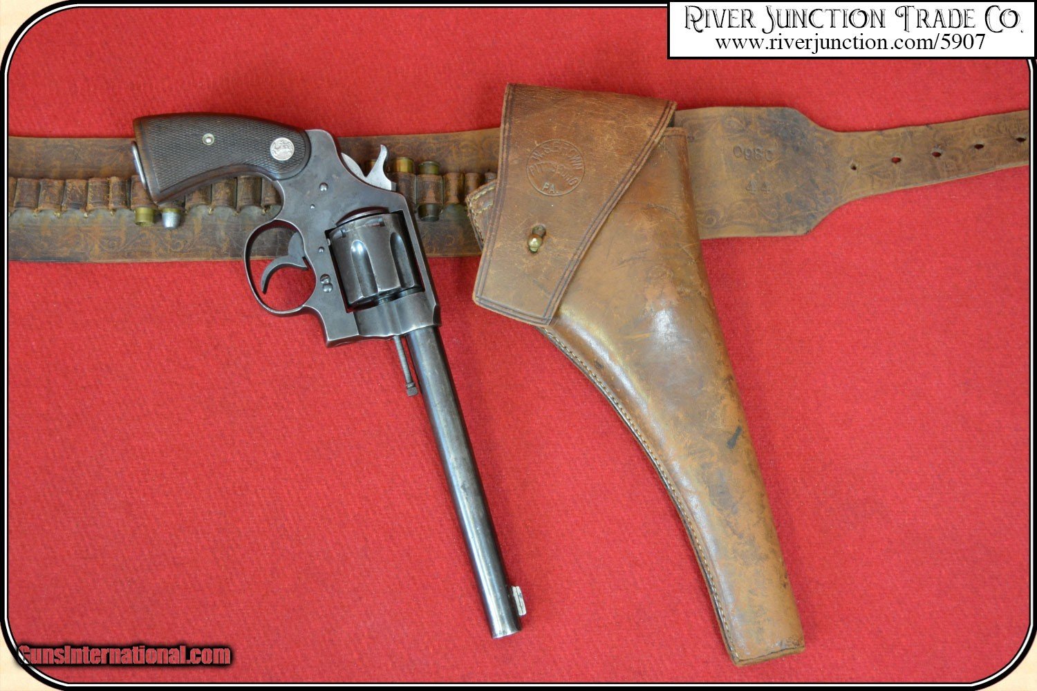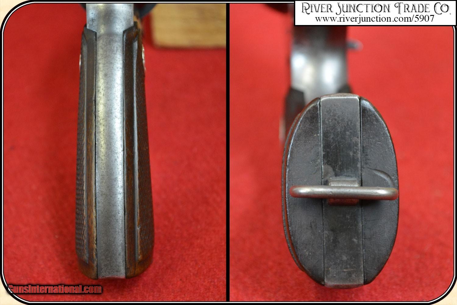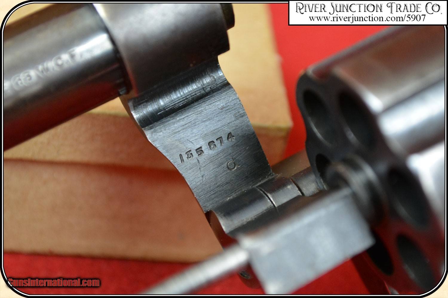 Description: "Colt New Service .38-40 caliber revolver. Manufactured 1917. Barrel length 7 ½". Bore is very good with bright and shinny deep sharp rifling. Action works perfectly. Gun has a good looking blue overall with no wear or pits. Gun has a fine pair of Colt Medallion checkered walnut grips in near perfect condition. These grips look great and are factory original to this gun and fit perfectly. Gun comes with what I believe is the holster originally purchased with the gun from W. S. Brown Guns & Revolvers, Fishing Tackle, Pittsburgh, Pa. W. S. Brown Guns & Revolvers, Fishing Tackle, offered All Kinds of Sporting Goods. By way of a little history, this is what I could find on the web: Brown & Hirth purchased the Enterprise Gun Works from James Brown in 1883. William S. Brown and August Hirth had a five year partnership. In 1887 Hirth retired from the company and W.S. Brown became the sole owner. A very colorful rig. The catalog cover shown is not included. This is considered a Curio & Relic firearm and can be shipped directly to you in the USA if you hold a C&R License, or you may choose to have it shipped to a Federal Firearms License (FFL) Dealer. A copy of that license must be provided via e-mail, before shipment can be made. We always answer questions and entertain offers. Payment: Item, can be ordered with a credit card or paypal on our sight . Just Google (riverjunction) and type in the River Junction Trade Co. item number (5907) in the search box. Before you checkout you will see shipping cost and total. OR If you prefer: Pay by cash, postal money order, cashiers check, personal & business checks. We wait for checks to clear. Have questions? Call me 563-880-4588. Jim SOLD Curio/Relic: Yes |